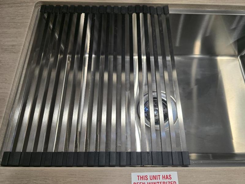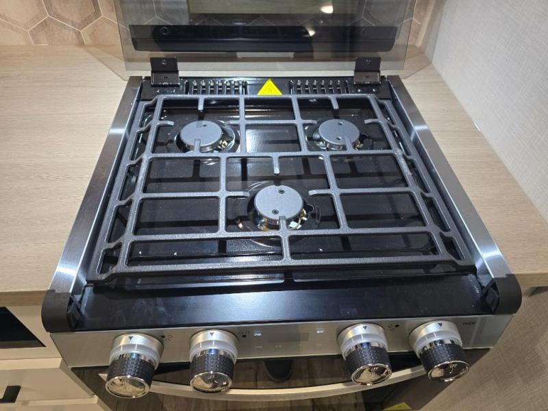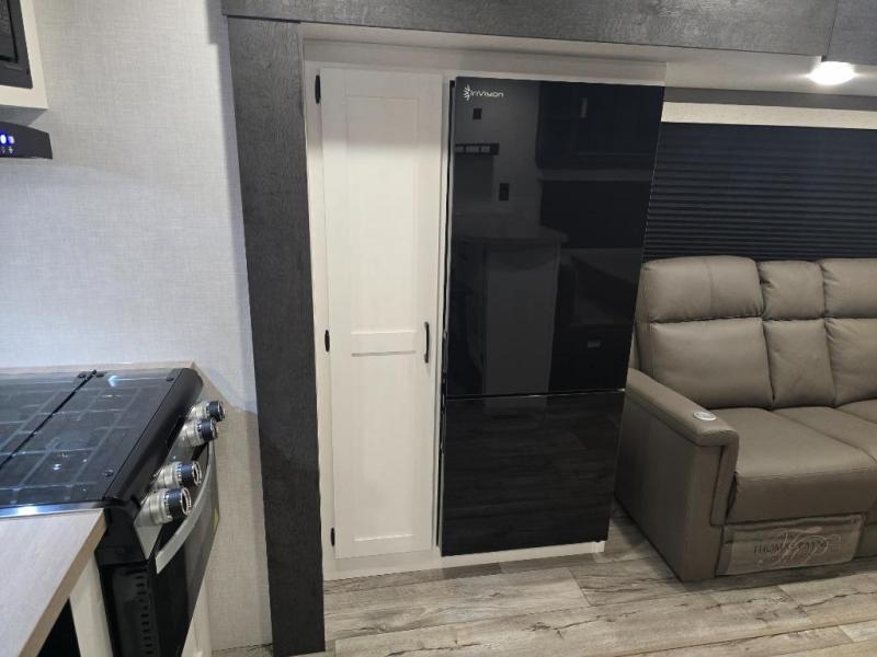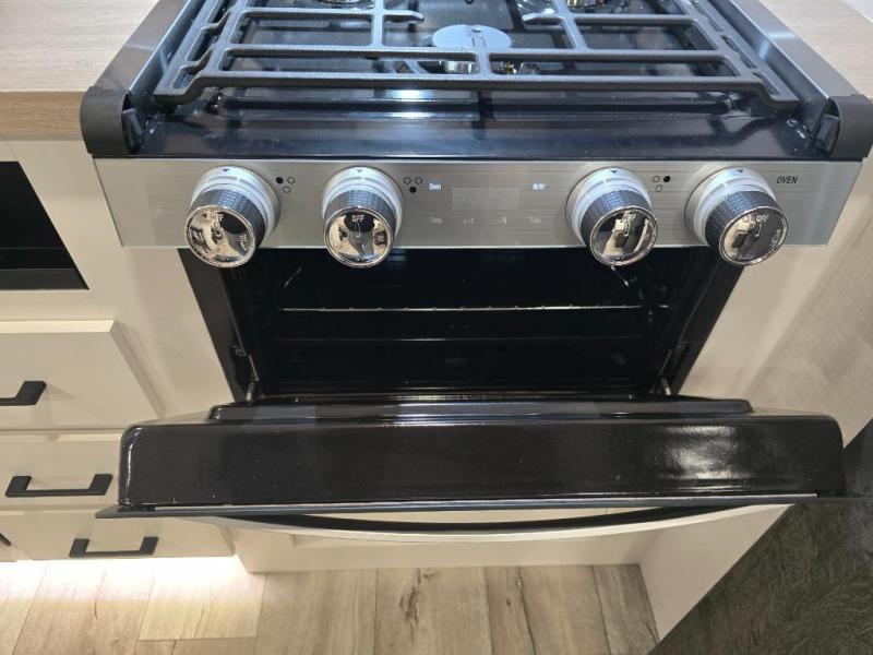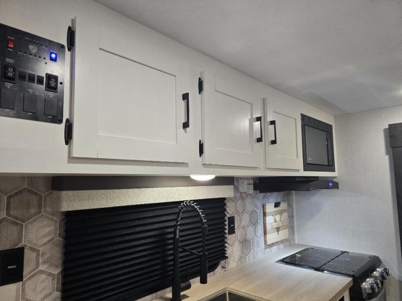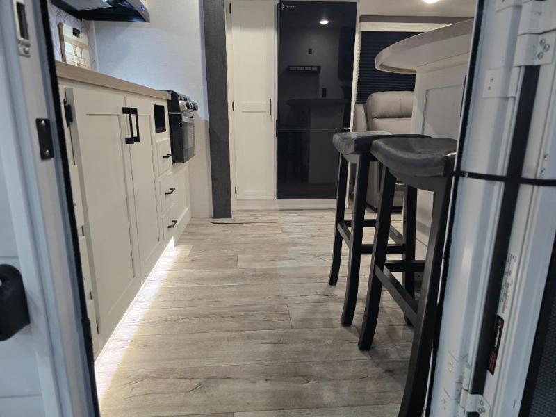 The rear kitchen layout is a chef’s dream on wheels. With generous counter space, a custom backsplash, and a clean, residential look, you’ll feel right at home while prepping meals. Whether you're whipping up breakfast before a hike or enjoying a cozy dinner indoors, the layout supports ease and efficiency.