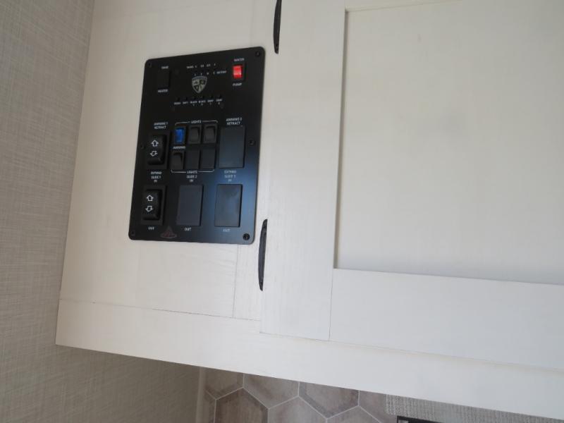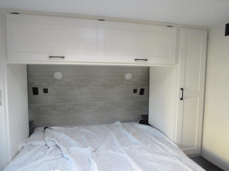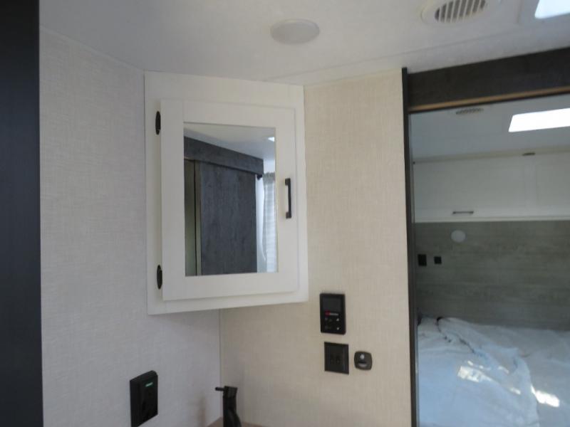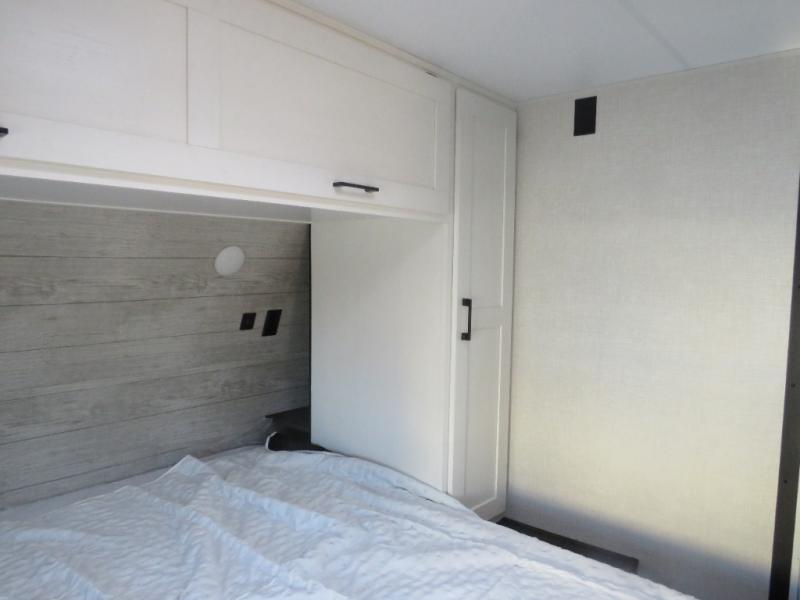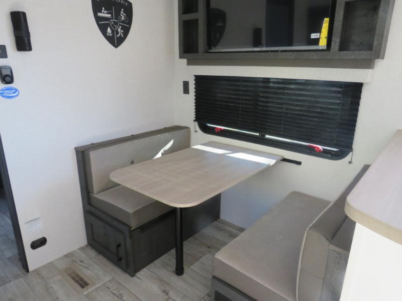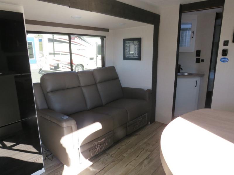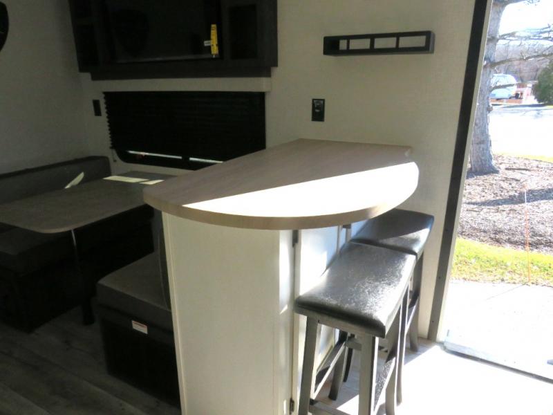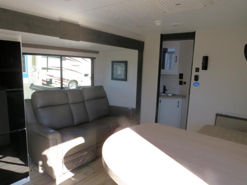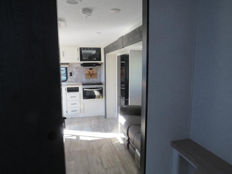 You'll love every minute spent in this dual entry travel trailer. The front master bedroom includes one of these doors, along with a Sleep Tight queen bed, dual wardrobes, and easy access into the walk-thru bath. Your crew can relax on the theater seating within the large slide out, play a game at the Sit N' Slide table with flipside reversible cushions, or dine at the bartop with stools. There is also a rear kitchen with ample counter space. Head outdoors to enjoy the 20' power awning in your camp chairs!