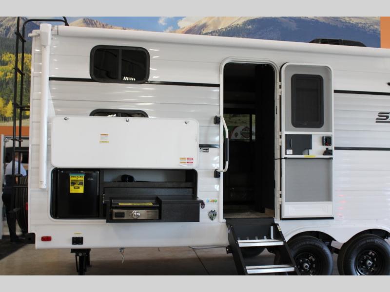You'll love every minute spent in this bunkhouse travel trailer. The front private bedroom includes a Sleep Tight queen bed, dual wardrobes, and TV prep if you want the option to watch movies in bed. Your crew can relax on the sofa or Sit N' Slide table within the large slide out and watch a movie with the Smart TV. Since there is an outdoor griddle and refrigerator plus a 20' power awning, you may just find yourselves outside most days! When it's time to call it a night, there are double-size bunks in the rear corner for your guests, and the full bath is right next to the bunks for easy nighttime use. This unit also includes an entryway pantry with washer and dryer prep, making it easier to go full-time if you choose!