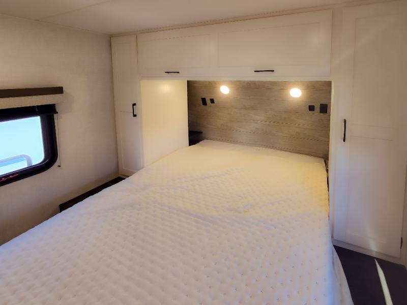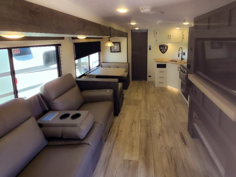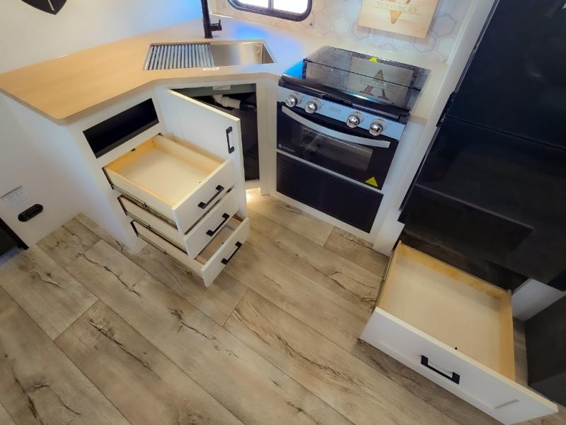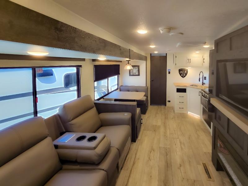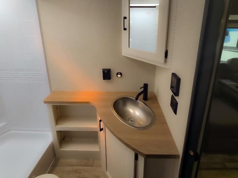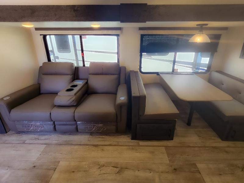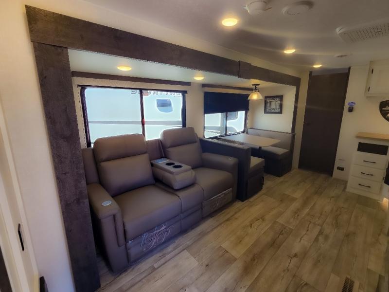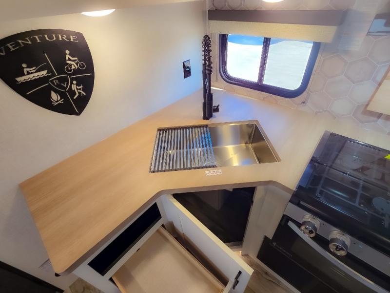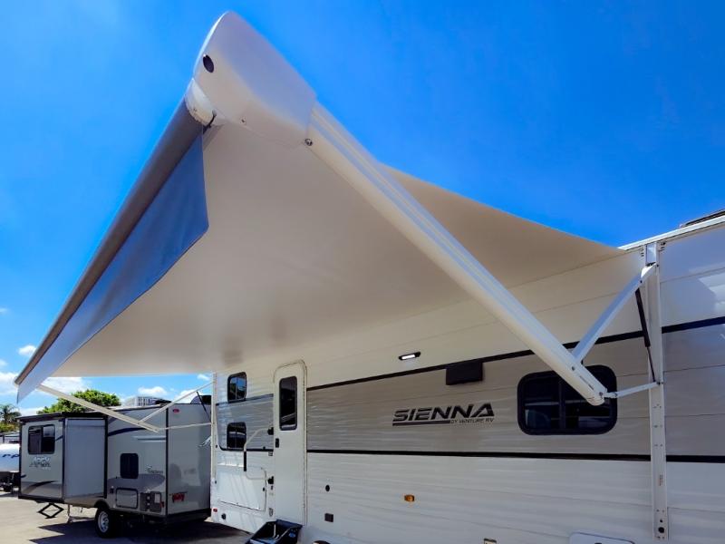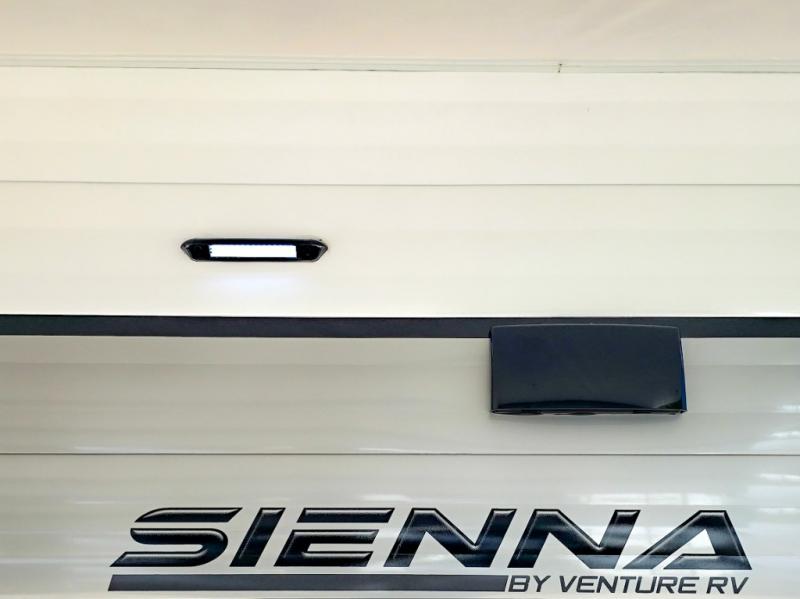 With any Sienna travel trailer by Venture RV, you will enjoy a lightweight unit, convenient amenities, and a durable construction that includes a BAL NXG-bolted frame. There is also a heated and enclosed one-piece underbelly, residential fiberglass insulation, and a reflective PVC roof membrane within the Weather-Shield Package to help extend your camping season. Outside, the BAL 5.0 power stabilizer jacks and power tongue jack will have you set up in no-time, and the Venture RV bottle opener/dog tie down will make it easy to bring your furry friends along. Head inside to enjoy the modern farmhouse design, along with Beauflor throughout with no carpet, custom backsplash, large underbed storage, and a bath skylight to name a few comforts!