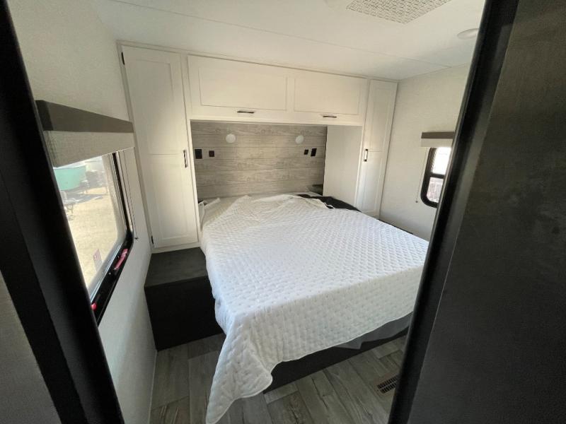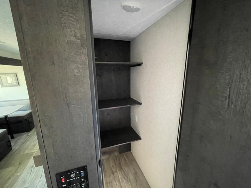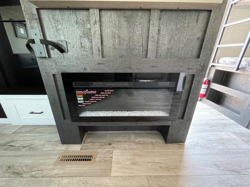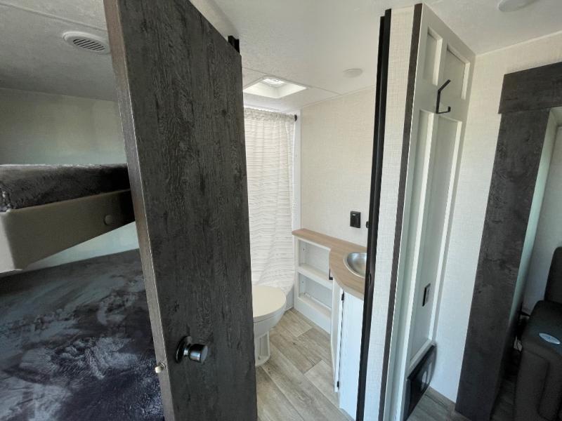 You'll love every minute spent in this bunkhouse travel trailer. The front private bedroom includes a Sleep Tight queen bed, dual wardrobes, and TV prep if you want the option to watch movies in bed. Your crew can relax on the sofa or Sit N' Slide table within the large slide out and watch a movie with the Smart TV. Since there is an outdoor griddle and refrigerator plus a 20' power awning, you may just find yourselves outside most days! When it's time to call it a night, there are double-size bunks in the rear corner for your guests, and the full bath is right next to the bunks for easy nighttime use. This unit also includes an entryway pantry with washer and dryer prep, making it easier to go full-time if you choose!