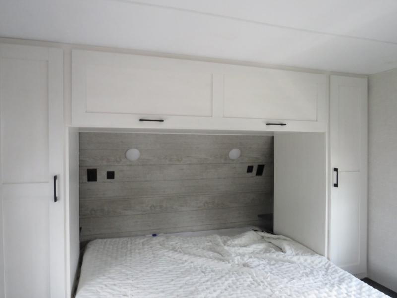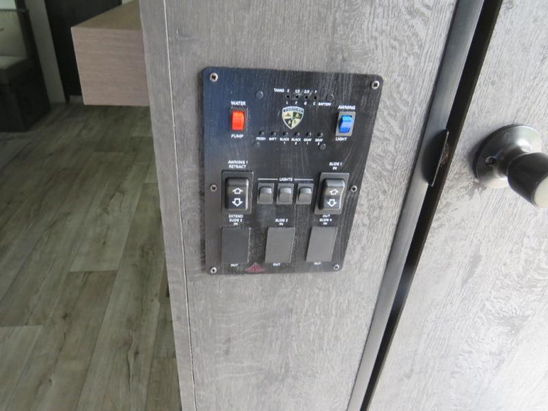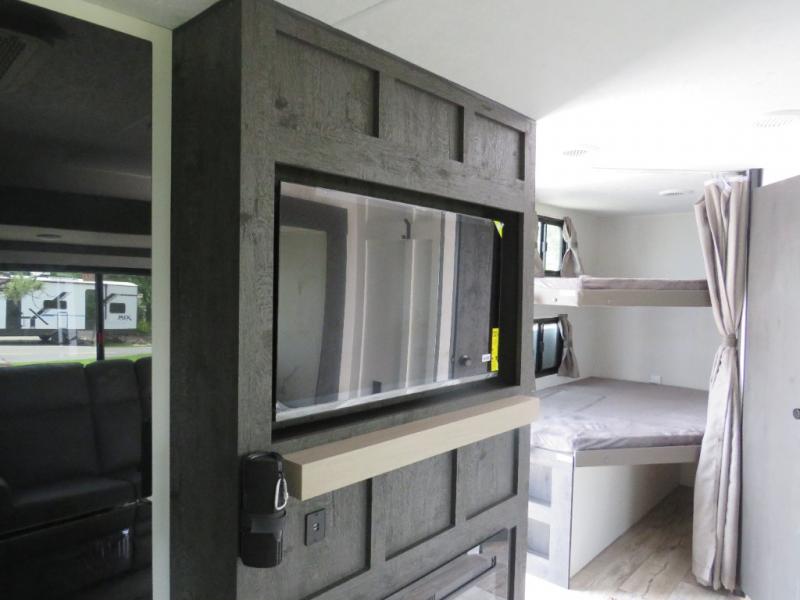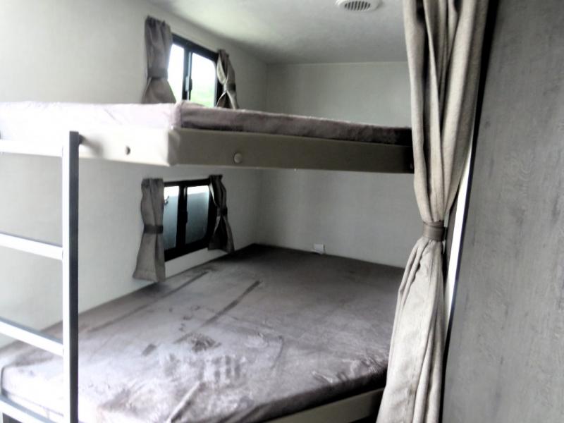 You'll love every minute spent in this bunkhouse travel trailer. The front private bedroom includes a Sleep Tight queen bed, dual wardrobes, and TV prep if you want the option to watch movies in bed. Your crew can relax on the sofa or Sit N' Slide table within the large slide out and watch a movie with the Smart TV. Since there is an outdoor griddle and refrigerator plus a 20' power awning, you may just find yourselves outside most days! When it's time to call it a night, there are double-size bunks in the rear corner for your guests, and the full bath is right next to the bunks for easy nighttime use. This unit also includes an entryway pantry with washer and dryer prep, making it easier to go full-time if you choose!