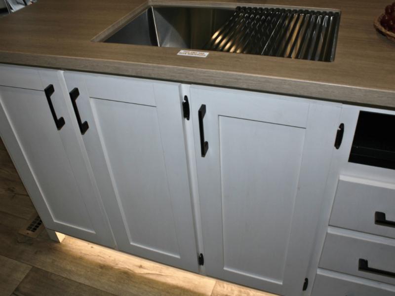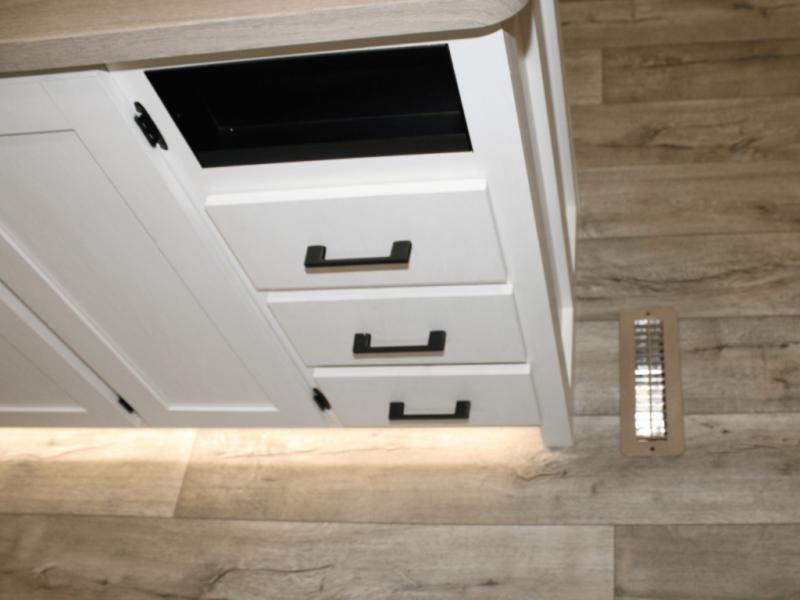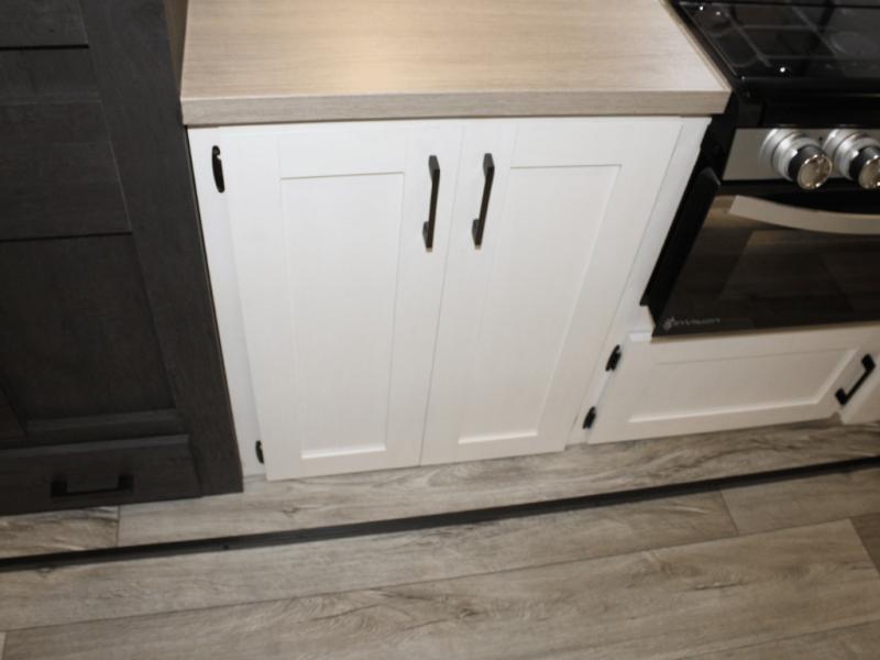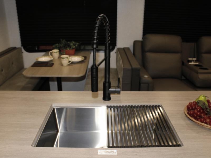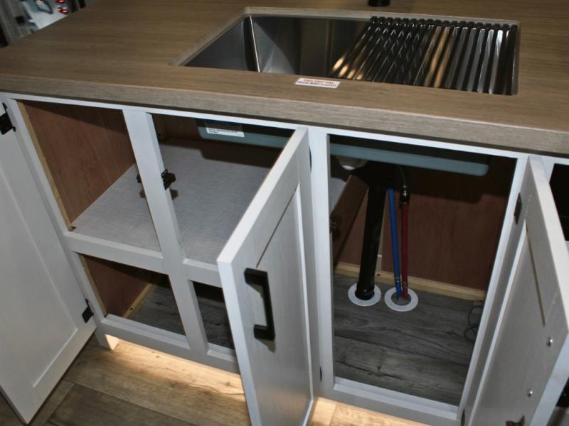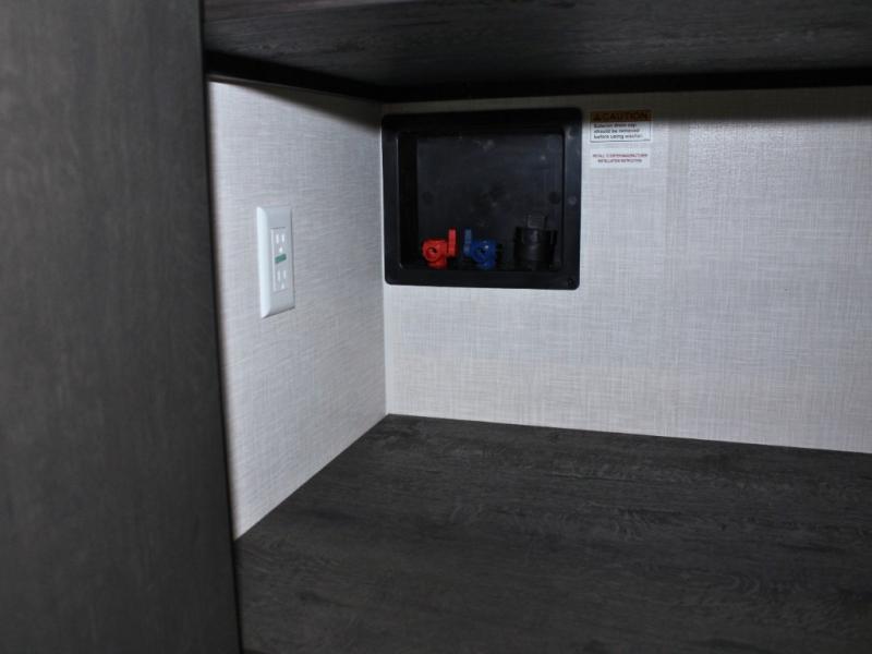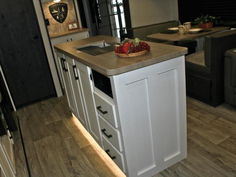Functional Kitchen with Island: The center kitchen island offers added prep space and storage, while the layout includes two pantries, one with washer/dryer prep so you can camp in comfort for weeks at a time.
