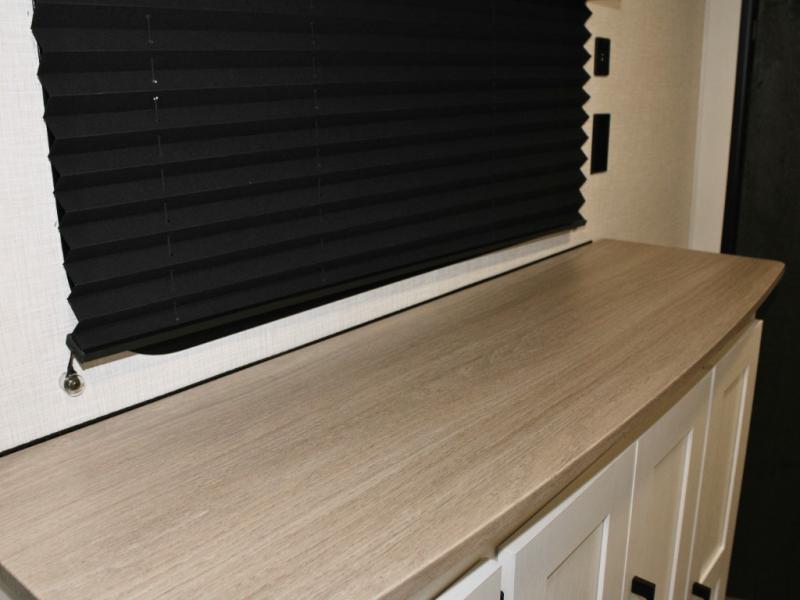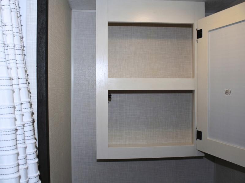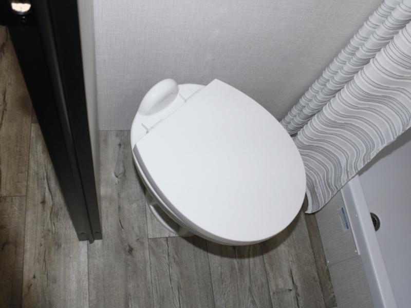 Full Bathroom Convenience: Forget the campground restrooms—this trailer includes a spacious full bath with a skylight, large shower, and room for all your essentials.