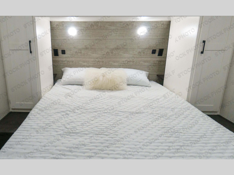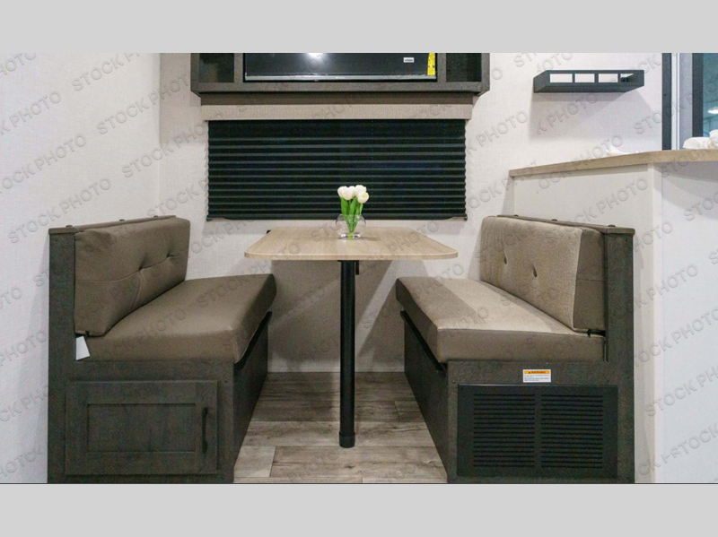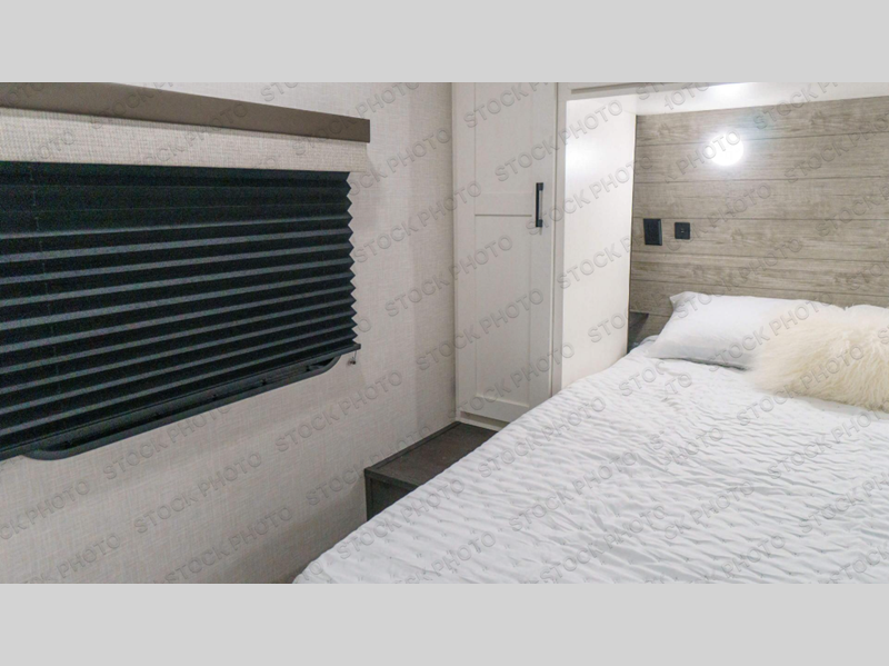 You'll love every minute spent in this dual entry travel trailer. The front master bedroom includes one of these doors, along with a Sleep Tight queen bed, dual wardrobes, and easy access into the walk-thru bath. Your crew can relax on the theater seating within the large slide out, play a game at the Sit N' Slide table with flipside reversible cushions, or dine at the bartop with stools. There is also a rear kitchen with ample counter space. Head outdoors to enjoy the 20' power awning in your camp chairs!