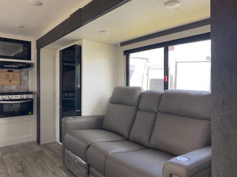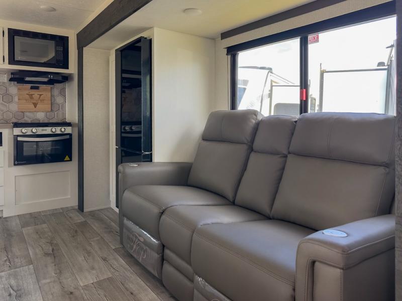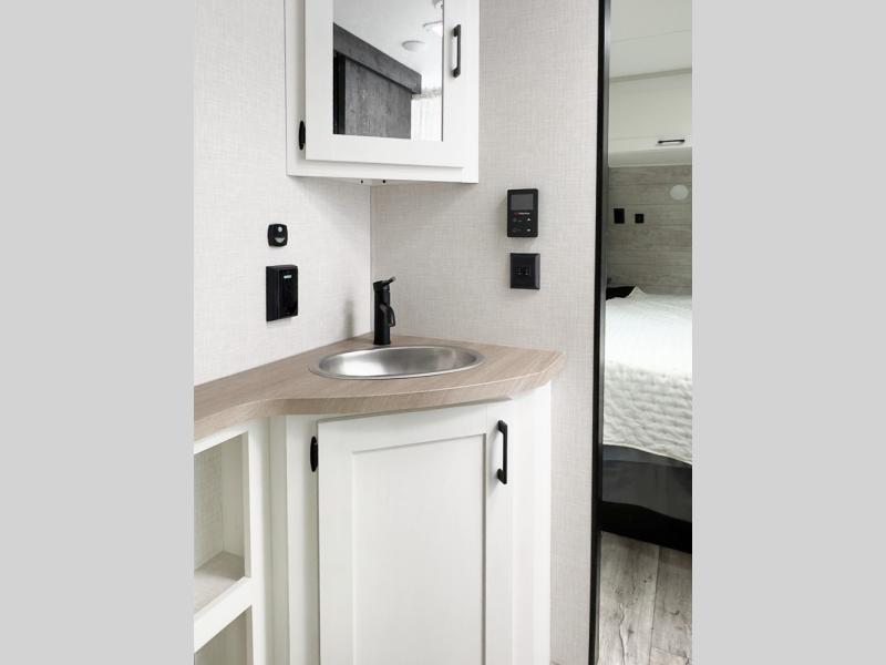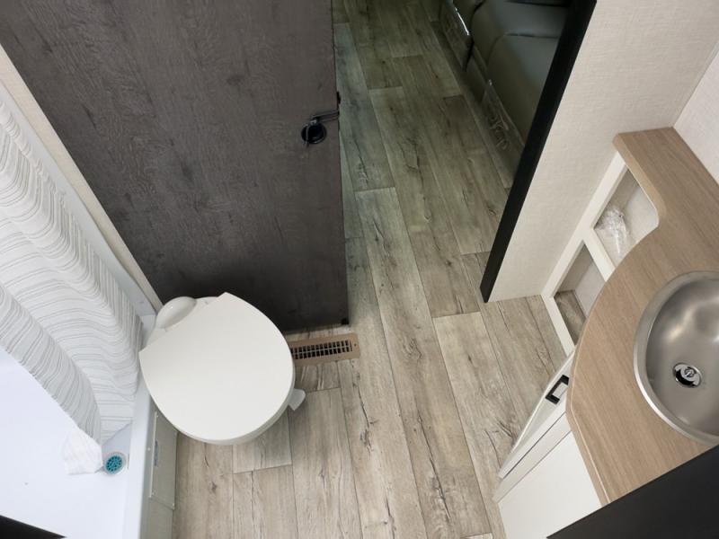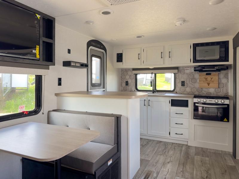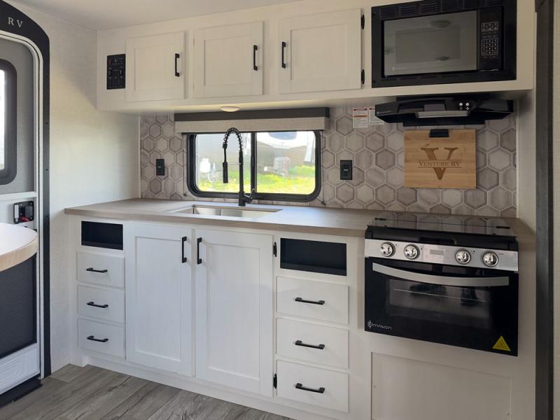 With any Sienna travel trailer by Venture RV, you will enjoy a lightweight unit, convenient amenities, and a durable construction that includes a BAL NXG-bolted frame. There is also a heated and enclosed one-piece underbelly, residential fiberglass insulation, and a reflective PVC roof membrane within the Weather-Shield Package to help extend your camping season. Outside, the BAL 5.0 power stabilizer jacks and power tongue jack will have you set up in no-time, and the Venture RV bottle opener/dog tie down will make it easy to bring your furry friends along. Head inside to enjoy the modern farmhouse design, along with Beauflor throughout with no carpet, custom backsplash, large underbed storage, and a bath skylight to name a few comforts!