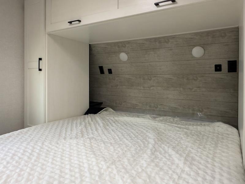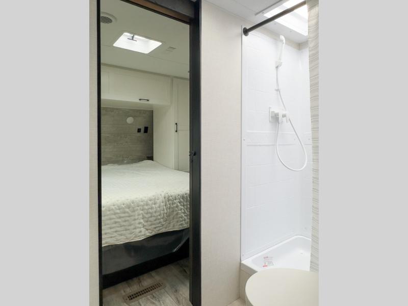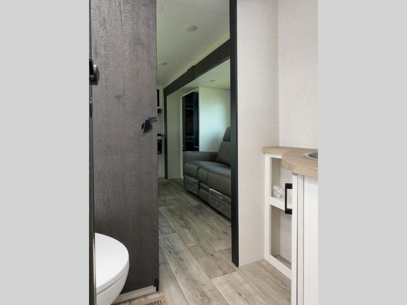 You'll love every minute spent in this dual entry travel trailer. The front master bedroom includes one of these doors, along with a Sleep Tight queen bed, dual wardrobes, and easy access into the walk-thru bath. Your crew can relax on the theater seating within the large slide out, play a game at the Sit N' Slide table with flipside reversible cushions, or dine at the bartop with stools. There is also a rear kitchen with ample counter space. Head outdoors to enjoy the 20' power awning in your camp chairs!
