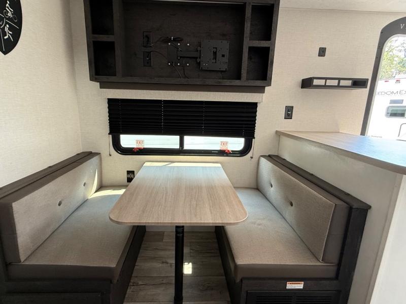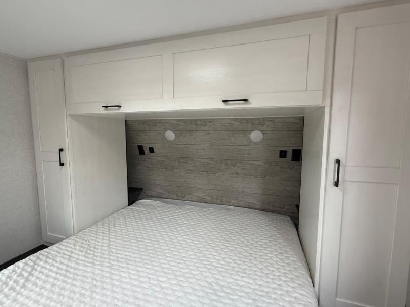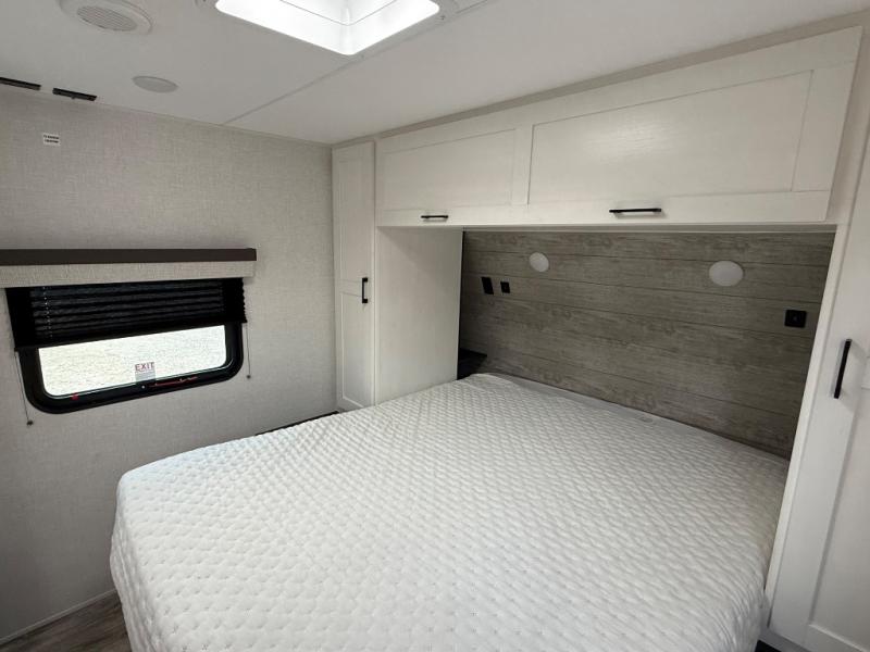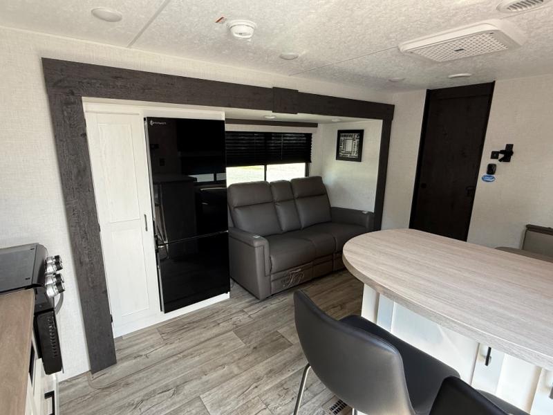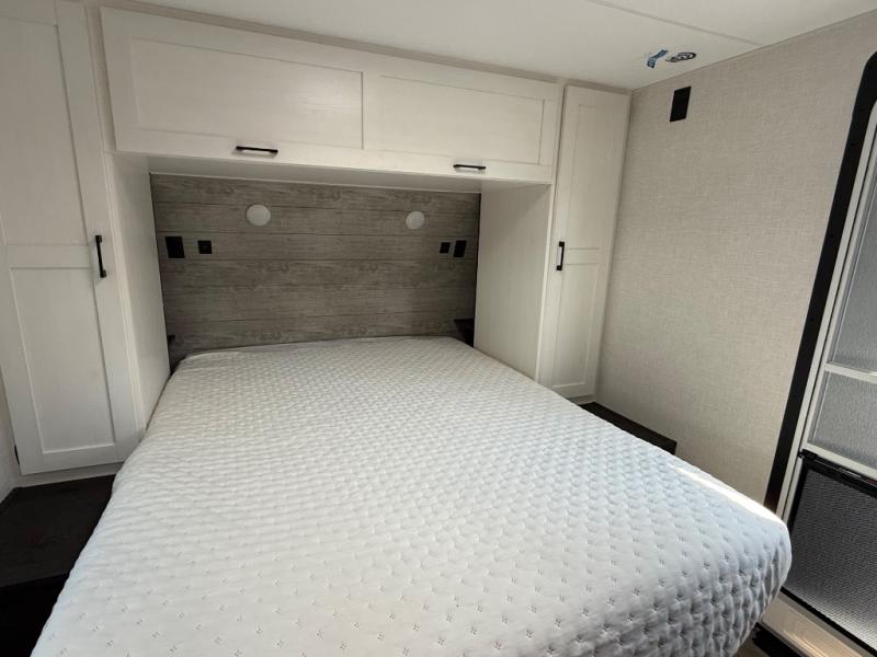 You'll love every minute spent in this dual entry travel trailer. The front master bedroom includes one of these doors, along with a Sleep Tight queen bed, dual wardrobes, and easy access into the walk-thru bath. Your crew can relax on the theater seating within the large slide out, play a game at the Sit N' Slide table with flipside reversible cushions, or dine at the bar top with stools. There is also a rear kitchen with ample counter space. Head outdoors to enjoy the 20' power awning in your camp chairs!