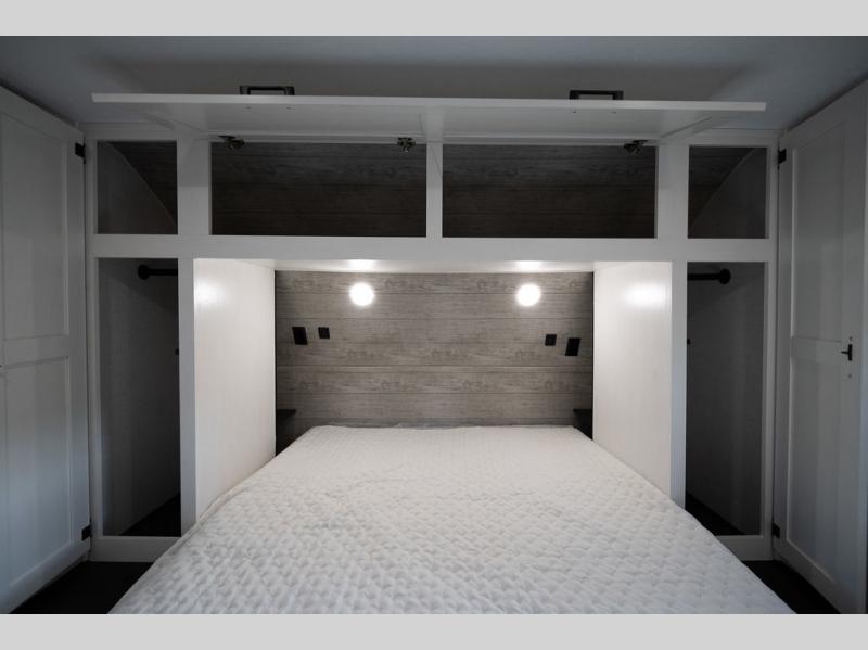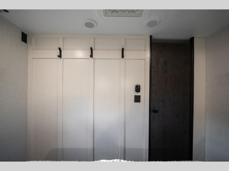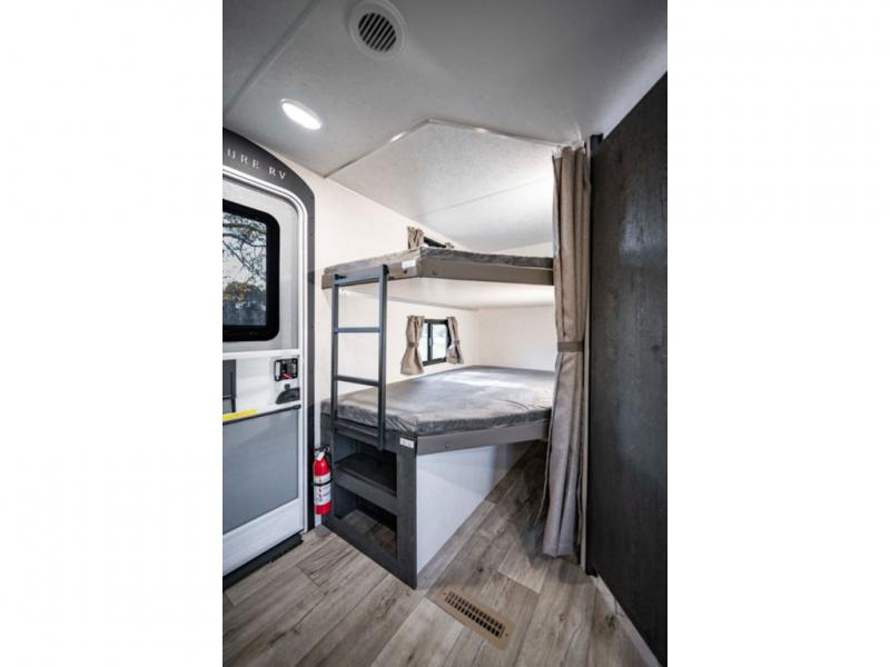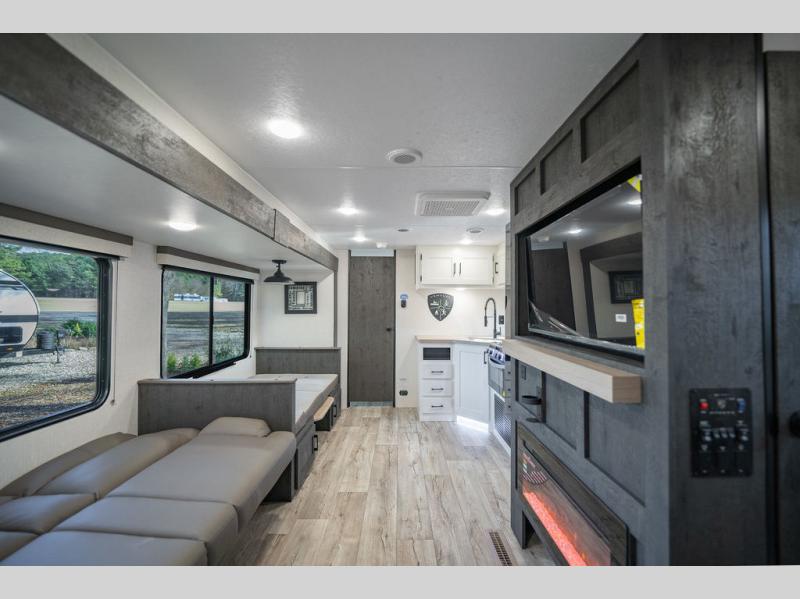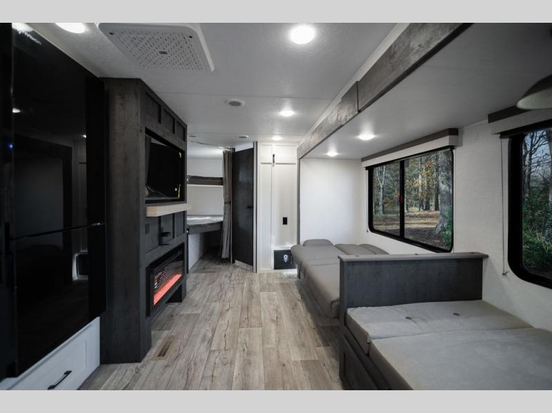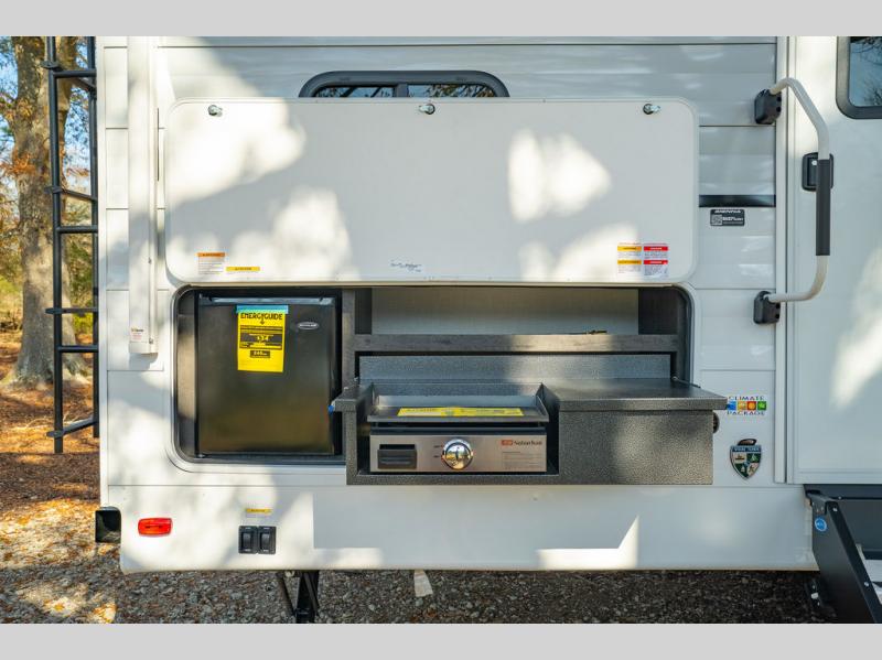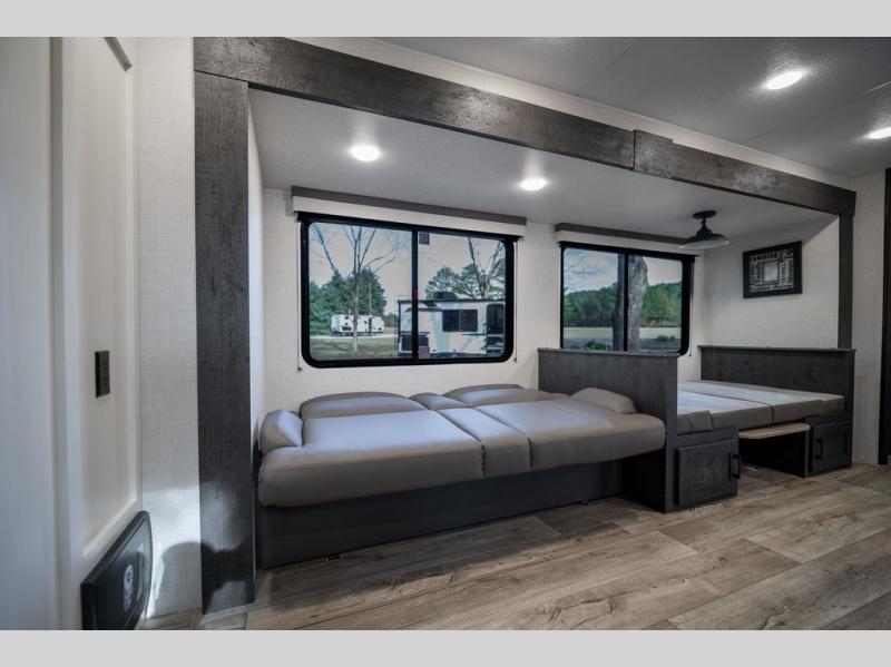 You'll love every minute spent in this bunkhouse travel trailer. The front private bedroom includes a Sleep Tight queen bed, dual wardrobes, and TV prep if you want the option to watch movies in bed. Your crew can relax on the sofa or Sit N' Slide table within the large slide out and watch a movie with the Smart TV. Since there is an outdoor griddle and refrigerator plus a 20' power awning, you may just find yourselves outside most days! When it's time to call it a night, there are double-size bunks in the rear corner for your guests, and the full bath is right next to the bunks for easy nighttime use. This unit also includes an entryway pantry with washer and dryer prep, making it easier to go full-time if you choose!