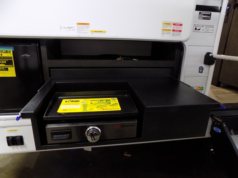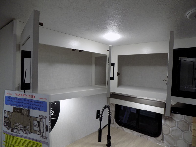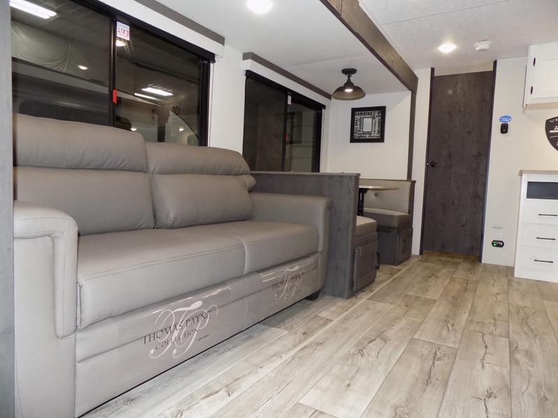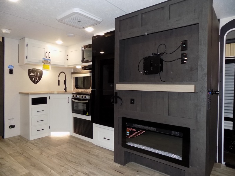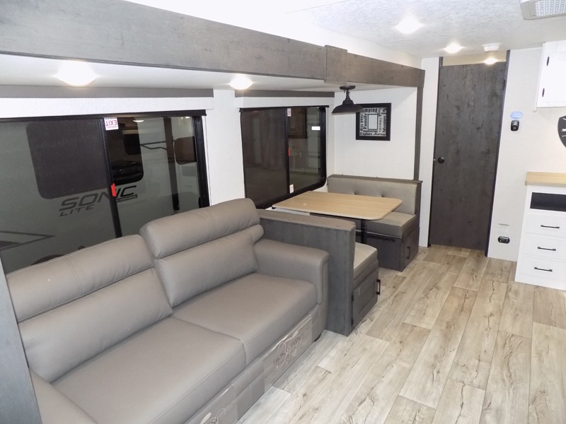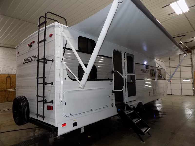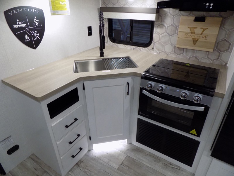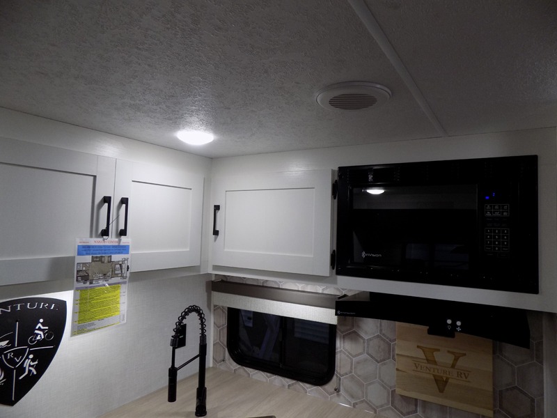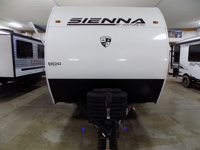 With any Sienna travel trailer by Venture RV, you will enjoy a lightweight unit, convenient amenities, and a durable construction that includes a BAL NXG-bolted frame. There is also a heated and enclosed one-piece underbelly, residential fiberglass insulation, and a reflective PVC roof membrane within the Weather-Shield Package to help extend your camping season. Outside, the BAL 5.0 power stabilizer jacks and power tongue jack will have you set up in no-time, and the Venture RV bottle opener/dog tie down will make it easy to bring your furry friends along. Head inside to enjoy the modern farmhouse design, along with Beauflor throughout with no carpet, custom backsplash, large underbed storage, and a bath skylight to name a few comforts!
