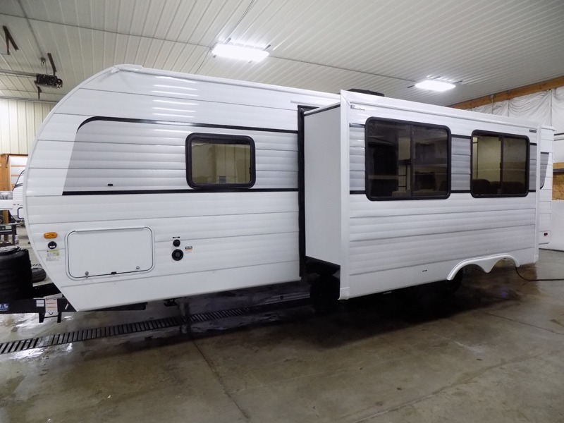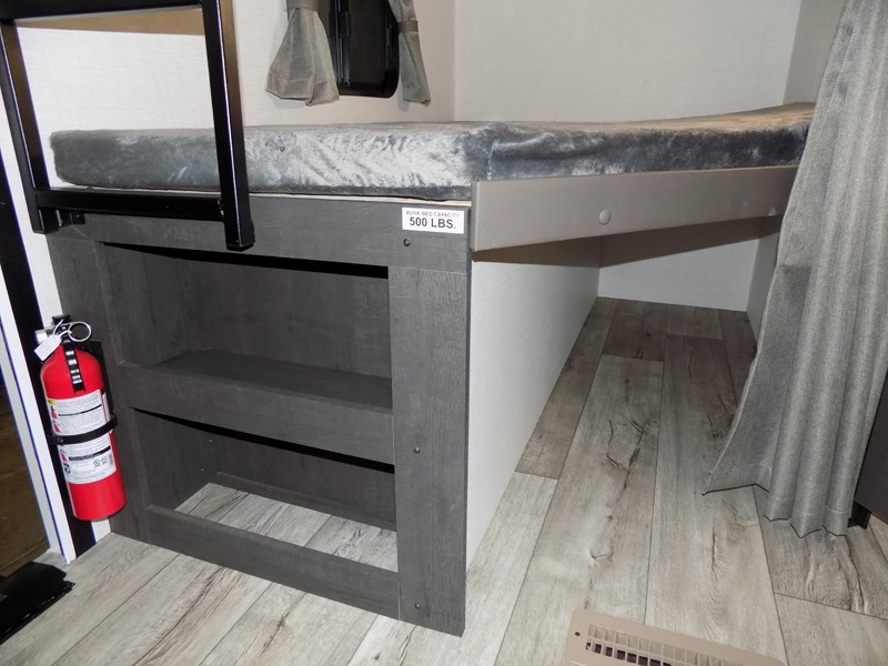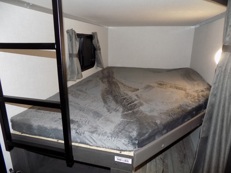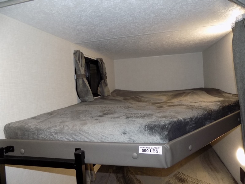 You'll love every minute spent in this bunkhouse travel trailer. The front private bedroom includes a Sleep Tight queen bed, dual wardrobes, and TV prep if you want the option to watch movies in bed. Your crew can relax on the sofa or Sit N' Slide table within the large slide out and watch a movie with the Smart TV. Since there is an outdoor griddle and refrigerator plus a 20' power awning, you may just find yourselves outside most days! When it's time to call it a night, there are double-size bunks in the rear corner for your guests, and the full bath is right next to the bunks for easy nighttime use. This unit also includes an entryway pantry with washer and dryer prep, making it easier to go full-time if you choose!