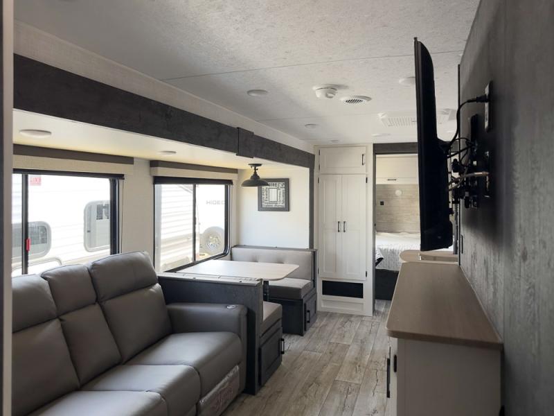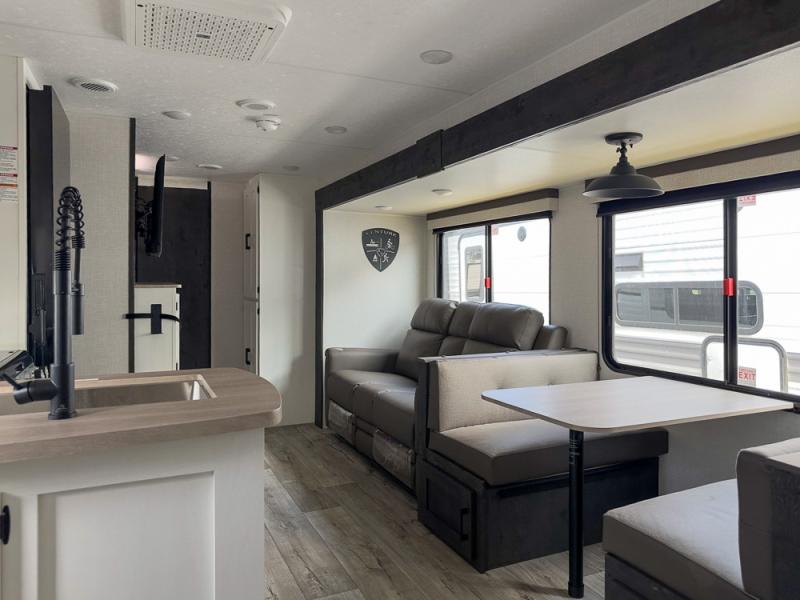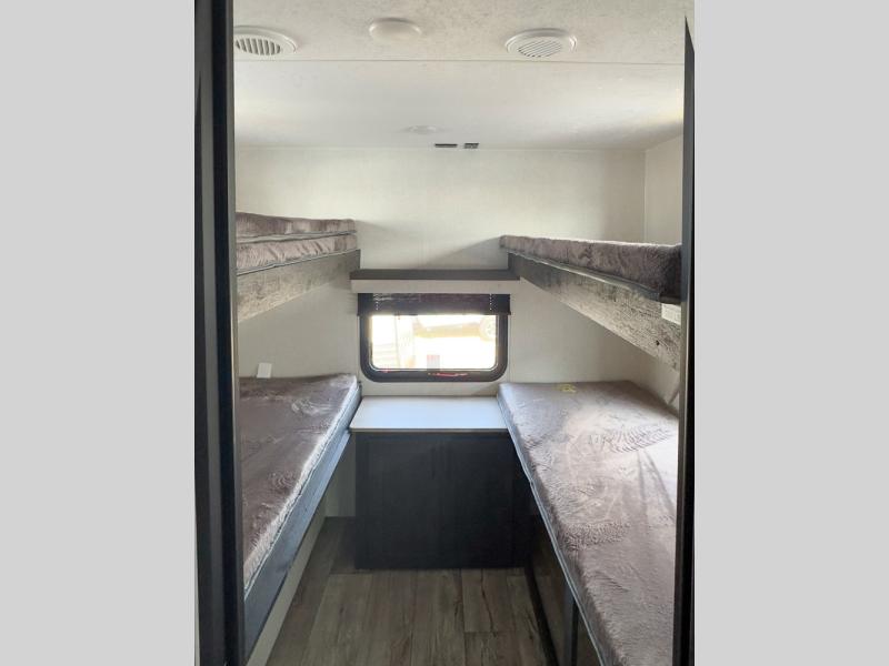 You'll love every minute spent in this spacious travel trailer with a rear private bunkhouse. There are two sets of bunk beds here, and the bottom bunks convert into a king-size bed, giving you options how you want to set up this space. The front private bedroom includes a Sleep Tight queen bed, dual wardrobes, and sliding doors that will help save on space. Your crew can relax on the 70" sofa or Sit N' Slide table within the large slide out and watch a movie with the Smart TV. Since there is an outdoor griddle and refrigerator plus a 20' power awning, you may just find yourselves outside most days!