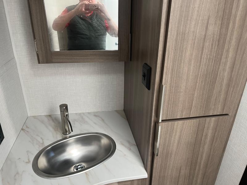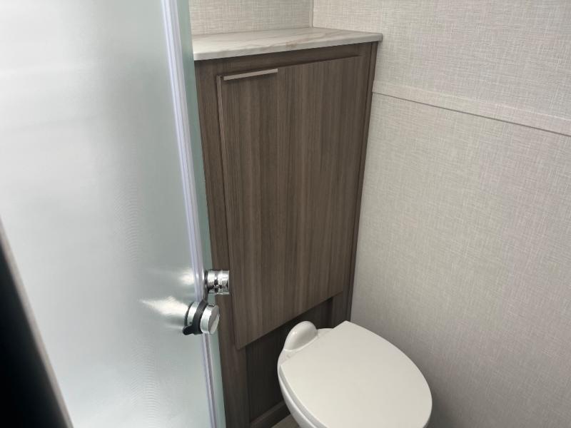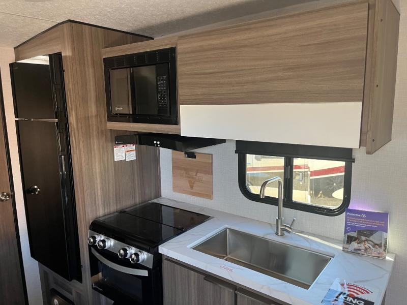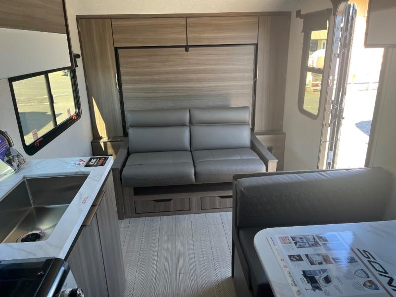 This versatile travel trailer gives you a sofa during the daytime to relax on up front and a Murphy bed to easily setup at night. There are dual wardrobes for your clothing, StorMore bedside nightstands with a 110V outlet and USB charging for your cellphones and such, and a rear full bathroom with linen storage in two places, a 34" radius shower, and medicine cabinet for more items. The galley kitchen offers appliances to make warm meals and store leftovers, and the booth dinette on the opposite side provides dining inside plus a sleeping space at night. Your outdoor gear can be placed in the pass-through compartment along the exterior, and you can always relax under the 13' power awning before and after the day's activities.