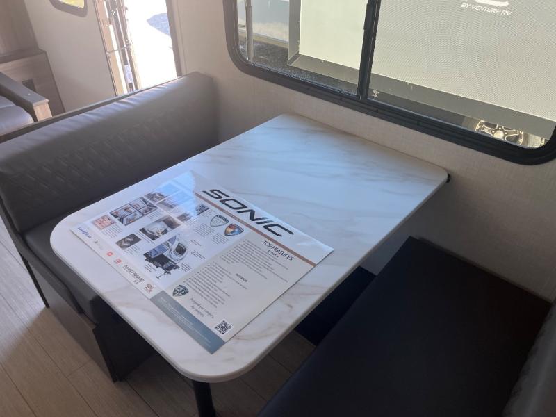 With any Sonic travel trailer by Venture RV, you begin with Next Generation in RV frame technology with the NXG Huck-bolt frame, AZDEL Onboard composite panels, tongue and groove plywood floor decking, radiant foil bubble insulation-wrapped tanks, 360-degree residential fiberglass insulation and radiant foil insulation, plus a forced-air heated and enclosed underbelly which is part of the Weather-Shield package. There is a Highway Package that comes mandatory, and the Fall Package 1.6 provides a motion light in the bathroom, a dish drying sink cover, a power tongue jack, and WIFI prep to mention a few features. Get ready for comfort and style in a Sonic ultra-lightweight, tandem-axle travel trailer of your choice!