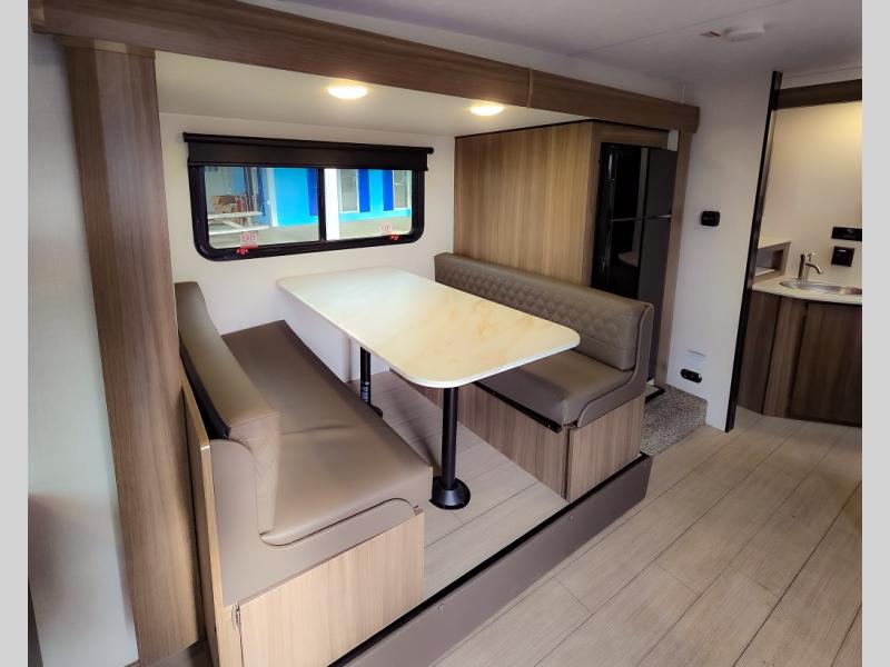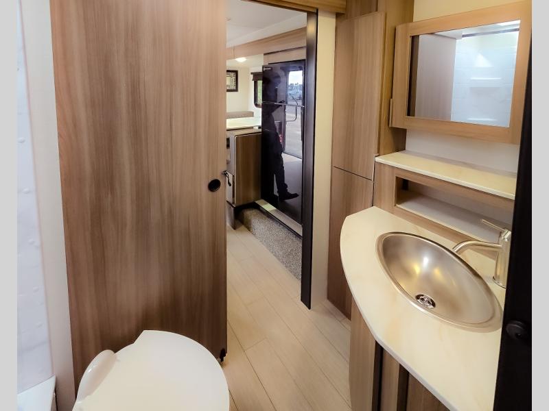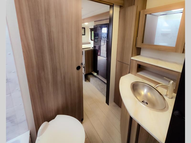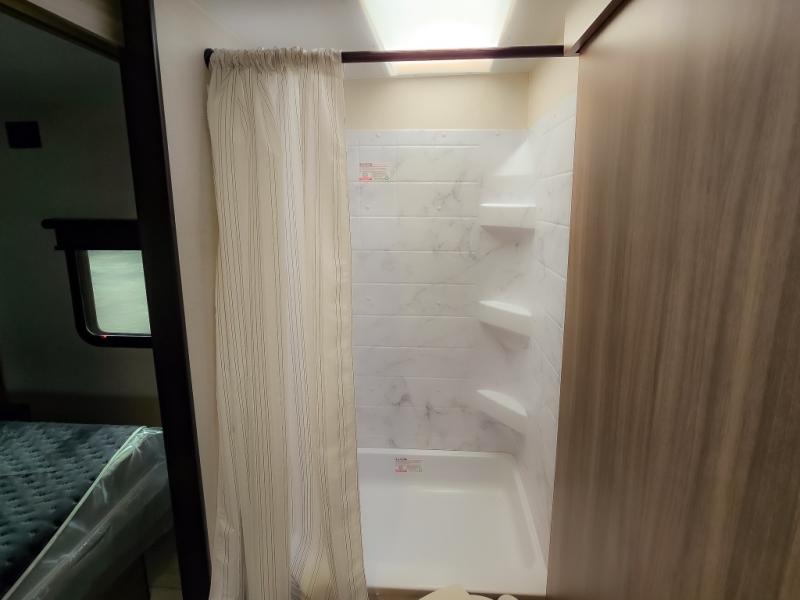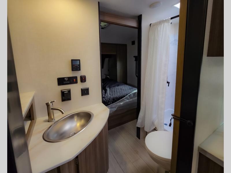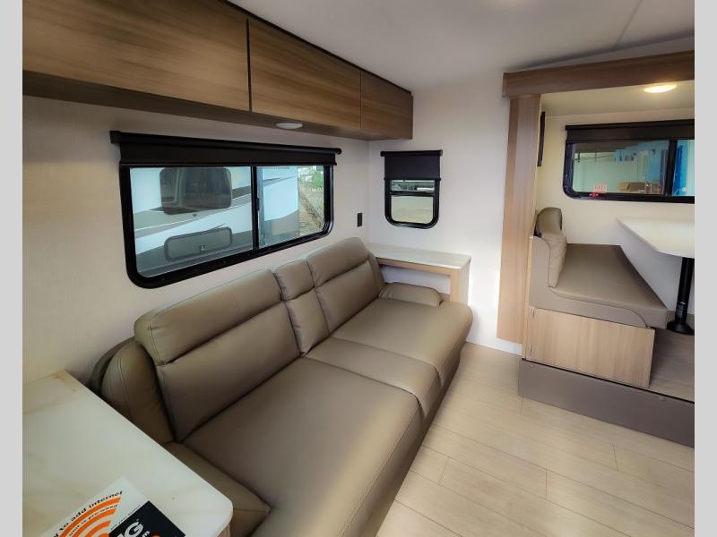 Looking for privacy when you camp? Do you enjoy dining at a booth dinette when you are staying in an RV? This Sonic provides all of that plus more! Starting with the private bedroom with an RV queen bed, StorMore bedside nightstands with a 110V outlet and USB charging to keep the electronics ready, dual wardrobes, and access to the walk-through bathroom through a space savings sliding door. The second entry to the walk-through bath is in the main living and kitchen area where you will find a booth dinette and an 8 cu. ft. refrigerator, an L-shaped countertop with a large sink and kitchen amenities, plus an entertainment center and a 64" jiffy sofa. And the furniture doubles as extra sleeping space when needed. Don't forget about the 17' power awning offering an outdoor living area, just add your camp chairs.
