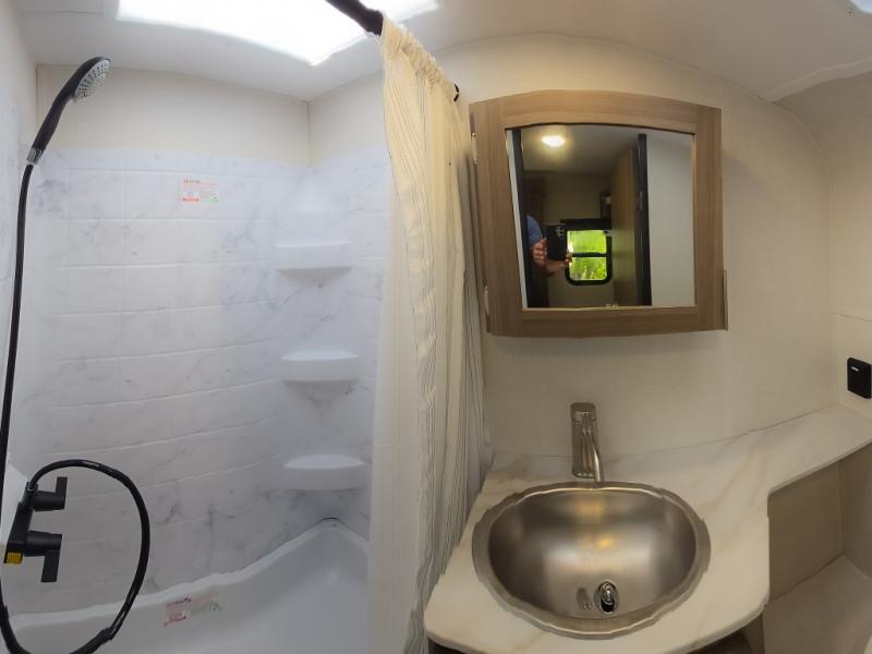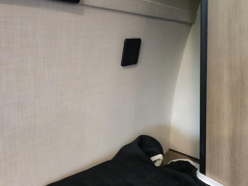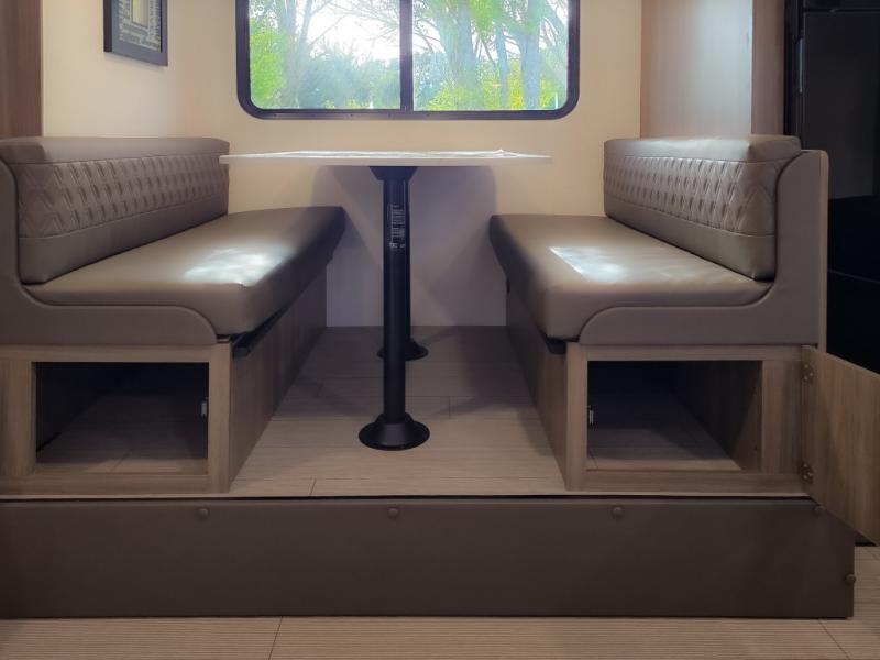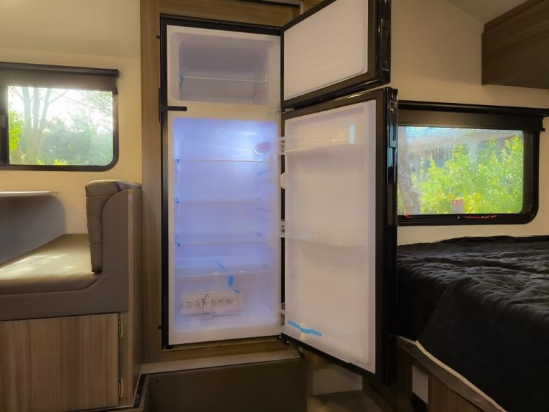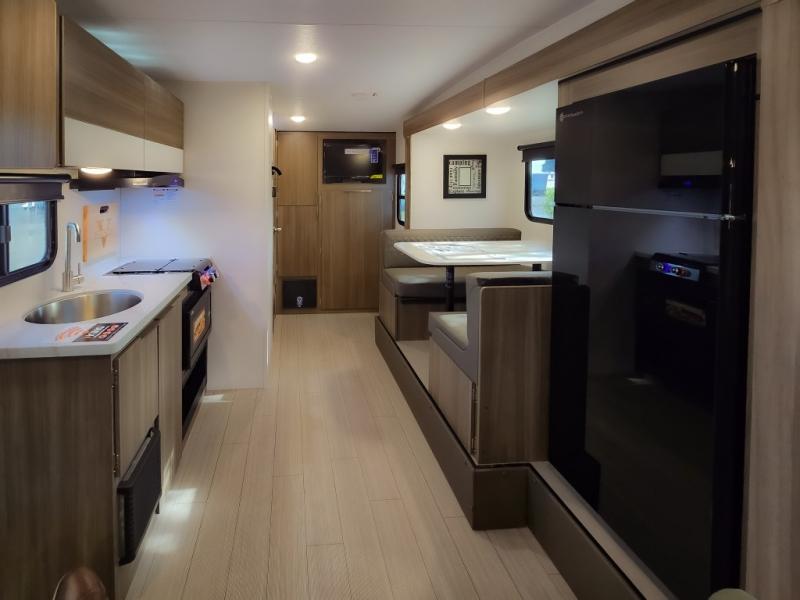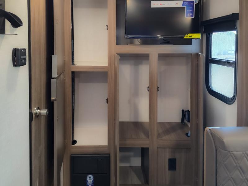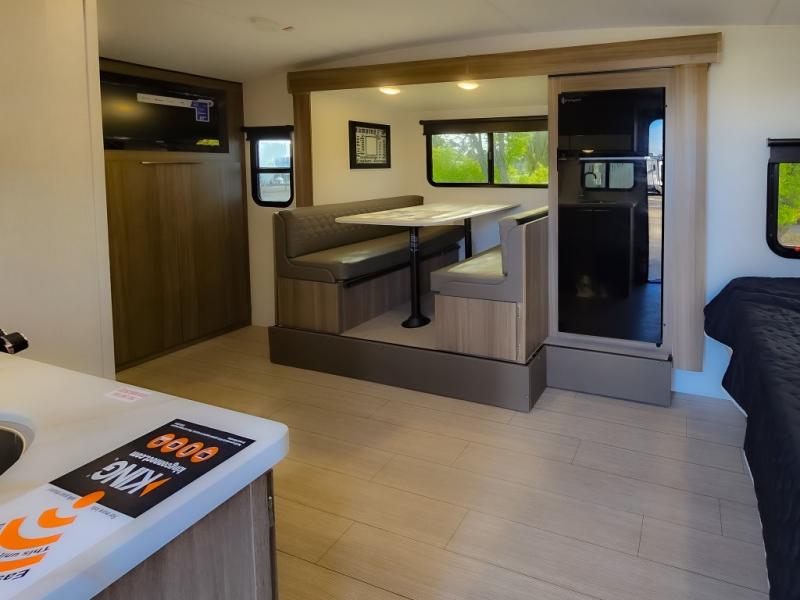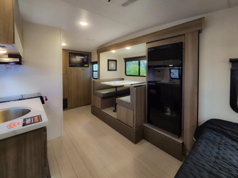 Cook, relax, sleep, and do it all again after your hike, play games and visit with other RVers! This trailer is perfect for a quick trip or a long vacation with sleeping space for three to four when you utilize the booth dinette. There is a 60" x 75" bed up front for two to easily fall asleep and includes a side wardrobe and overhead cabinet for your belongings. In the morning, the cook can use the two burner cooktop and convection microwave to whip up breakfast for you to enjoy under the 12' power awning after grabbing your camping chairs from the pass-through storage that has a motion-activated light which is helpful in the dark. You will also appreciate the full bathroom amenities, the pantry for your goodies and the entertainment center.