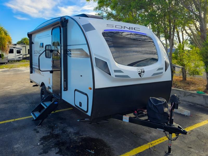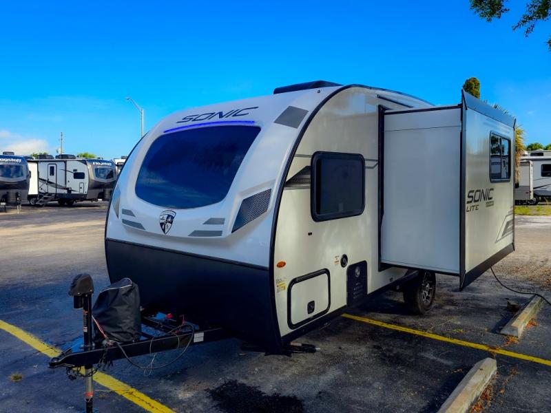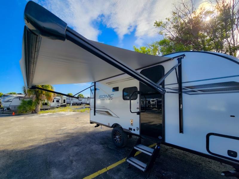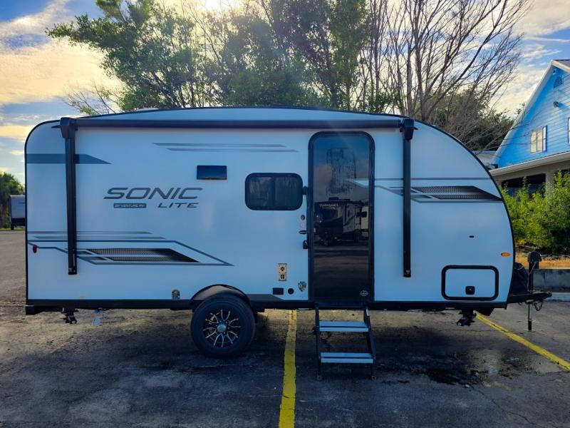With any Sonic Lite travel trailer by Venture RV, you begin with Next Generation in RV frame technology with the NXG frame, AZDEL Onboard composite panels, tongue and groove plywood floor decking, and a tucked rear bumper. The Fall Package 1.6 provides a motion light in the bathroom, a deep round stainless steel sink with cover in the kitchen, and the JBL Flip Bluetooth Speaker which allows you to use smartphone technology in the RV, plus a lighted power tongue jack, and WIFI prep to mention a few features. Get ready for comfort and style in a Sonic Lite ultra-lightweight, single-axle travel trailer of your choice!