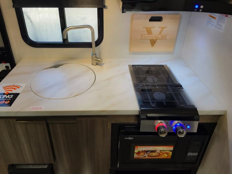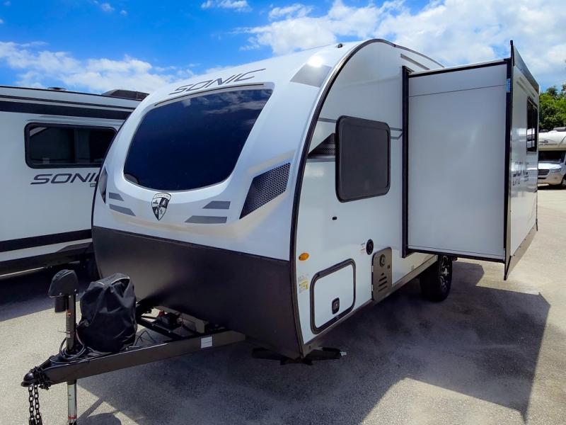 With any Sonic Lite travel trailer by Venture RV, you begin with Next Generation in RV frame technology with the NXG frame, AZDEL Onboard composite panels, tongue and groove plywood floor decking, and a tucked rear bumper. The Fall Package 1.6 provides a motion light in the bathroom, a deep round stainless steel sink with cover in the kitchen, and the JBL Flip Bluetooth Speaker which allows you to use smartphone technology in the RV, plus a lighted power tongue jack, and WIFI prep to mention a few features. Get ready for comfort and style in a Sonic Lite ultra-lightweight, single-axle travel trailer of your choice!
