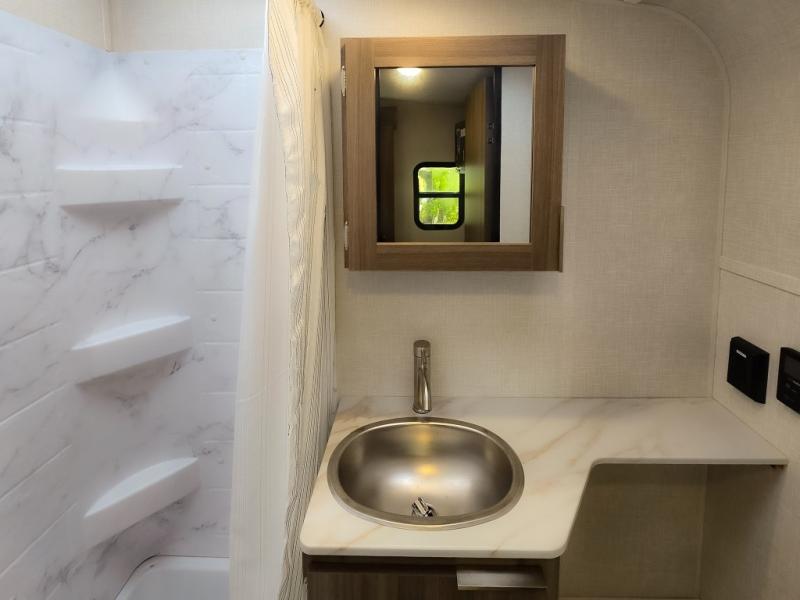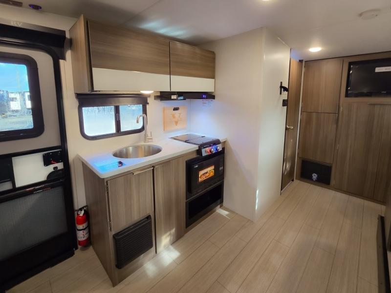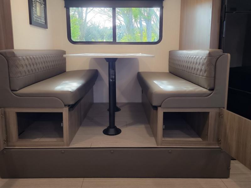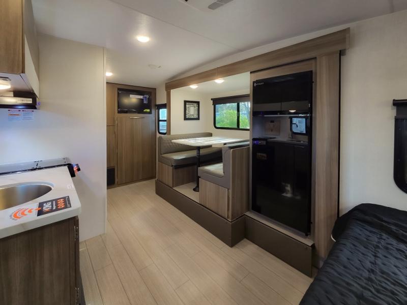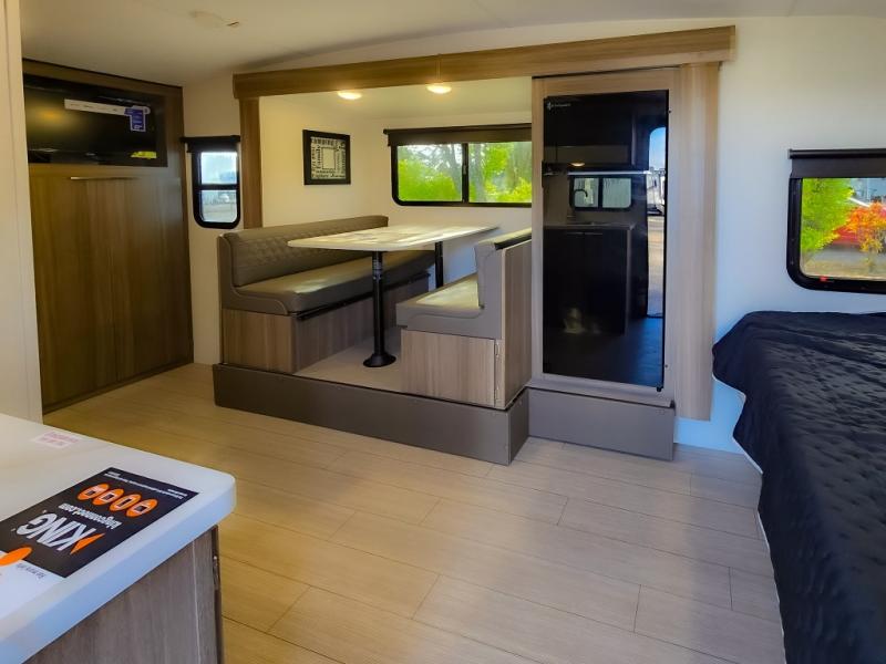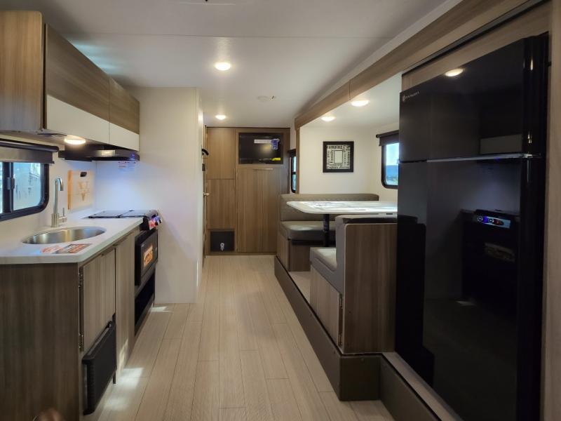 Cook, relax, sleep, and do it all again after your hike, play games and visit with other RVers! This trailer is perfect for a quick trip or a long vacation with sleeping space for three to four when you utilize the booth dinette. There is a 60" x 75" bed up front for two to easily fall asleep and includes a side wardrobe and overhead cabinet for your belongings. In the morning, the cook can use the two burner cooktop and convection microwave to whip up breakfast for you to enjoy under the 12' power awning after grabbing your camping chairs from the pass-through storage that has a motion-activated light which is helpful in the dark. You will also appreciate the full bathroom amenities, the pantry for your goodies and the entertainment center.