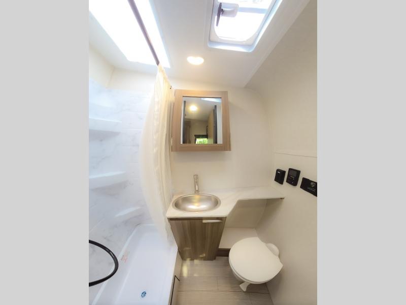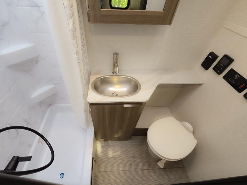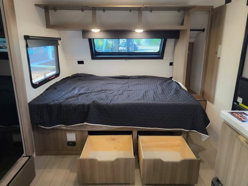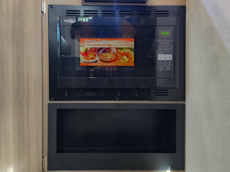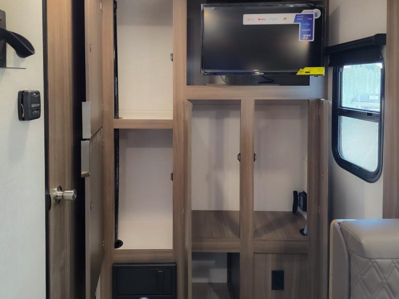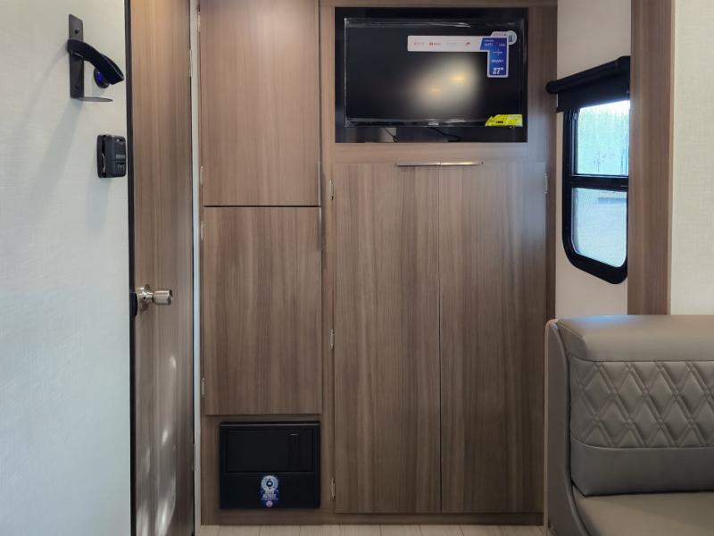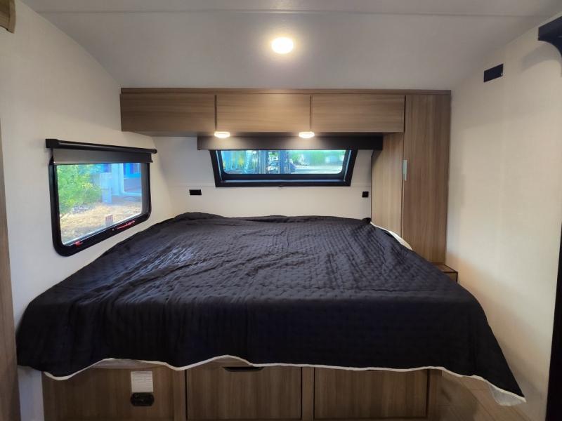 Cook, relax, sleep, and do it all again after your hike, play games and visit with other RVers! This trailer is perfect for a quick trip or a long vacation with sleeping space for three to four when you utilize the booth dinette. There is a 60" x 75" bed up front for two to easily fall asleep and includes a side wardrobe and overhead cabinet for your belongings. In the morning, the cook can use the two burner cooktop and convection microwave to whip up breakfast for you to enjoy under the 12' power awning after grabbing your camping chairs from the pass-through storage that has a motion-activated light which is helpful in the dark. You will also appreciate the full bathroom amenities, the pantry for your goodies and the entertainment center.