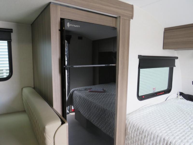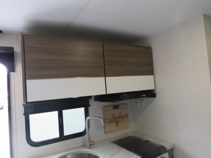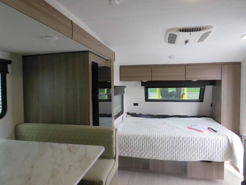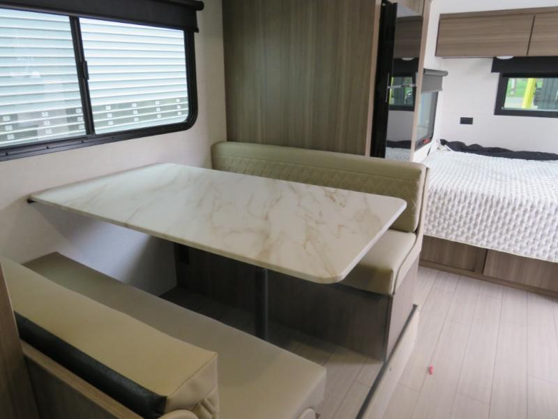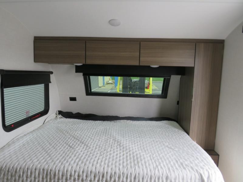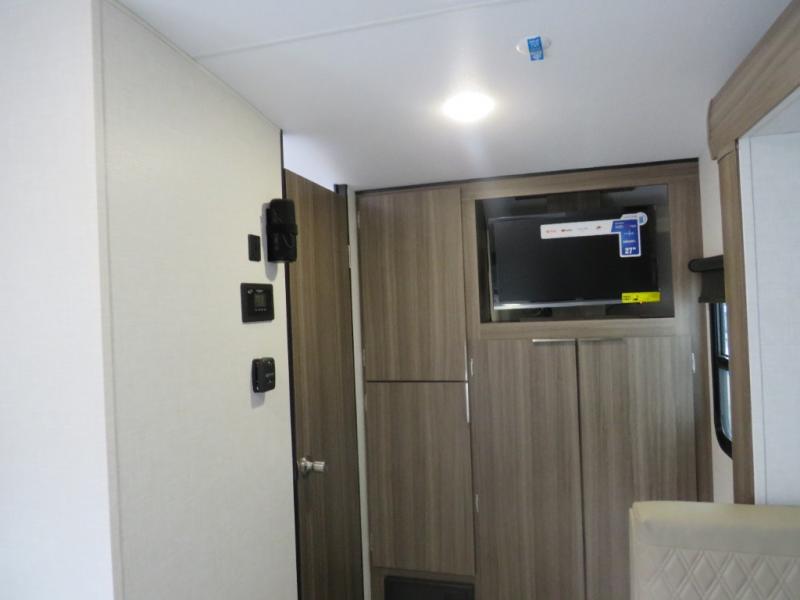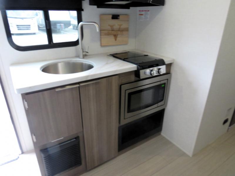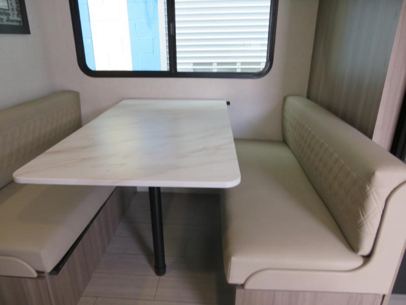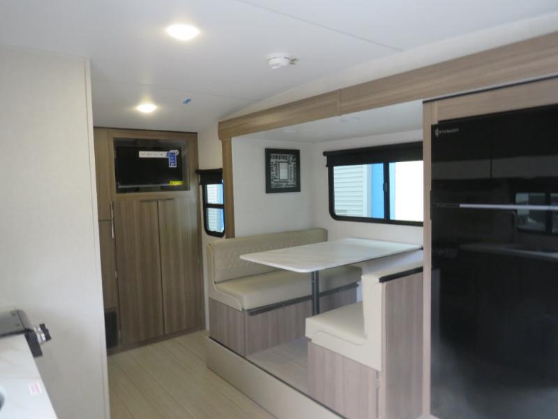 Cook, relax, sleep, and do it all again after your hike, play games and visit with other RVers! This trailer is perfect for a quick trip or a long vacation with sleeping space for three to four when you utilize the booth dinette. There is a 60" x 75" bed up front for two to easily fall asleep and includes a side wardrobe and overhead cabinet for your belongings. In the morning, the cook can use the two burner cooktop and convection microwave to whip up breakfast for you to enjoy under the 12' power awning after grabbing your camping chairs from the pass-through storage that has a motion-activated light which is helpful in the dark. You will also appreciate the full bathroom amenities, the pantry for your goodies and the entertainment center.