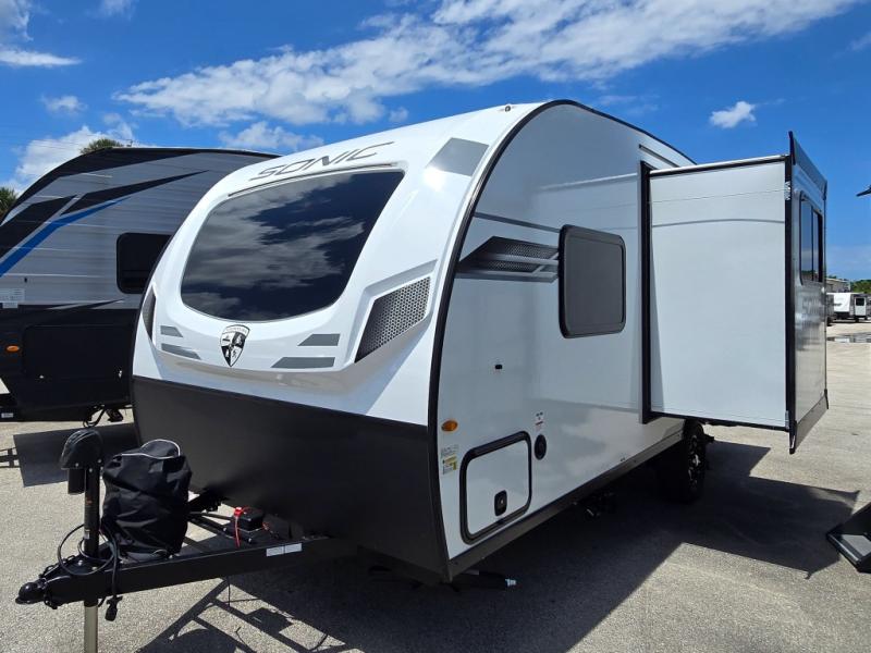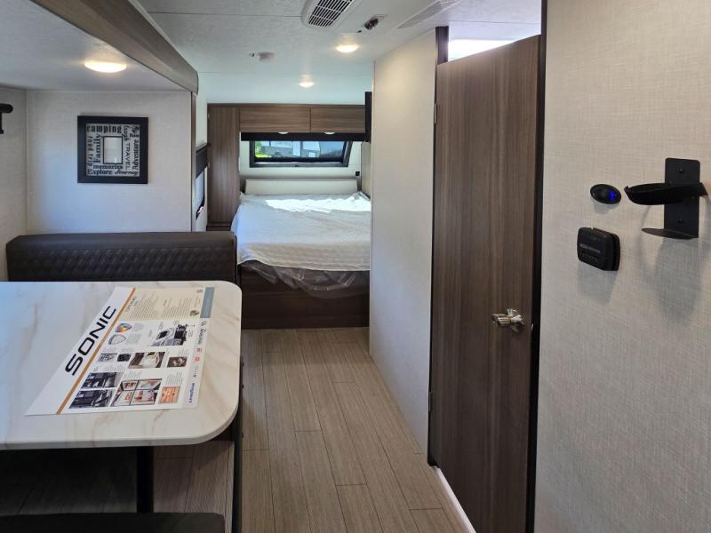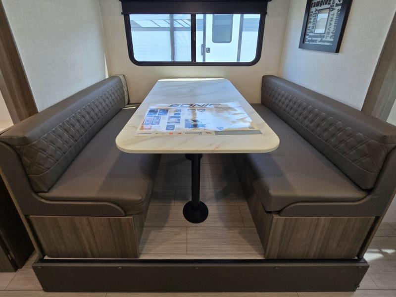 With any Sonic Lite travel trailer by Venture RV, you begin with Next Generation in RV frame technology with the NXG frame, AZDEL Onboard composite panels, tongue and groove plywood floor decking, and a tucked rear bumper. The Fall Package 1.6 provides a motion light in the bathroom, a deep round stainless steel sink with cover in the kitchen, and the JBL Flip Bluetooth Speaker which allows you to use smartphone technology in the RV, plus a lighted power tongue jack, and WIFI prep to mention a few features. Get ready for comfort and style in a Sonic Lite ultra-lightweight, single-axle travel trailer of your choice!