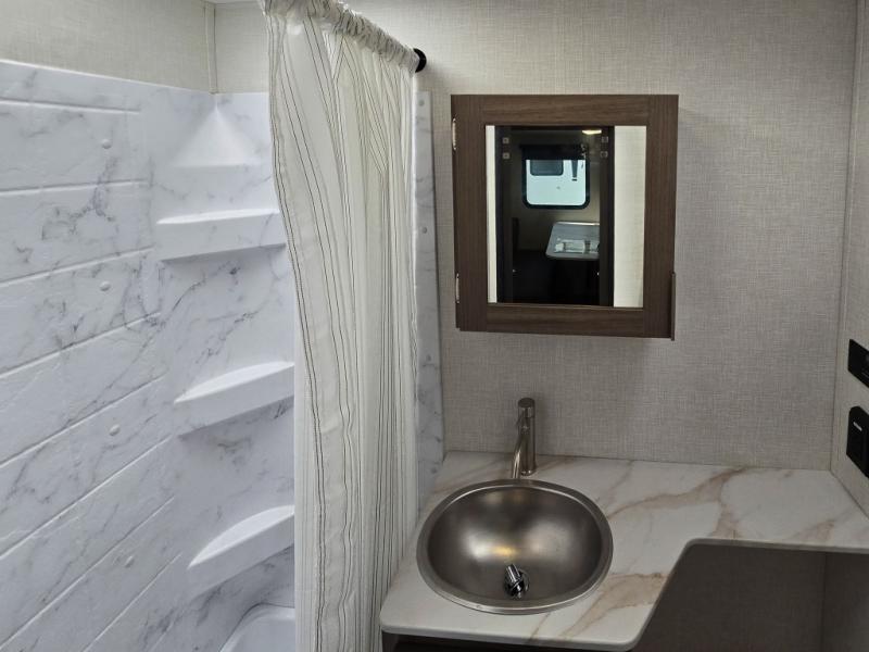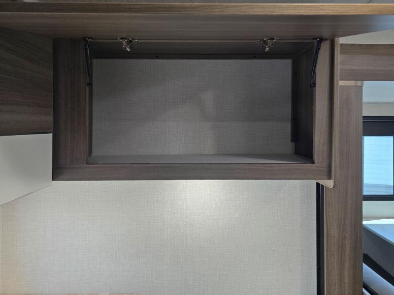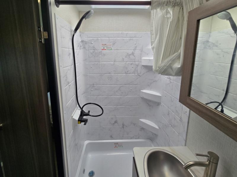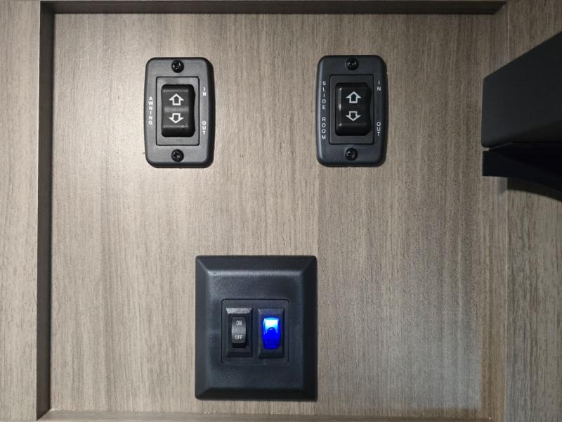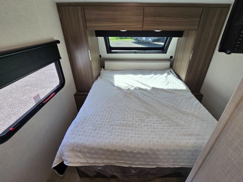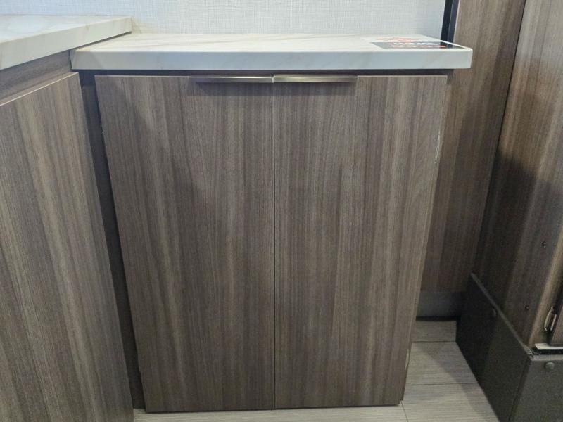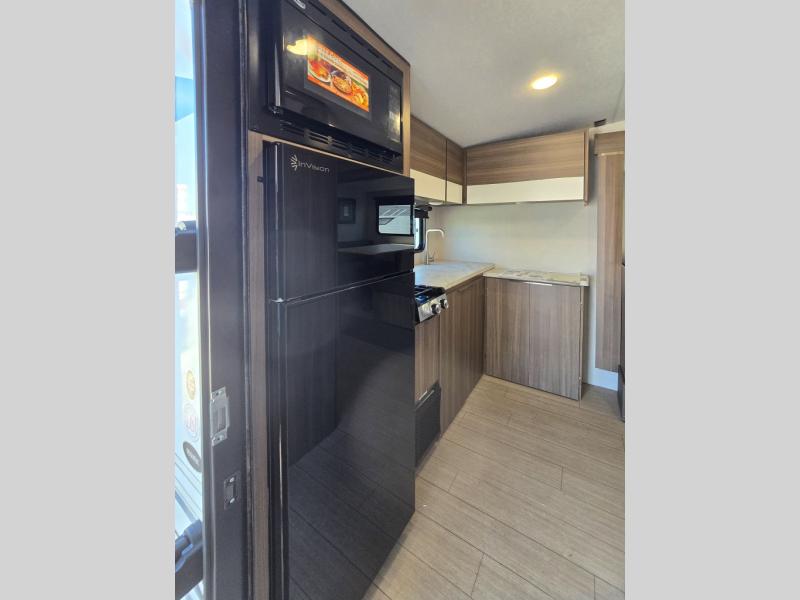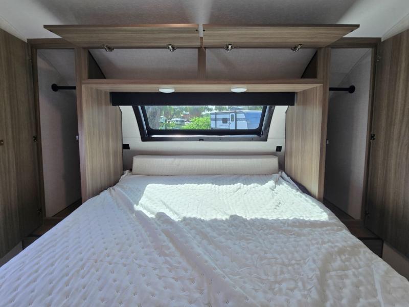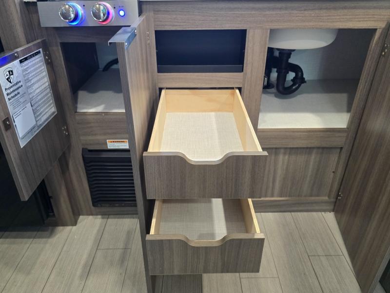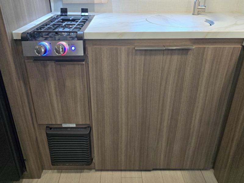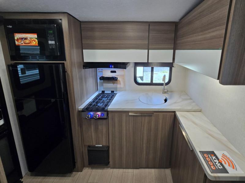 Enjoy camping with your favorite person and/or your family in this trailer that offers a rear kitchen with a two burner cooktop and convection microwave, windows and overhead cabinets for dishes and spices, plus next to the entry there is an 8 cu. ft. refrigerator and a pantry/closet to easily grab a drink and snack on your way out to explore. Yet you might want to relax under the 13' power awning before heading out. And when you get back, you can get cleaned up in the full bathroom before falling asleep on the front RV queen bed with StorMore bedside nightstands and a 110V outlet plus USB charging for your cellphones, and one to two tired campers can sleep on the sit n' slide booth dinette.