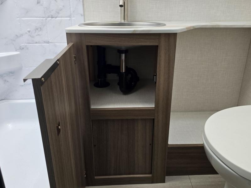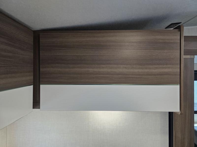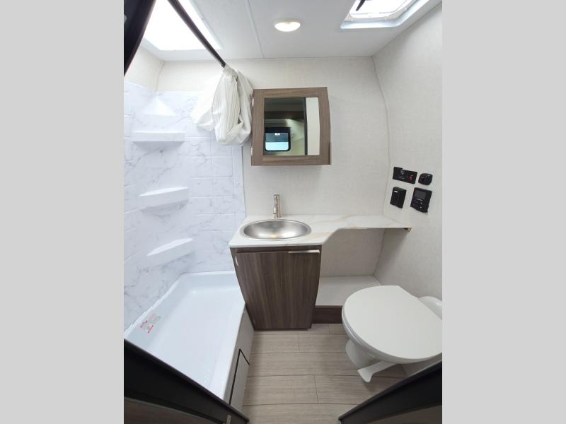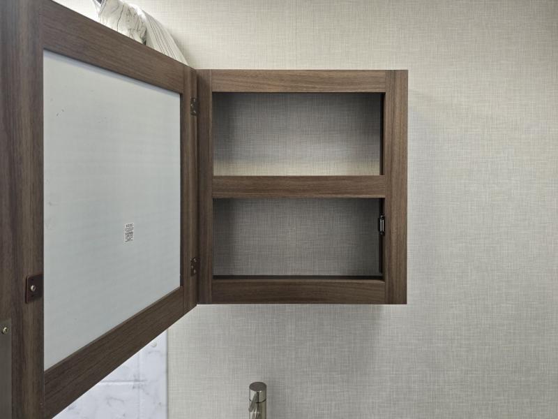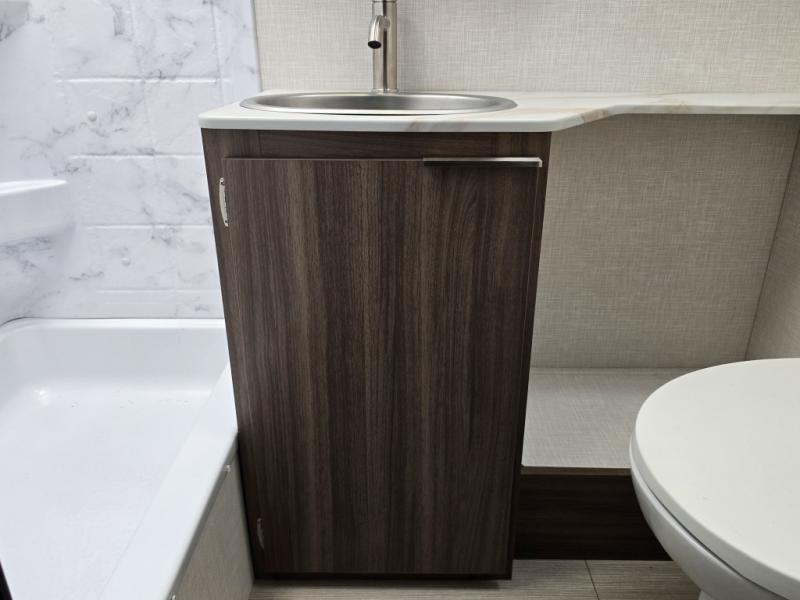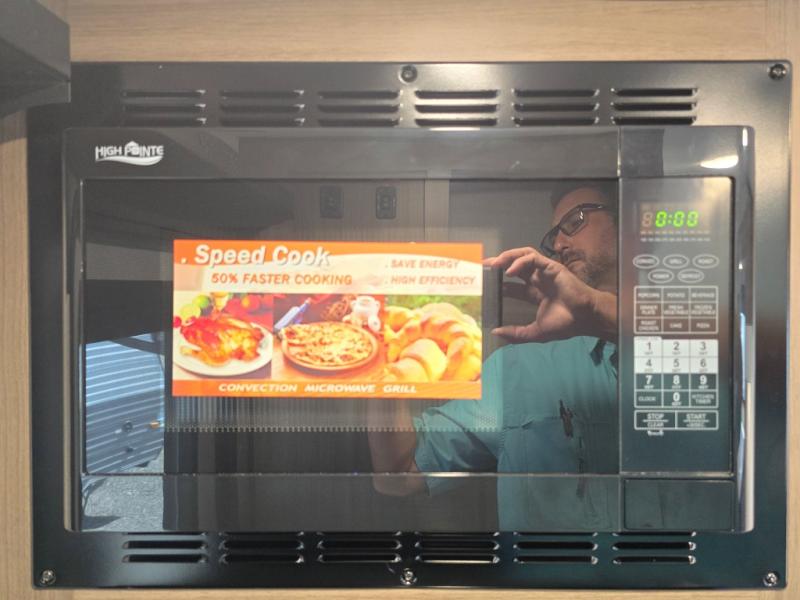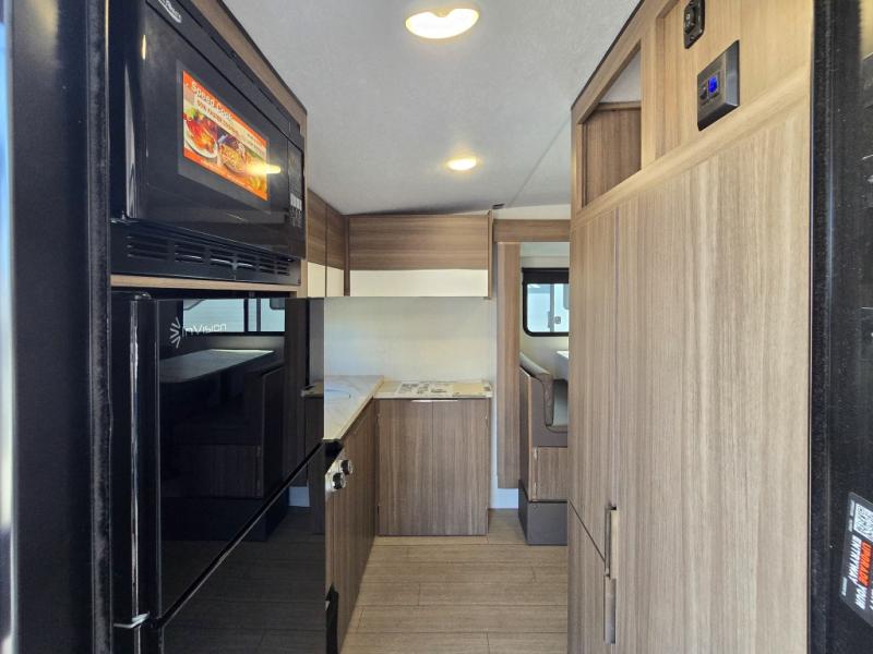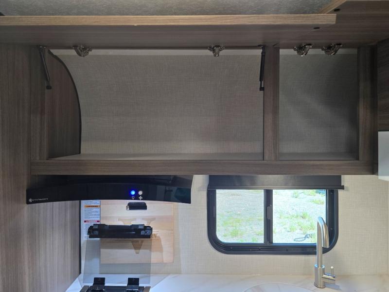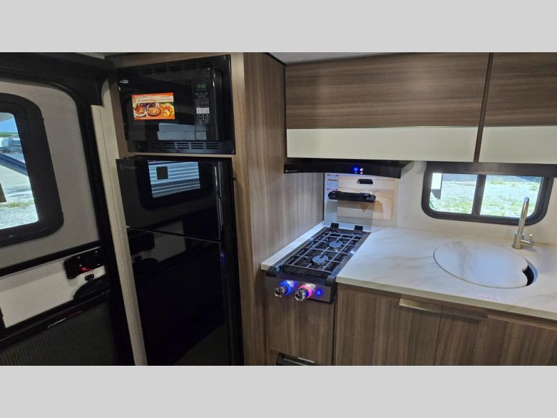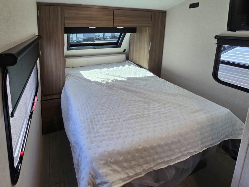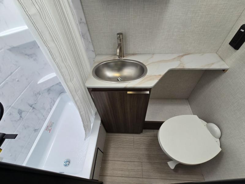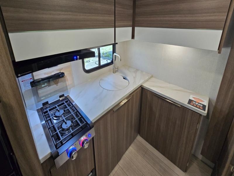 Enjoy camping with your favorite person and/or your family in this trailer that offers a rear kitchen with a two burner cooktop and convection microwave, windows and overhead cabinets for dishes and spices, plus next to the entry there is an 8 cu. ft. refrigerator and a pantry/closet to easily grab a drink and snack on your way out to explore. Yet you might want to relax under the 13' power awning before heading out. And when you get back, you can get cleaned up in the full bathroom before falling asleep on the front RV queen bed with StorMore bedside nightstands and a 110V outlet plus USB charging for your cellphones, and one to two tired campers can sleep on the sit n' slide booth dinette.