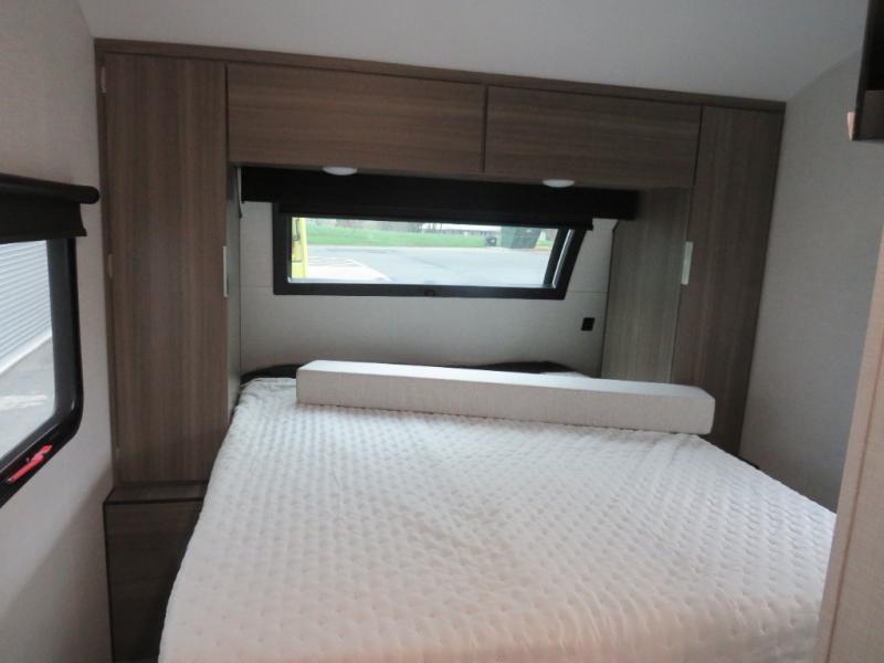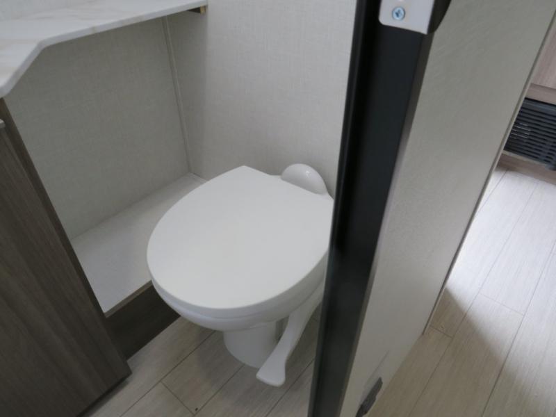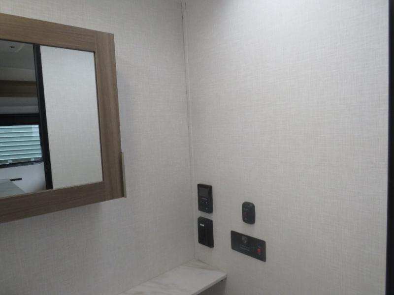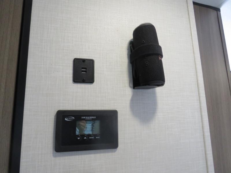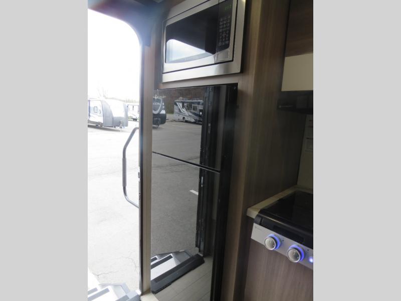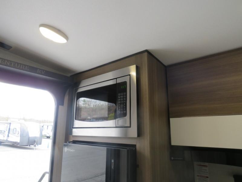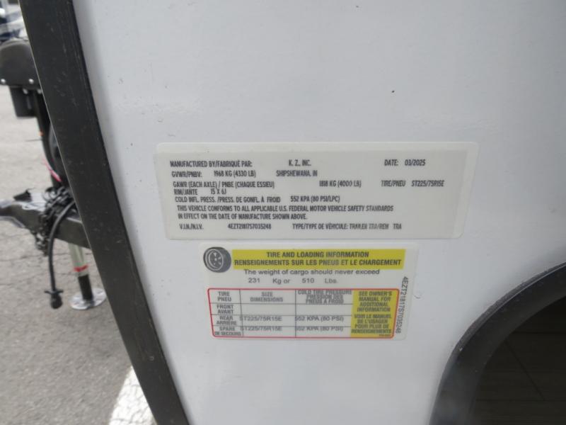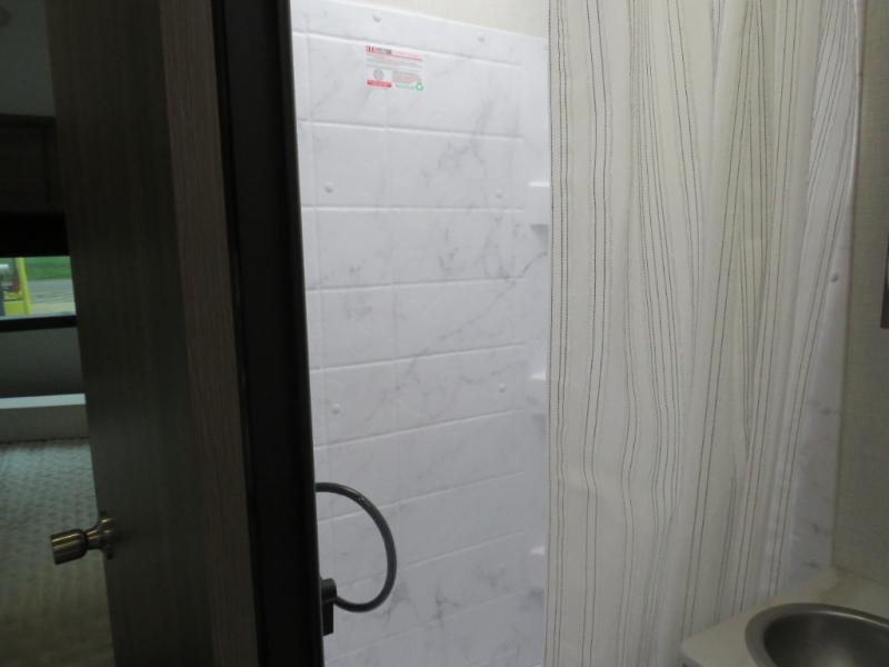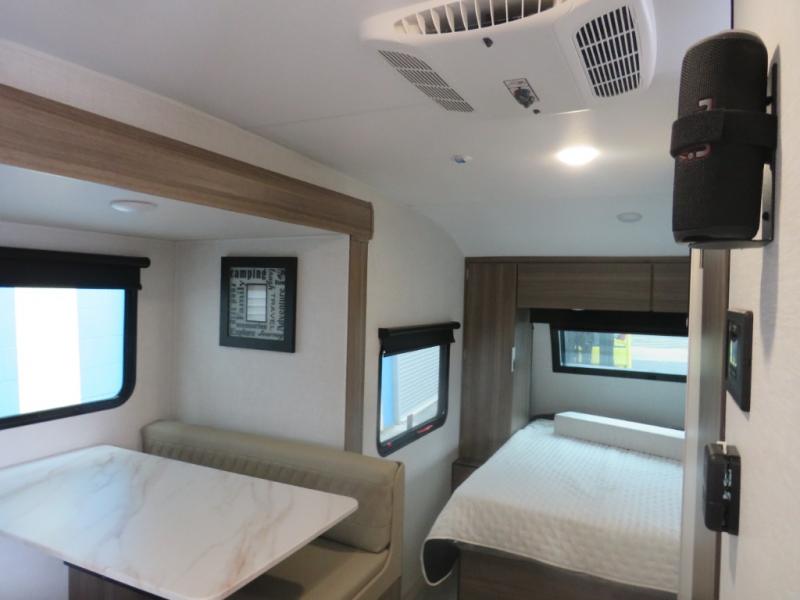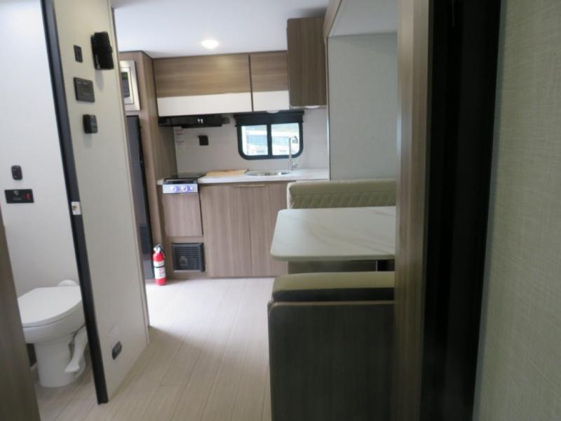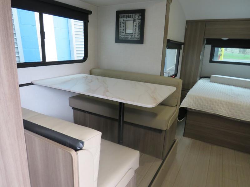 Enjoy camping with your favorite person and/or your family in this trailer that offers a rear kitchen with a two burner cooktop and convection microwave, windows and overhead cabinets for dishes and spices, plus next to the entry there is an 8 cu. ft. refrigerator and a pantry/closet to easily grab a drink and snack on your way out to explore. Yet you might want to relax under the 13' power awning before heading out. And when you get back, you can get cleaned up in the full bathroom before falling asleep on the front RV queen bed with StorMore bedside nightstands and a 110V outlet plus USB charging for your cellphones, and one to two tired campers can sleep on the sit n' slide booth dinette.