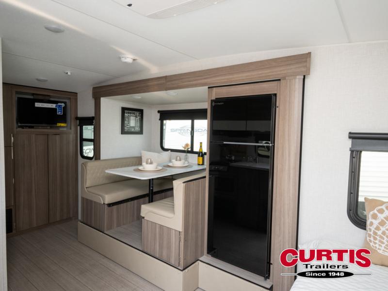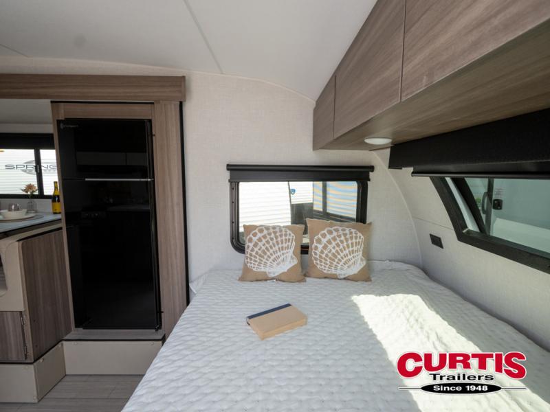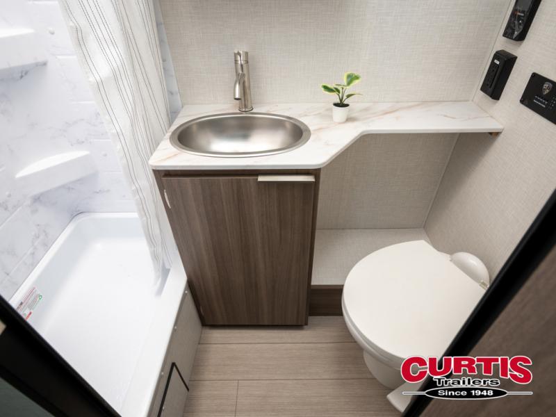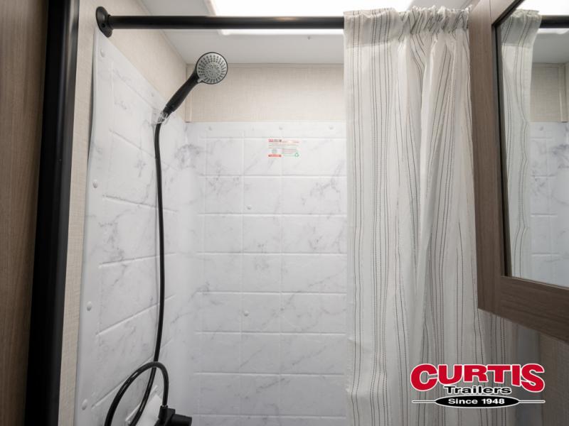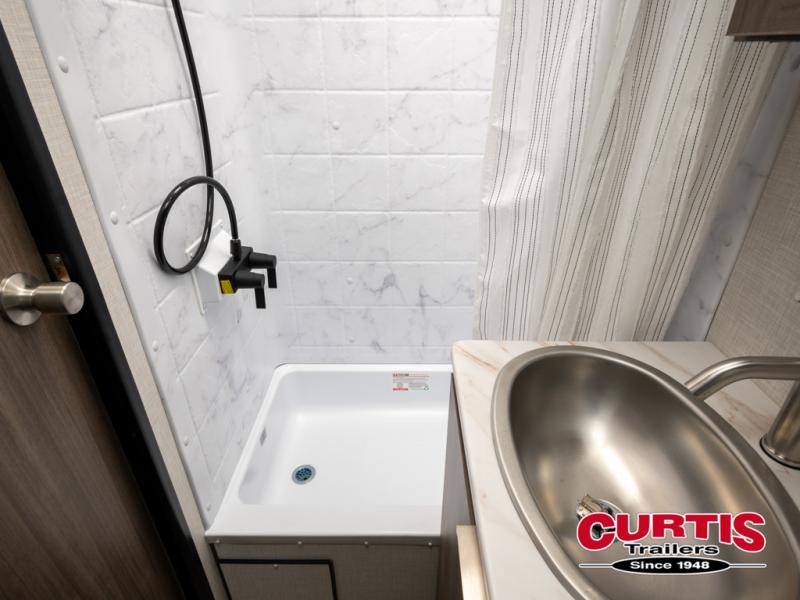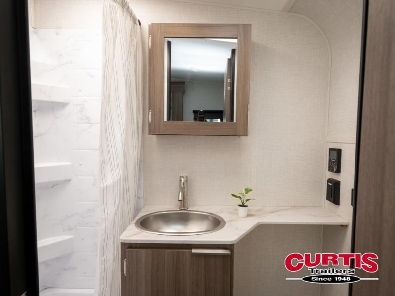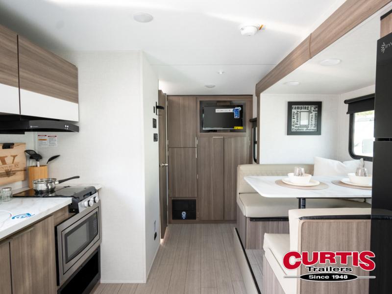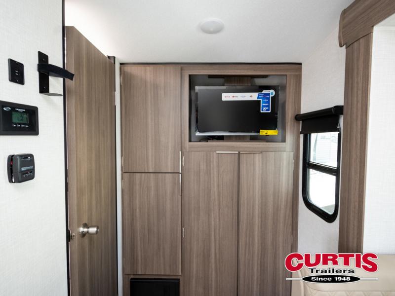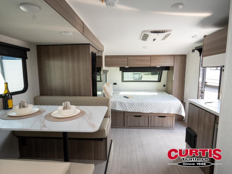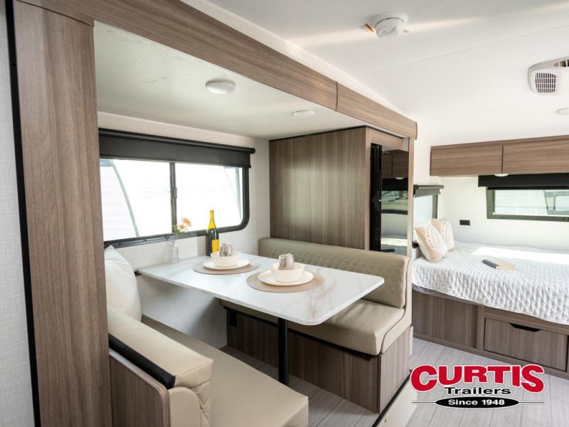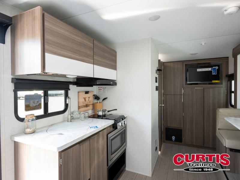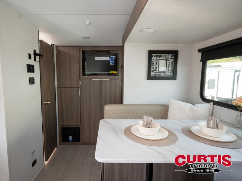 Cook, relax, sleep, and do it all again after your hike, play games and visit with other RVers! This trailer is perfect for a quick trip or a long vacation with sleeping space for three to four when you utilize the booth dinette. There is a 60" x 75" bed up front for two to easily fall asleep and includes a side wardrobe and overhead cabinet for your belongings. In the morning, the cook can use the two burner cooktop and convection microwave to whip up breakfast for you to enjoy under the 12' power awning after grabbing your camping chairs from the pass-through storage that has a motion-activated light which is helpful in the dark. You will also appreciate the full bathroom amenities, the pantry for your goodies and the entertainment center.