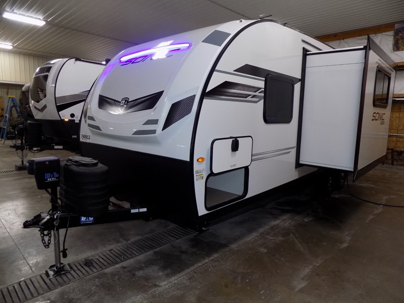 With any Sonic travel trailer by Venture RV, you begin with Next Generation in RV frame technology with the NXG Huck-bolt frame, AZDEL Onboard composite panels, tongue and groove plywood floor decking, radiant foil bubble insulation-wrapped tanks, 360-degree residential fiberglass insulation and radiant foil insulation, plus a forced-air heated and enclosed underbelly which is part of the Weather-Shield package. There is a Highway Package that comes mandatory, and the Fall Package 1.6 provides a motion light in the bathroom, a dish drying sink cover, a power tongue jack, and WIFI prep to mention a few features. Get ready for comfort and style in a Sonic ultra-lightweight, tandem-axle travel trailer of your choice!