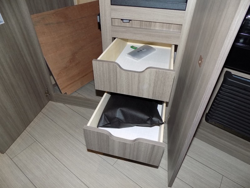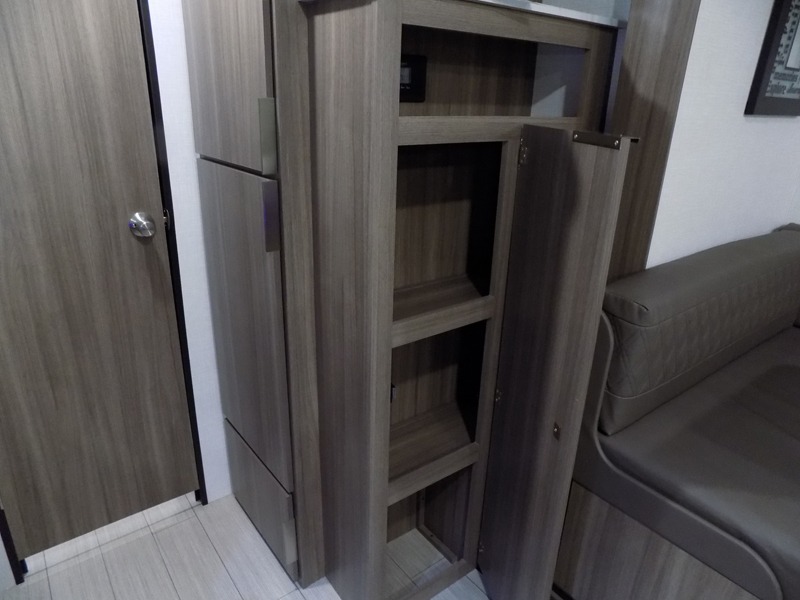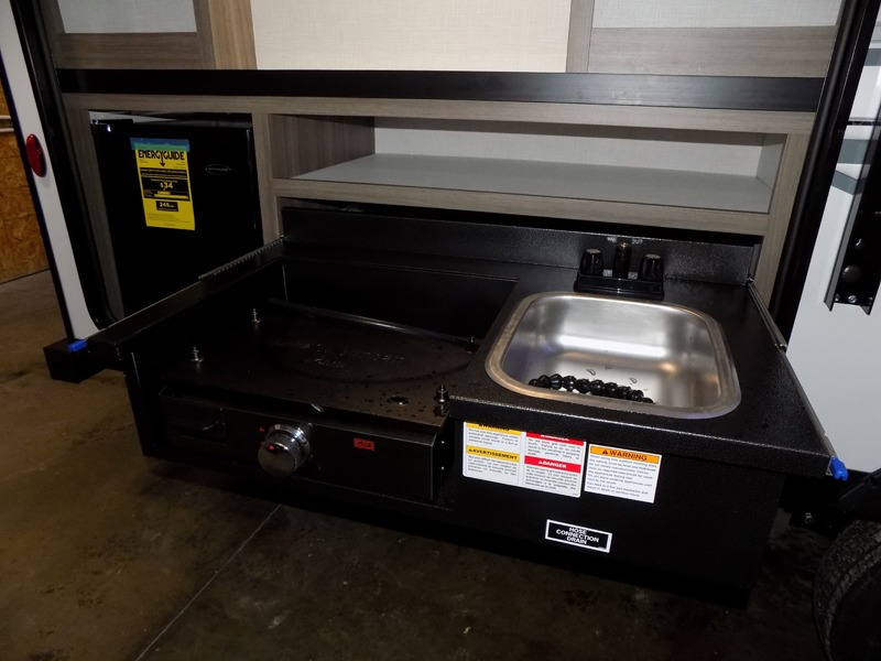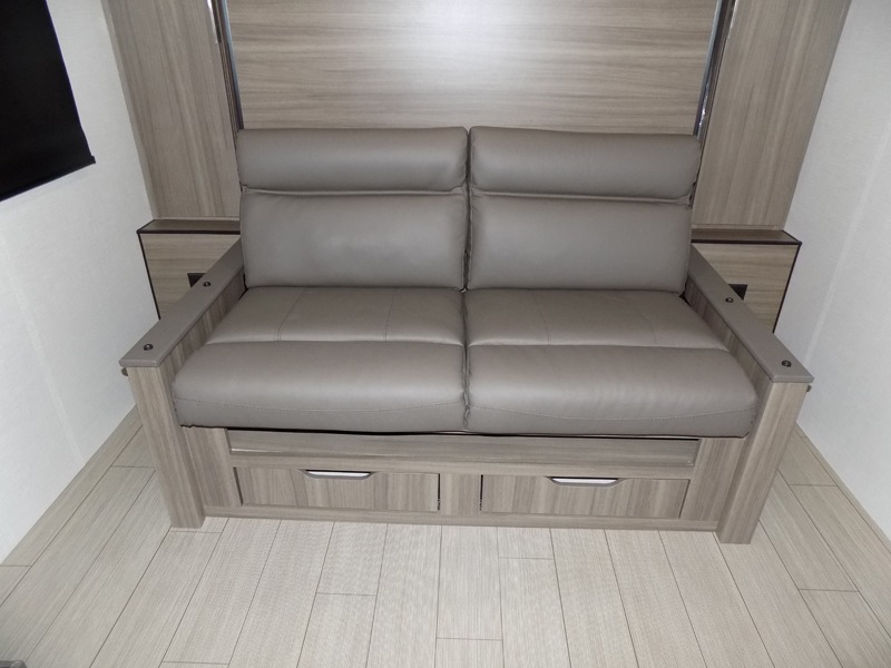 A cook will love this trailer with the choice to make meals inside with full amenities including an 8 cu. ft. refrigerator and a pantry, or outside while using the campfire cafe which offers a griddle and refrigerator, plus counter space to prepare and serve meals. There is sleeping space for four when you utilize the U-shaped dinette slide out that also provides more interior floor space along with the versatile Murphy bed and sofa up front. You will also find a privacy curtain that will section off this area that also features StorMore bedside nightstands with a 110V outlet and USB charging, and two wardrobes.