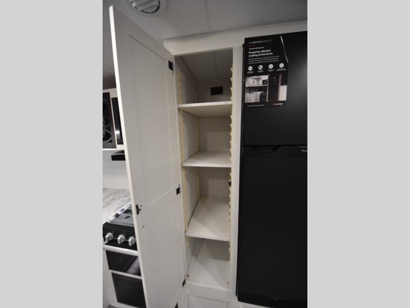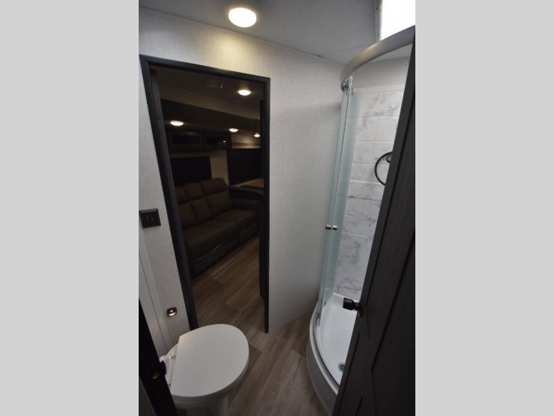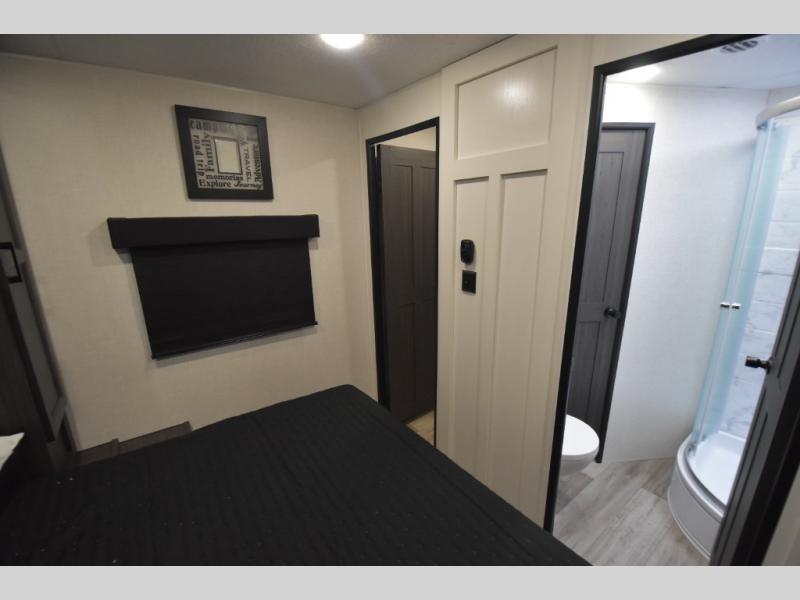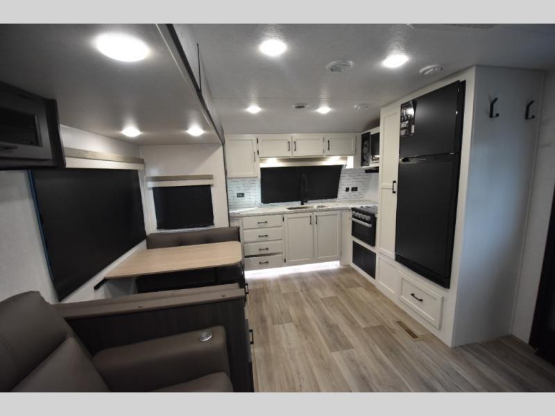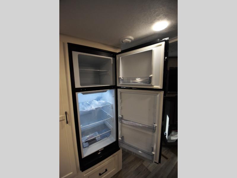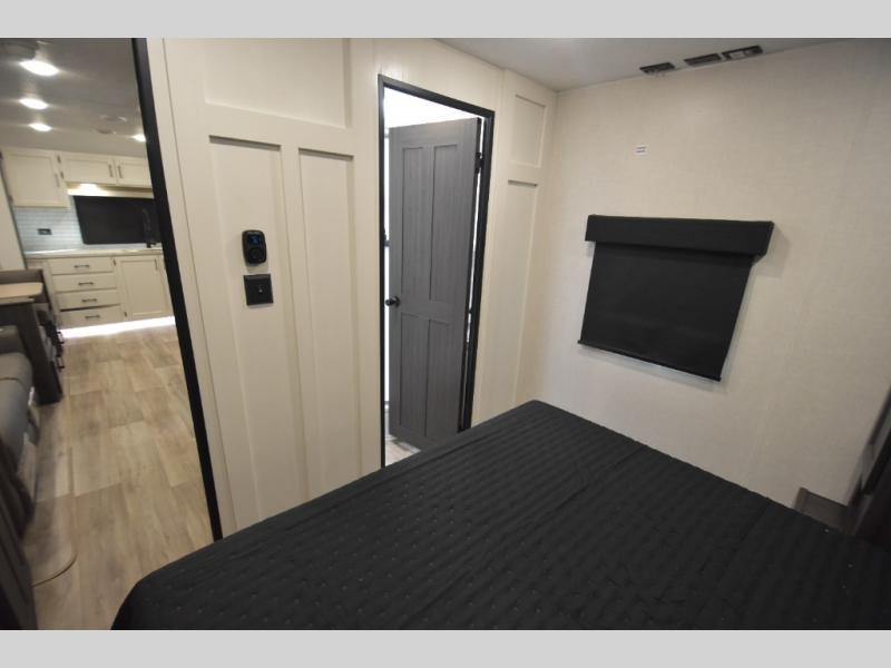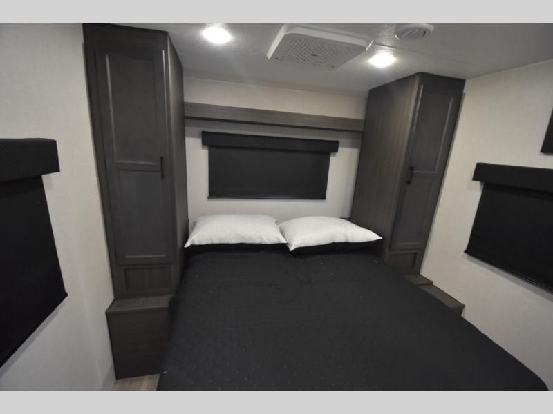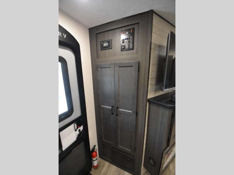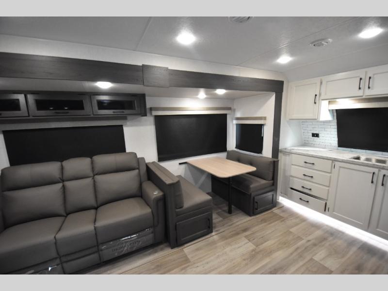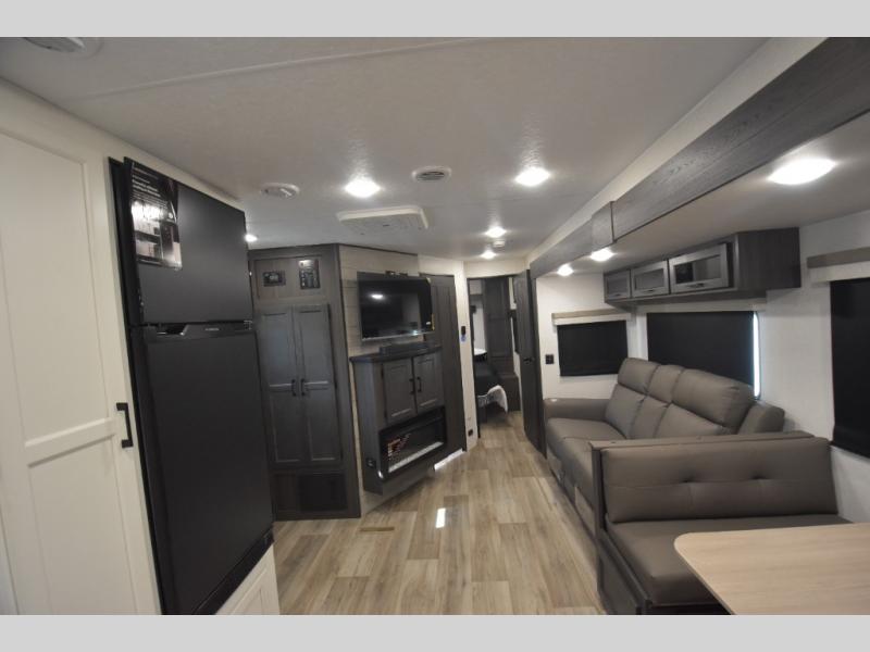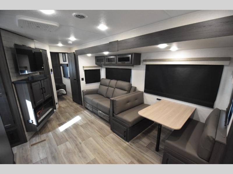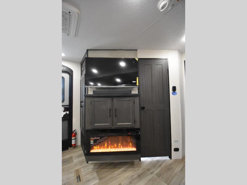 A front kitchen in this travel trailer provides more interior space! Once you have prepared your best meals with the Furrion oven and three burner cooktop, you can head to the Sit N' Slide table with flipside reversible cushions to dine. The 70" sofa also offers a comfortable place to take an afternoon nap or sit while enjoying the entertainment center with a frameless electric fireplace and 40" TV on a swing arm. A dual entry bathroom makes it easy for all to enter and has a 34" radius shower to freshen up in each morning. The rear private bedroom has a Sleep Tight queen bed for a good night's rest, wardrobes on either side of it, and an entrance into the bathroom too!