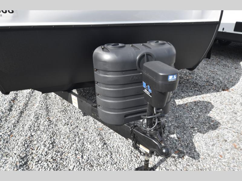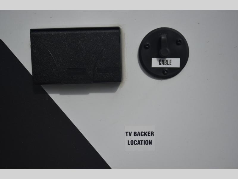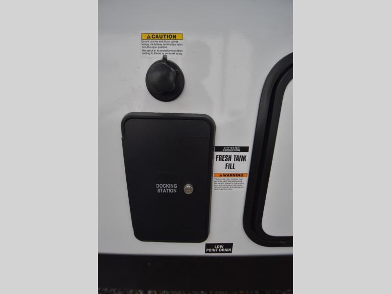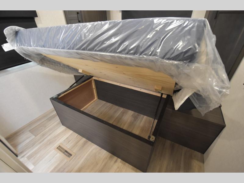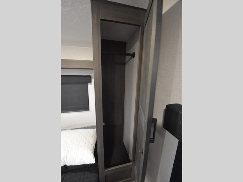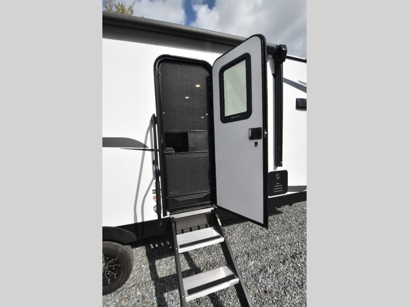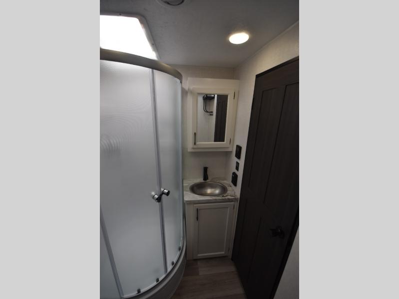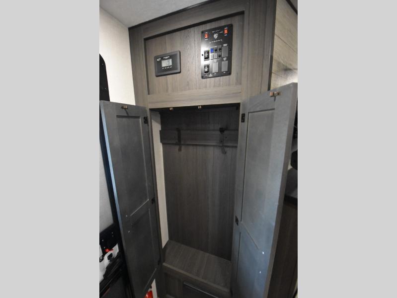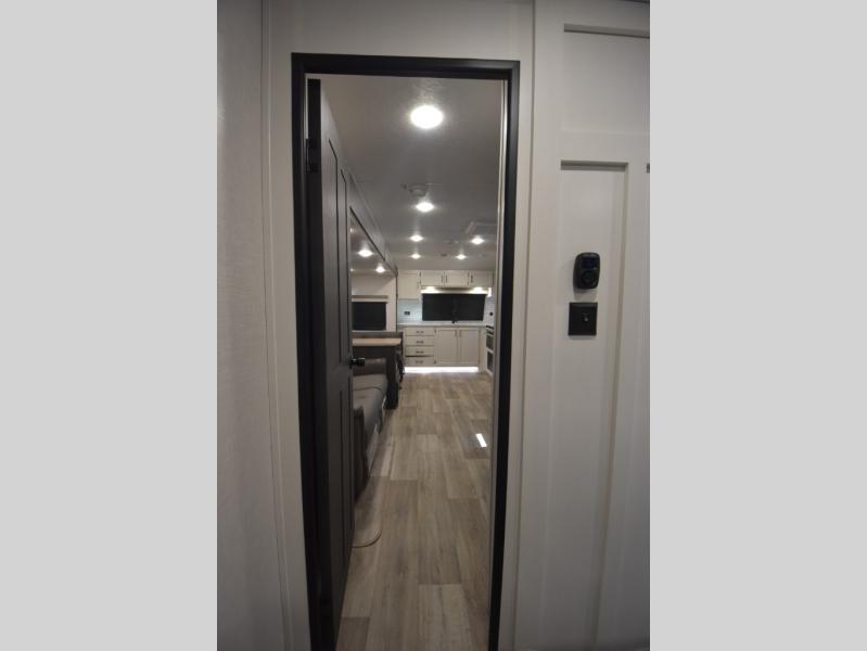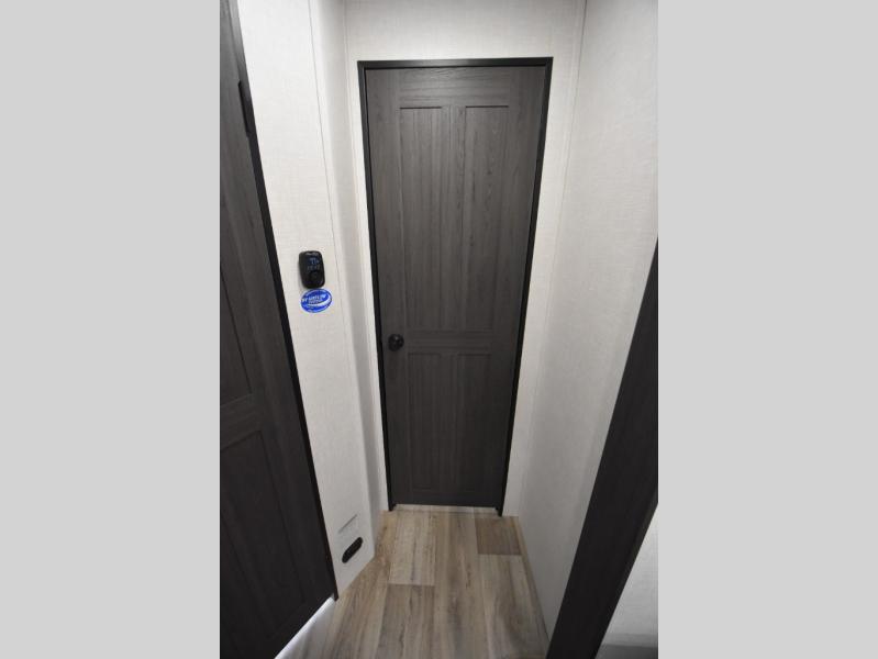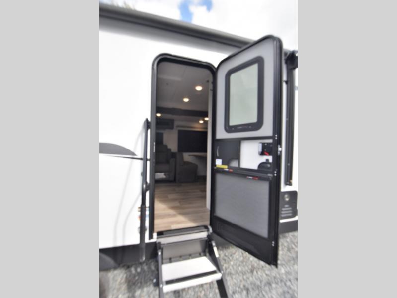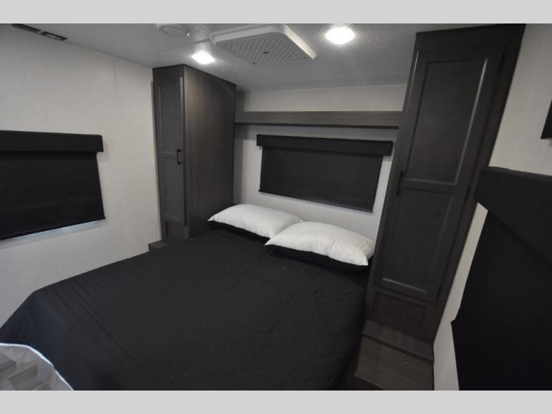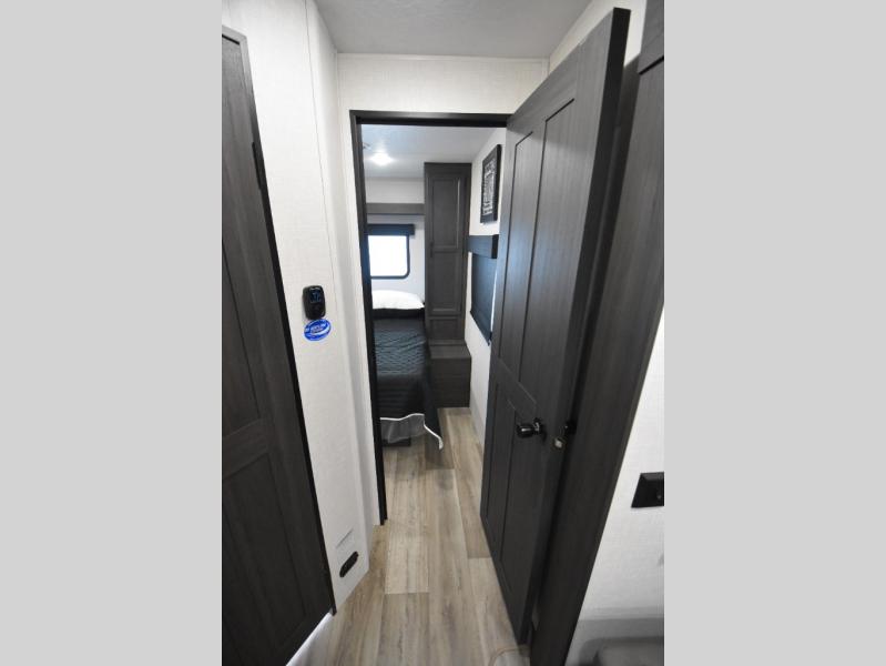 A front kitchen in this travel trailer provides more interior space! Once you have prepared your best meals with the Furrion oven and three burner cooktop, you can head to the Sit N' Slide table with flipside reversible cushions to dine. The 70" sofa also offers a comfortable place to take an afternoon nap or sit while enjoying the entertainment center with a frameless electric fireplace and 40" TV on a swing arm. A dual entry bathroom makes it easy for all to enter and has a 34" radius shower to freshen up in each morning. The rear private bedroom has a Sleep Tight queen bed for a good night's rest, wardrobes on either side of it, and an entrance into the bathroom too!