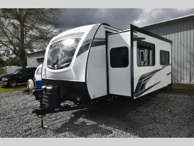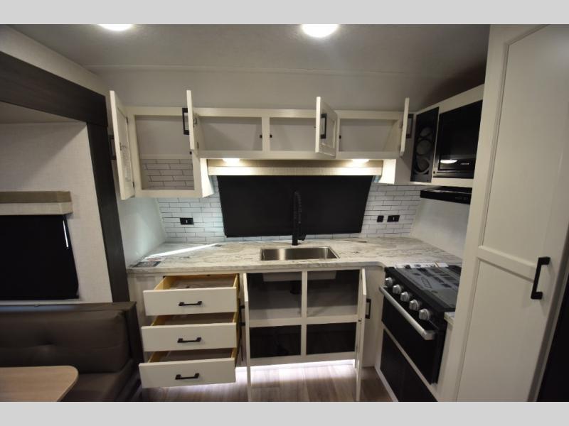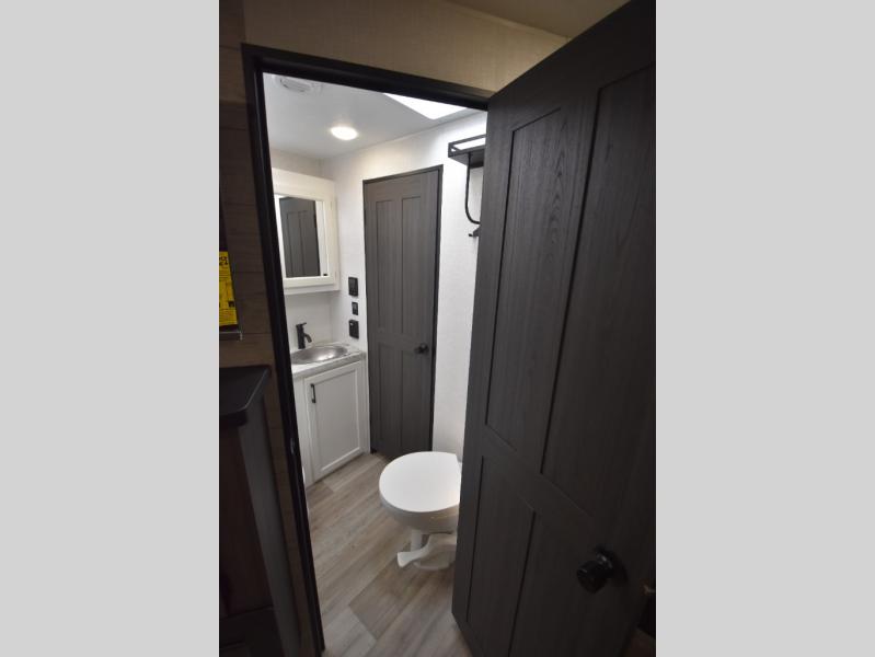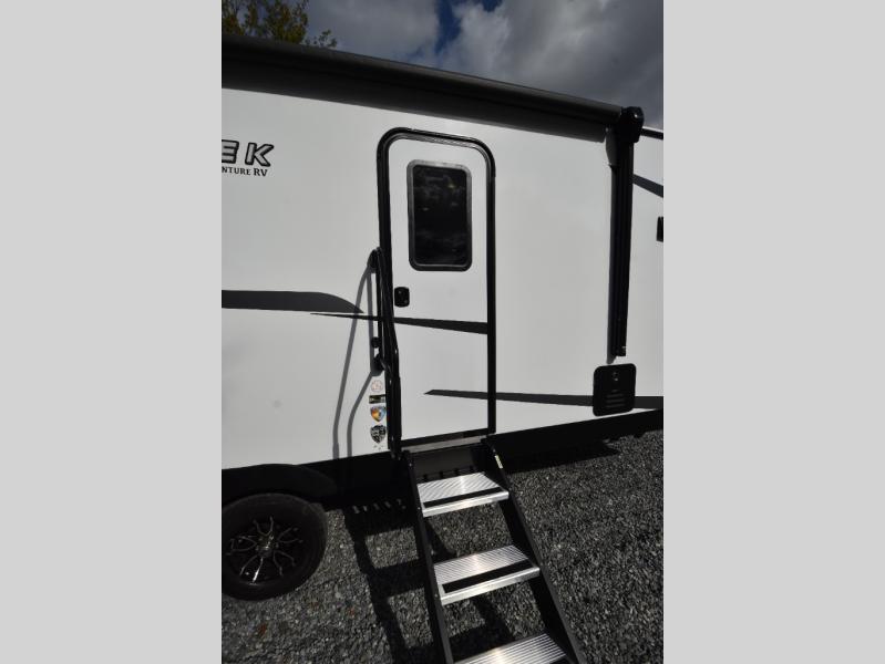 Every Venture RV SportTrek lightweight travel trailer is constructed to offer peace of mind and the comforts of home! Their purposeful residential kitchens are packed with handy features like a Furrion oven and three burner cooktop, a large stainless steel sink with a cover and dish drying rack, plus a 12V refrigerator. You will find plenty of storage throughout, including Safe-Tek hidden storage with a charging center and StorMore nightstands on either side of the bed behind the full-length closets. And the magnetic slam-latch baggage doors and spacious pass-through storage area will hold your outdoor gear in place. They even come with a hot and cold exterior shower and SporTrek's Weather Shield which includes a forced air heated and enclosed underbelly, high output A/C ducting, and more features that will let you extend your camping season. You will also love the new residential upgraded furniture, Serta memory foam mattress, barn style passage doors, and many more comforts!