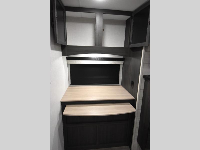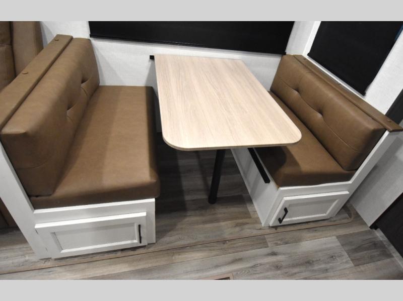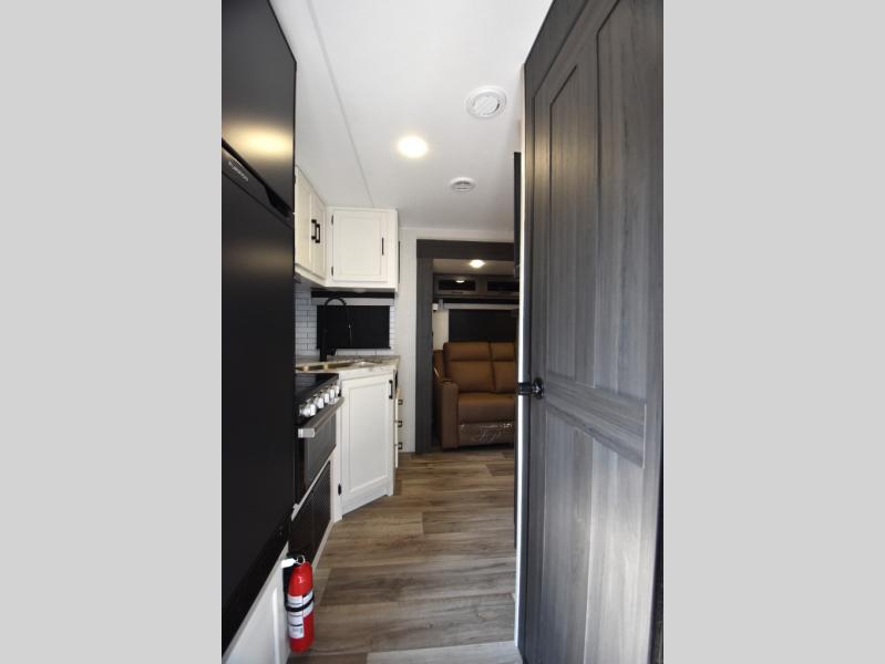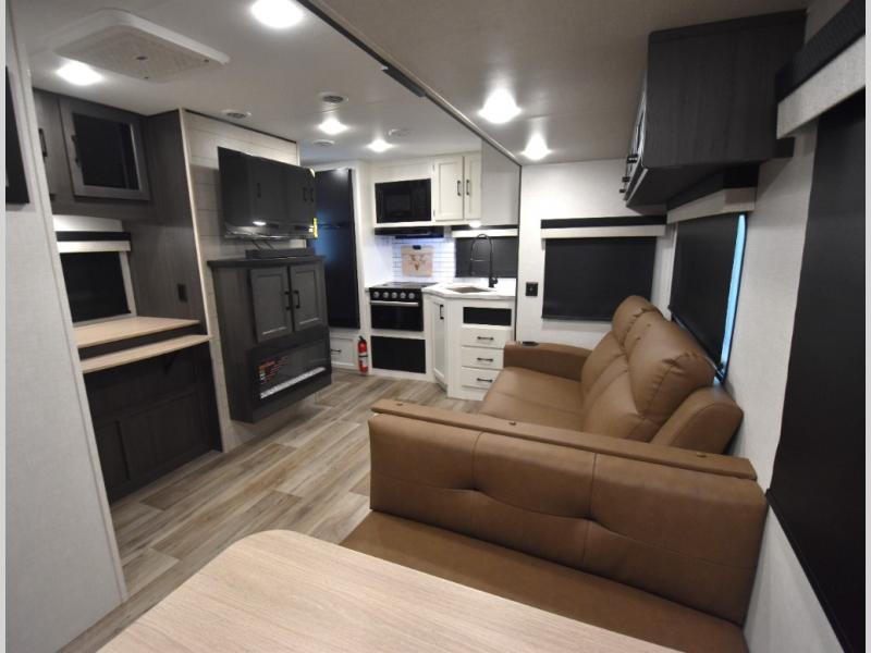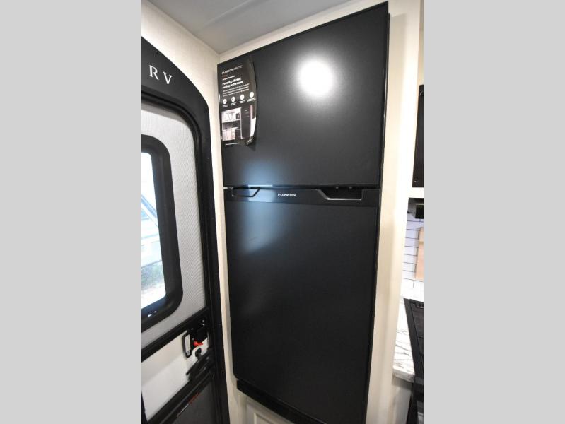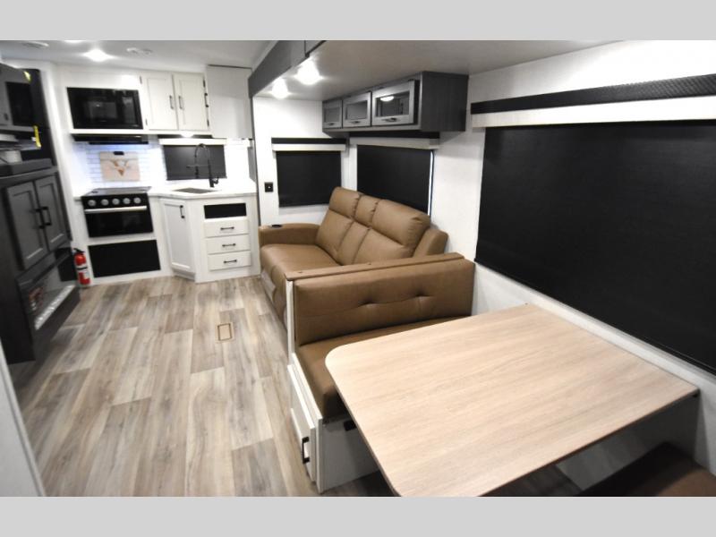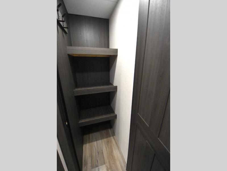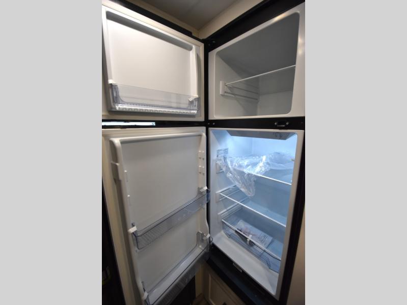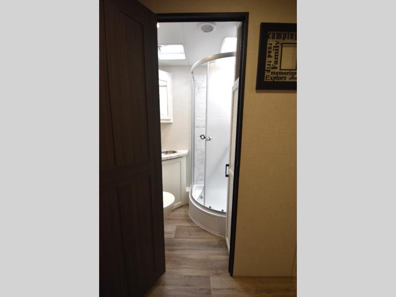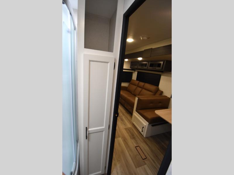 The chef will love the open rear kitchen area of this travel trailer! The 10 cu. ft. 12V refrigerator is big enough to hold your perishables and the flip countertop area is the perfect place for a coffee bar. You can even cook outside with the campfire café that has a refrigerator, a sink, and a griddle to grill some burgers while breathing in fresh air. Just be sure to grab your coat hanging on the coat hooks in the walk-in pantry before heading out the door. A 70" sofa and Sit N' Slide table adds more interior space, as well as comfortable places to eat, relax, and even sleep once converted. Everyone can freshen up in the full bathroom with the 34" radius shower and even have their towel close by thanks to the linen closet next to it!