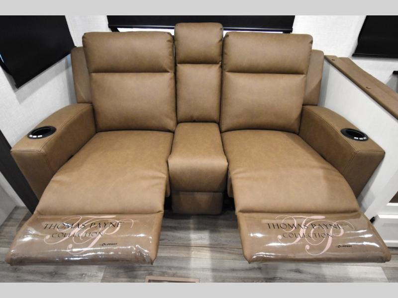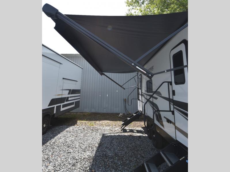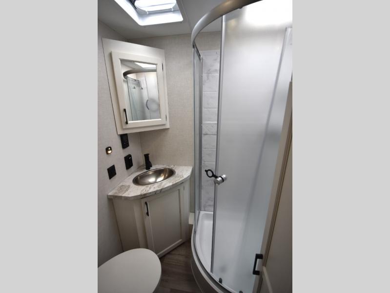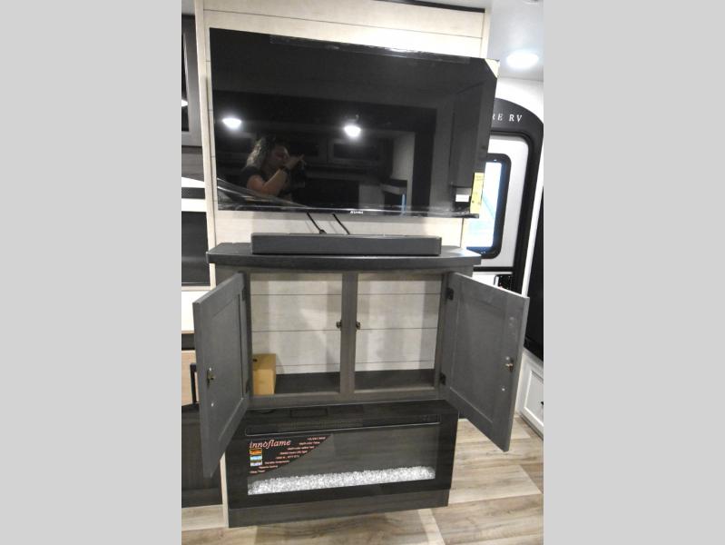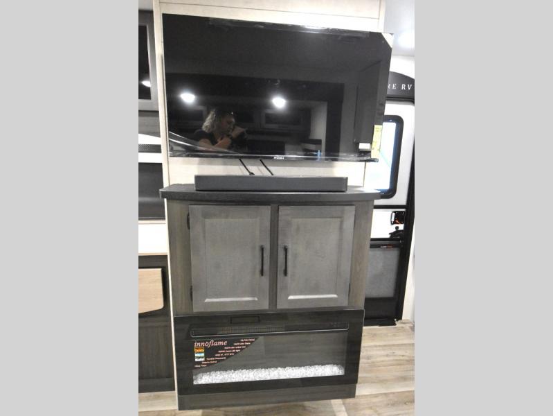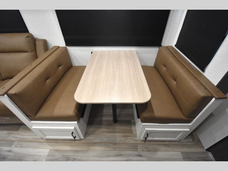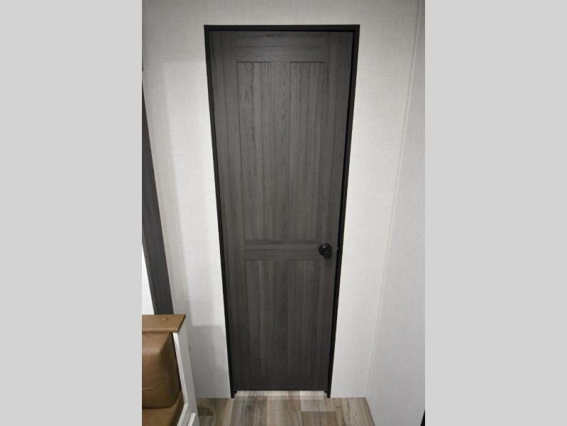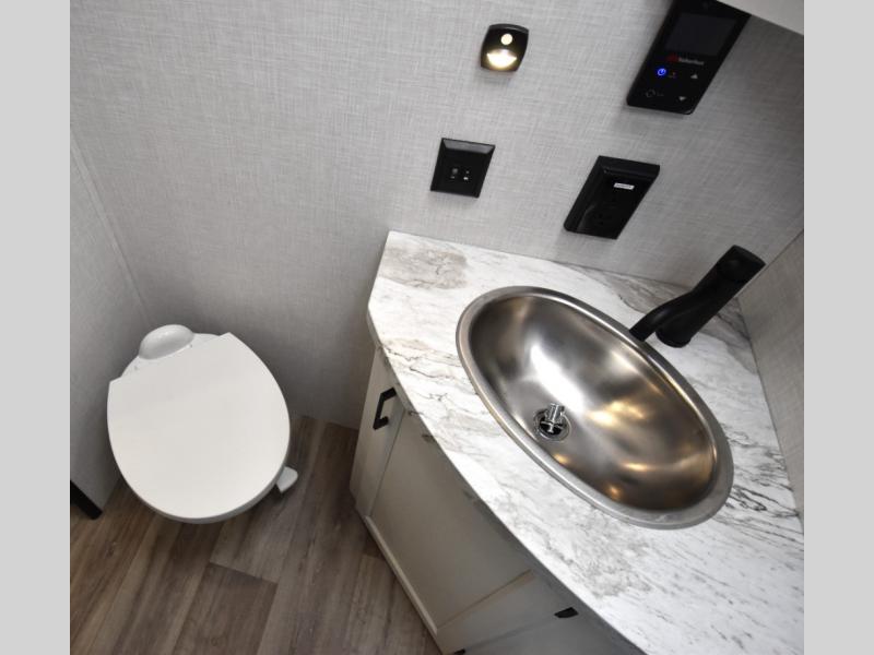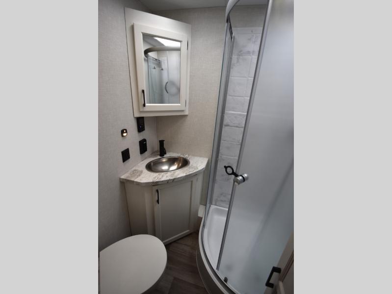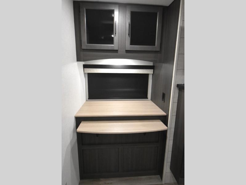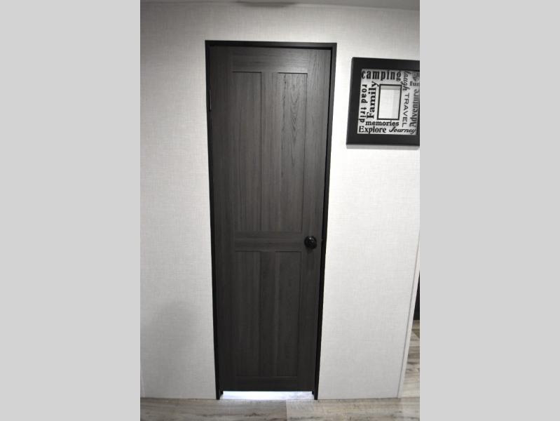 The chef will love the open rear kitchen area of this travel trailer! The 10 cu. ft. 12V refrigerator is big enough to hold your perishables and the flip countertop area is the perfect place for a coffee bar. You can even cook outside with the campfire café that has a refrigerator, a sink, and a griddle to grill some burgers while breathing in fresh air. Just be sure to grab your coat hanging on the coat hooks in the walk-in pantry before heading out the door. A 70" sofa and Sit N' Slide table adds more interior space, as well as comfortable places to eat, relax, and even sleep once converted. Everyone can freshen up in the full bathroom with the 34" radius shower and even have their towel close by thanks to the linen closet next to it!