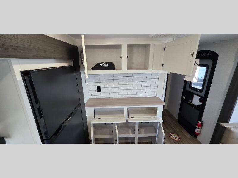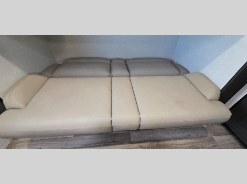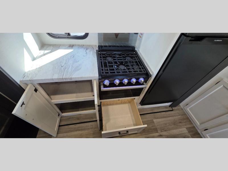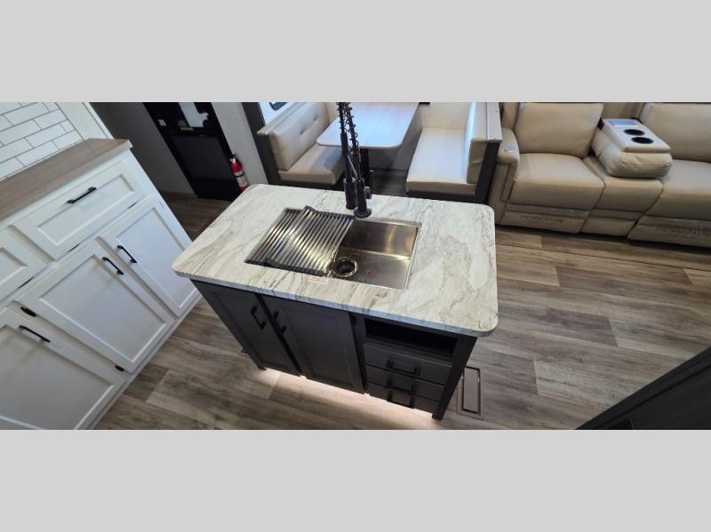 The spacious kitchen island provides ample prep space, making it easy to cook up your favorite meals. Featuring a Furrion oven, three-burner cooktop, and a large stainless steel sink, the kitchen is designed to handle everything from quick snacks to gourmet dinners.