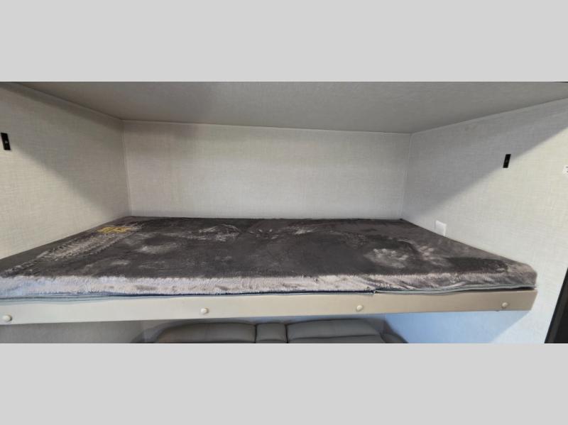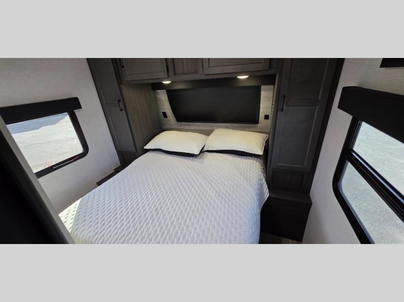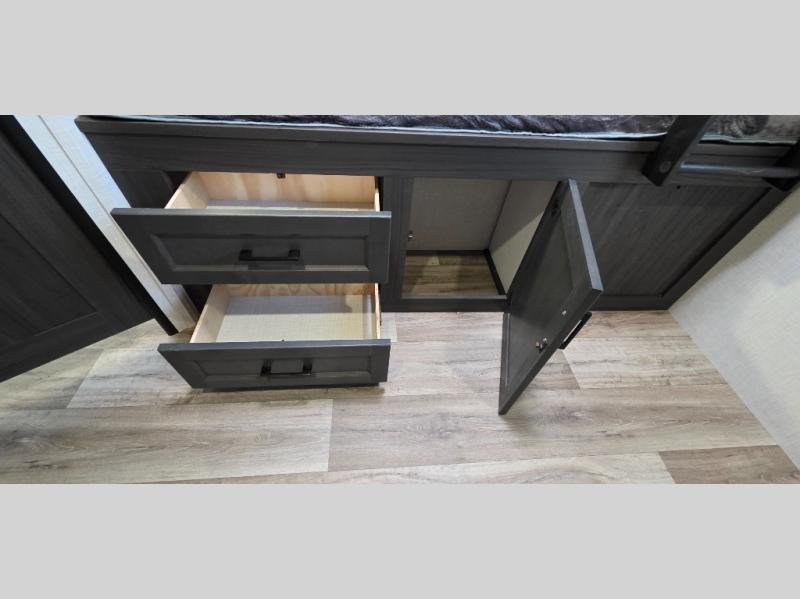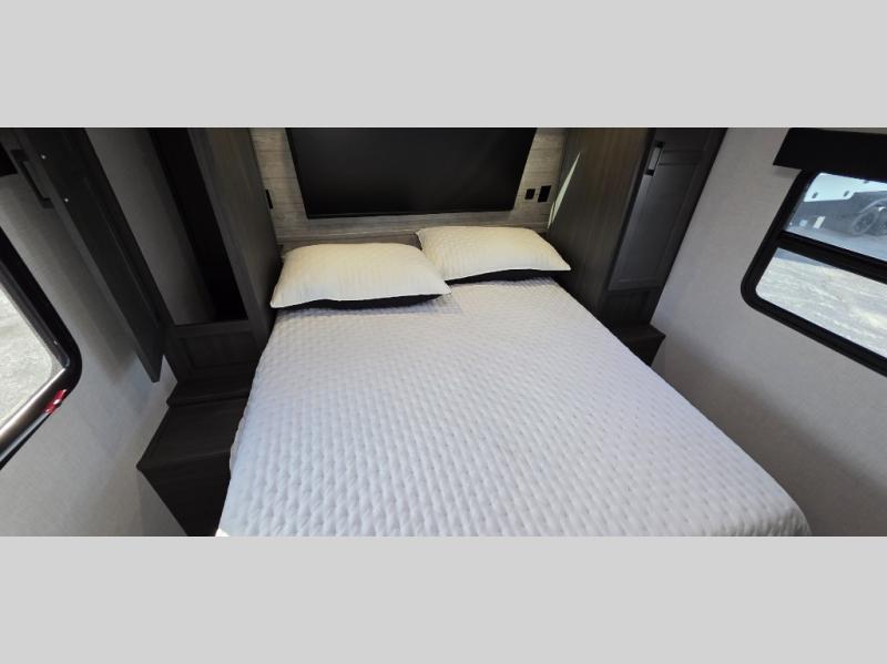 The front private bedroom includes a Serta memory foam mattress, ensuring restful nights under the stars. Plus, enjoy StorMore nightstands and full-length closets for all your personal storage needs.