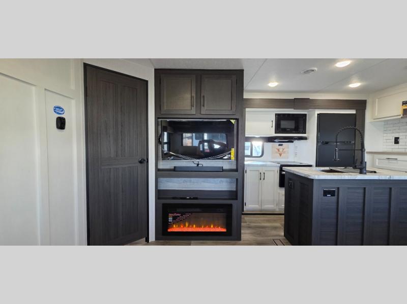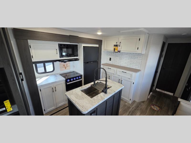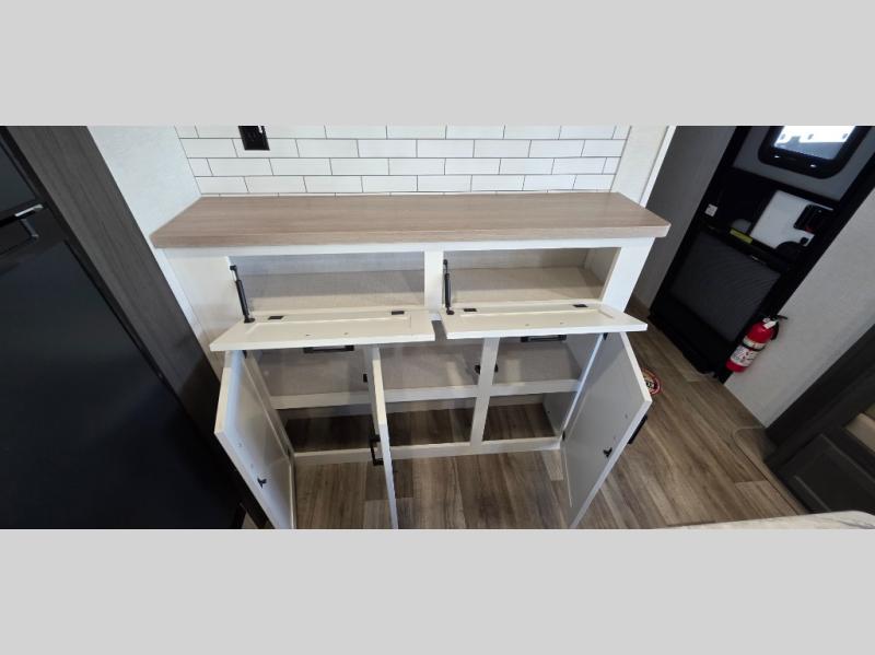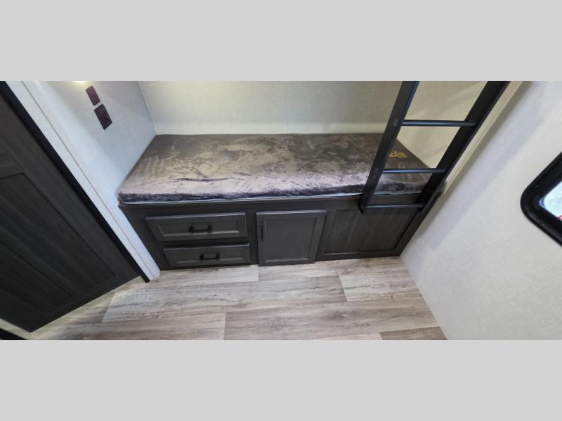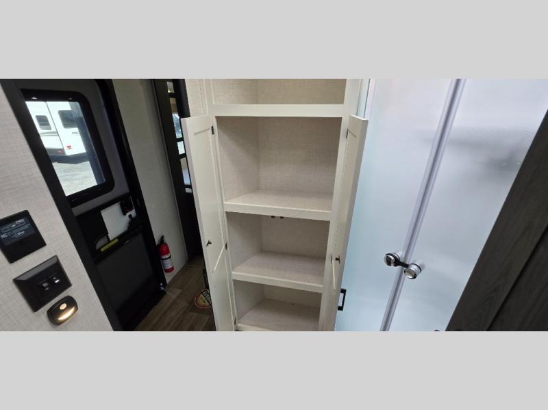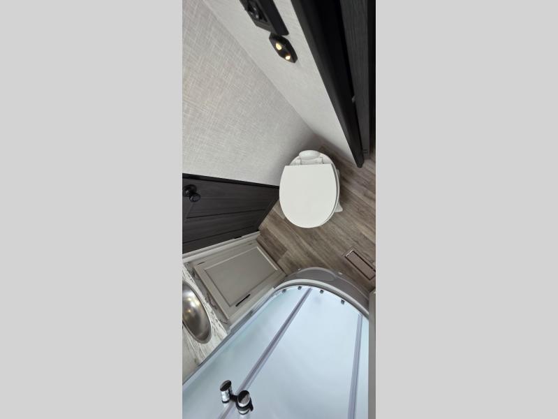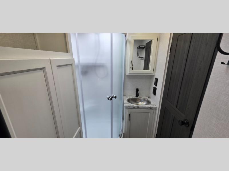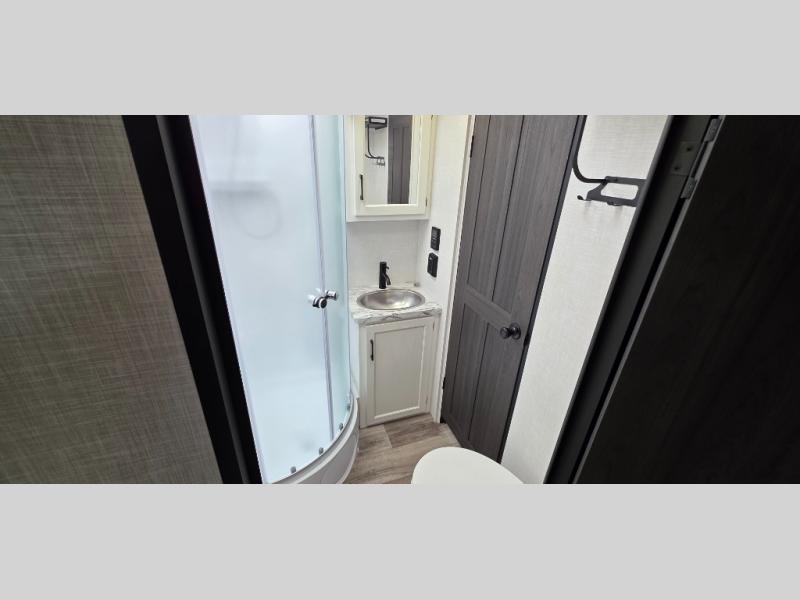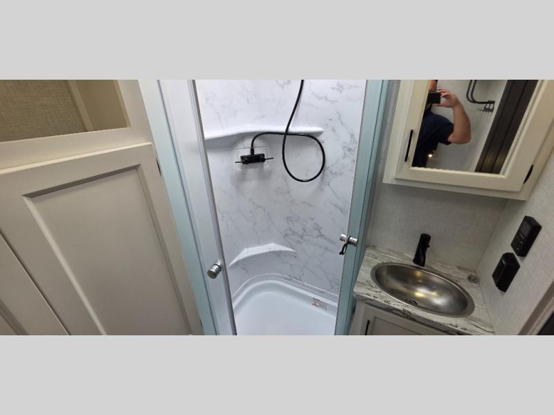 Enjoy the convenience of a dual-entry bathroom, making it easy for everyone to freshen up. The 34" radius shower is perfect for relaxing after a day of exploring, and its accessibility from both the front private bedroom and main living area adds a new level of convenience.