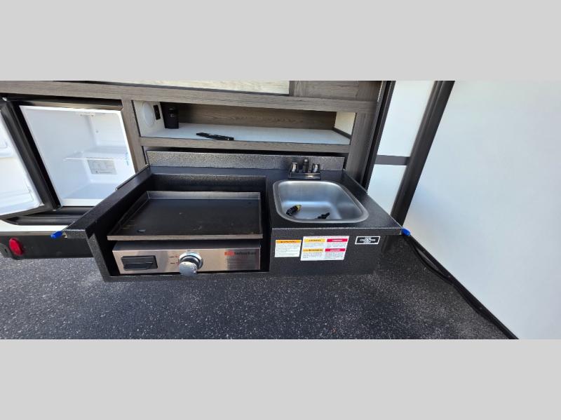 Take your outdoor experience to the next level with the Campfire Café! Equipped with a 40" TV, you can enjoy the big game or your favorite movie while grilling steaks or burgers on the griddle—the ultimate setup for outdoor entertainment!