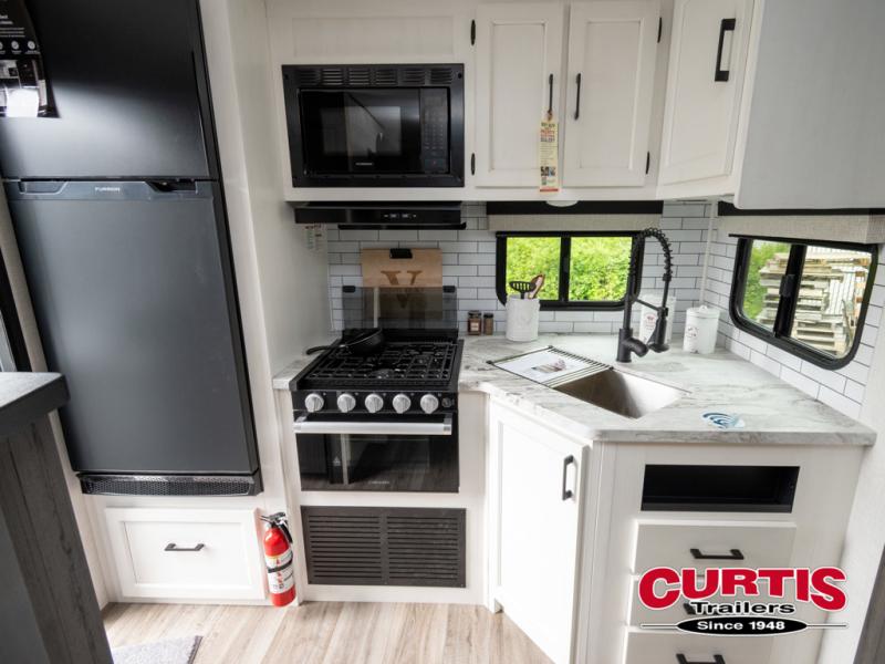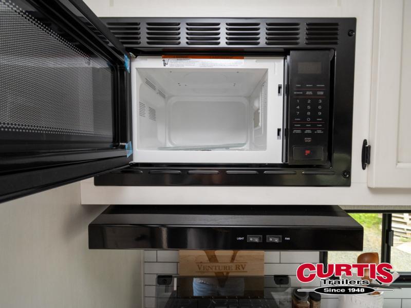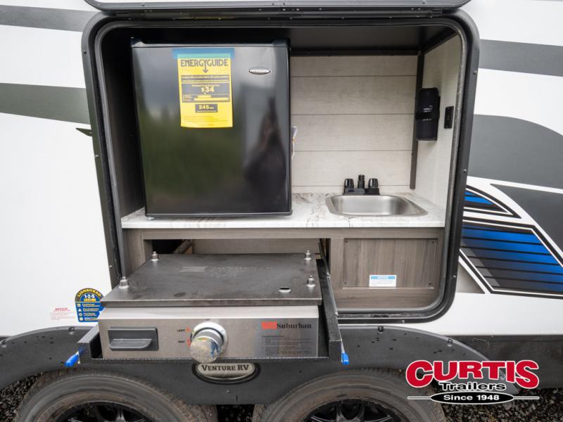 Every Venture RV SportTrek lightweight travel trailer is constructed to offer peace of mind and the comforts of home! Their purposeful residential kitchens are packed with handy features like a Furrion oven and three burner cooktop, a large stainless steel sink with a cover and dish drying rack, plus a 12V refrigerator. You will find plenty of storage throughout, including Safe-Tek hidden storage with a charging center and StorMore nightstands on either side of the bed behind the full-length closets. And the magnetic slam-latch baggage doors and spacious pass-through storage area will hold your outdoor gear in place. They even come with a hot and cold exterior shower and SporTrek's Weather Shield which includes a forced air heated and enclosed underbelly, high output A/C ducting, and more features that will let you extend your camping season. You will also love the new residential upgraded furniture, Serta memory foam mattress, barn style passage doors, and many more comforts!