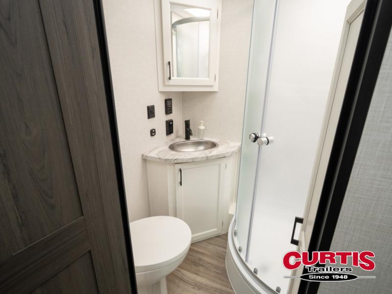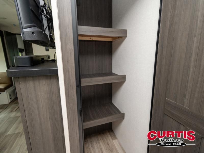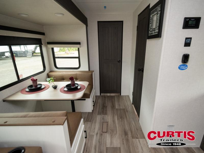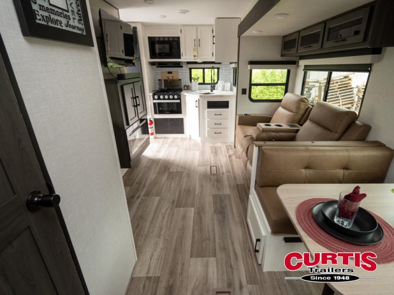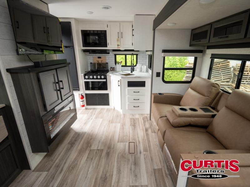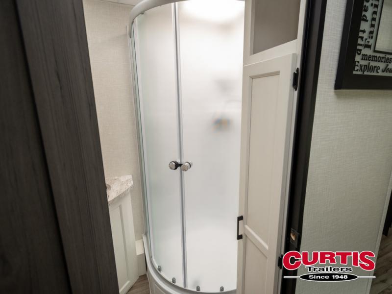 The chef will love the open rear kitchen area of this travel trailer! The 10 cu. ft. 12V refrigerator is big enough to hold your perishables and the flip countertop area is the perfect place for a coffee bar. You can even cook outside with the campfire café that has a refrigerator, a sink, and a griddle to grill some burgers while breathing in fresh air. Just be sure to grab your coat hanging on the coat hooks in the walk-in pantry before heading out the door. A 70" sofa and Sit N' Slide table adds more interior space, as well as comfortable places to eat, relax, and even sleep once converted. Everyone can freshen up in the full bathroom with the 34" radius shower and even have their towel close by thanks to the linen closet next to it!
