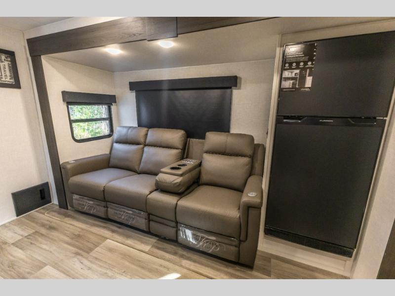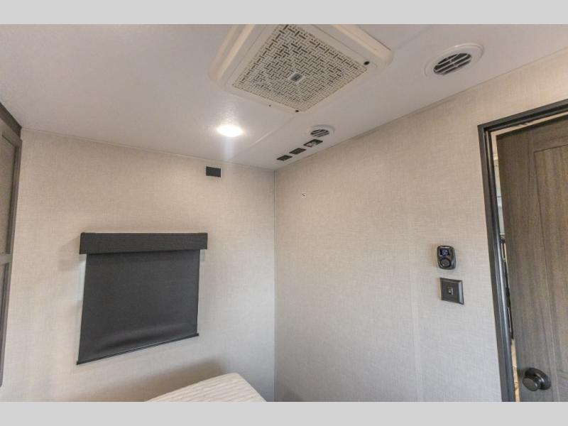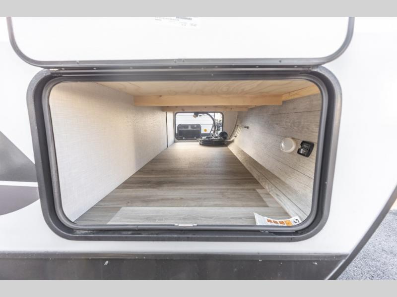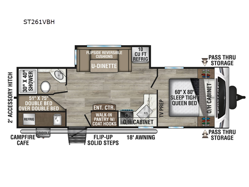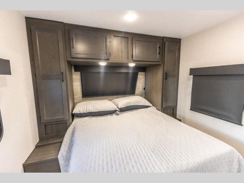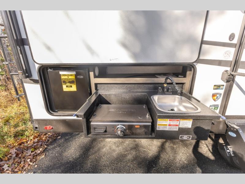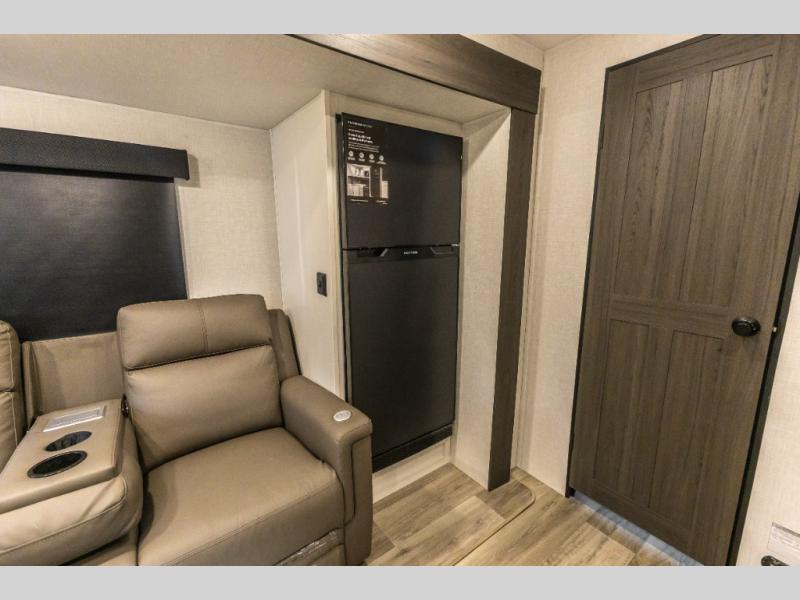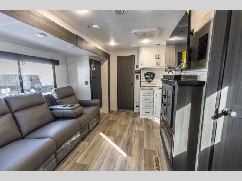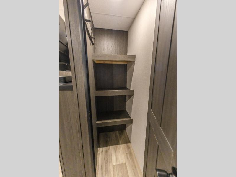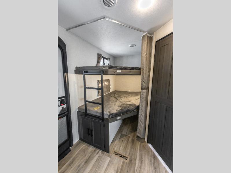 A front private bedroom with a Sleep Tight queen bed is sure to make you feel at home, while your guests take the double-size bunks in the back. There is a full bath right next to the bunks for easy nighttime use, and any other guests can sleep on the U-shaped dinette with flipside reversible cushions. There is plenty of storage space, including a walk-in pantry with coat hooks, dual bedside closets to keep clothes wrinkle-free, and an exterior pass-thru storage for camp gear! A full kitchen inside will let you cook in comfort when the weather isn't cooperating, and an exterior campfire cafe includes an outdoor refrigerator, sink, and griddle for a sunrise breakfast!