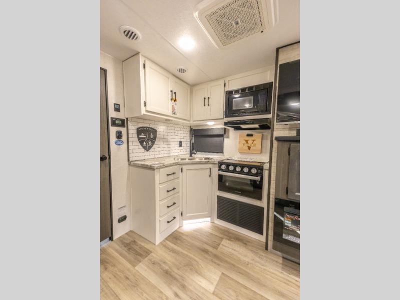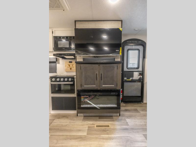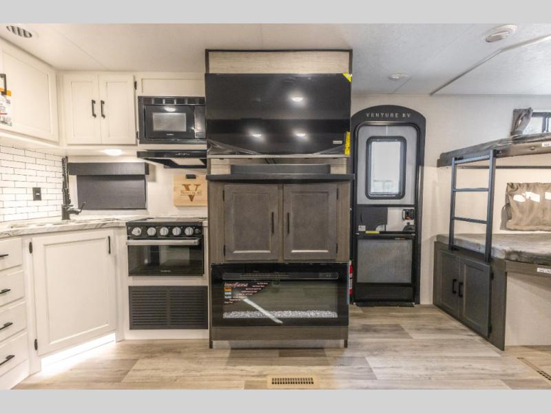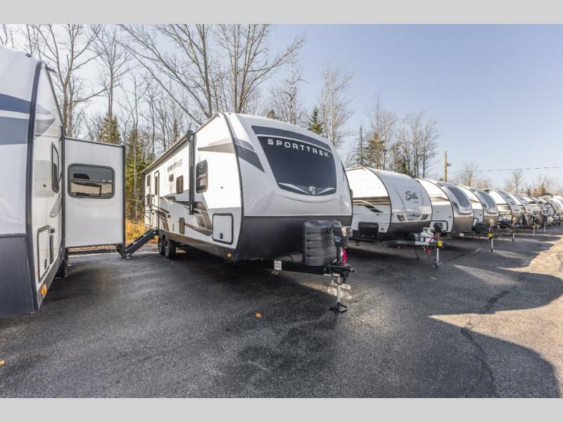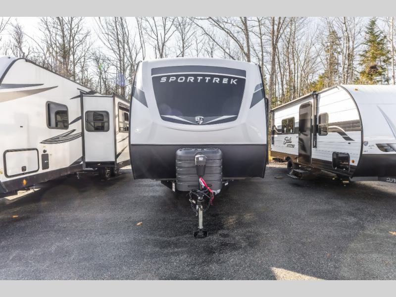 Every Venture RV SportTrek lightweight travel trailer is constructed to offer peace of mind and the comforts of home! Their purposeful residential kitchens are packed with handy features like a Furrion oven and three burner cooktop, a large stainless steel sink with a cover and dish drying rack, plus a 12V refrigerator. You will find plenty of storage throughout, including Safe-Tek hidden storage with a charging center and StorMore nightstands on either side of the bed behind the full-length closets. And the magnetic slam-latch baggage doors and spacious pass-through storage area will hold your outdoor gear in place. They even come with a hot and cold exterior shower and SporTrek's Weather Shield which includes a forced air heated and enclosed underbelly, high output A/C ducting, and more features that will let you extend your camping season. You will also love the new residential upgraded furniture, Serta memory foam mattress, barn style passage doors, and many more comforts!