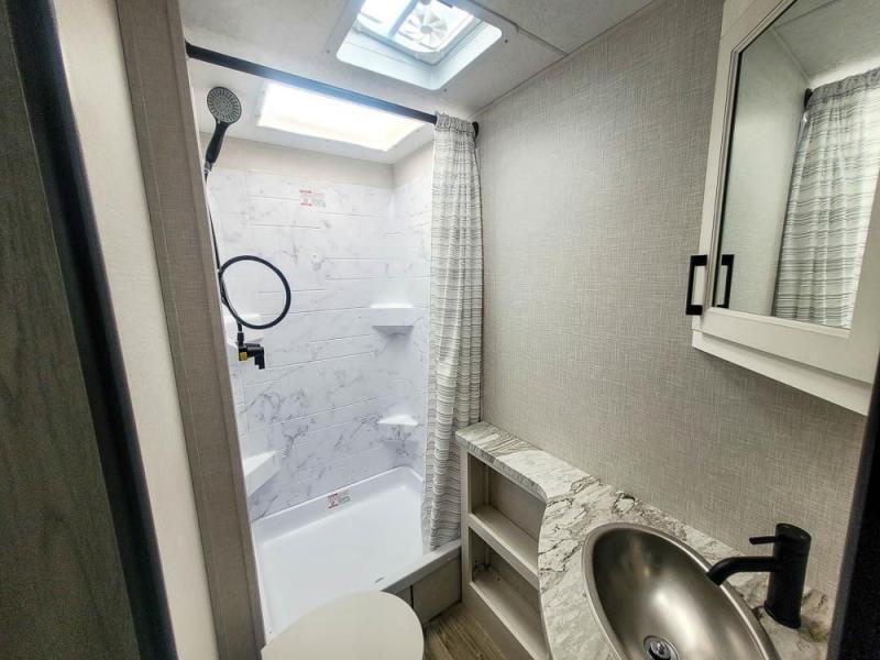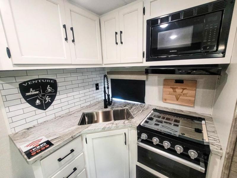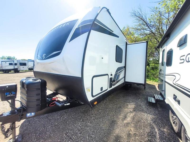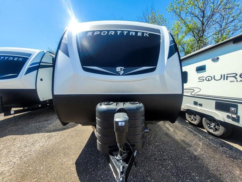 Every Venture RV SportTrek lightweight travel trailer is constructed to offer peace of mind and the comforts of home! Their purposeful residential kitchens are packed with handy features like a Furrion oven and three burner cooktop, a large stainless steel sink with a cover and dish drying rack, plus a 12V refrigerator. You will find plenty of storage throughout, including Safe-Tek hidden storage with a charging center and StorMore nightstands on either side of the bed behind the full-length closets. And the magnetic slam-latch baggage doors and spacious pass-through storage area will hold your outdoor gear in place. They even come with a hot and cold exterior shower and SporTrek's Weather Shield which includes a forced air heated and enclosed underbelly, high output A/C ducting, and more features that will let you extend your camping season. You will also love the new residential upgraded furniture, Serta memory foam mattress, barn style passage doors, and many more comforts!