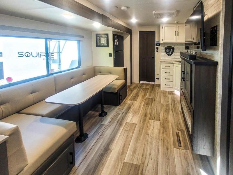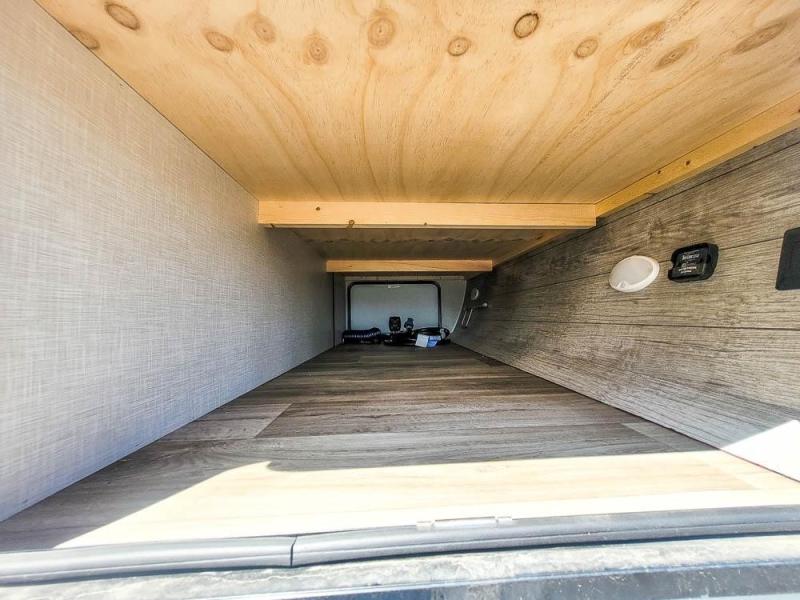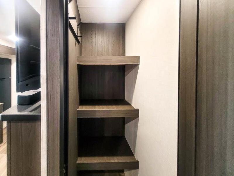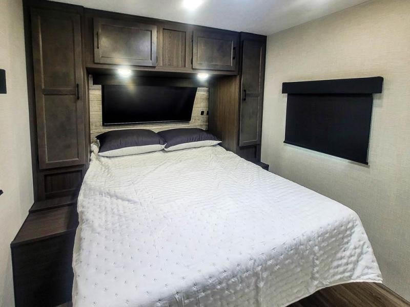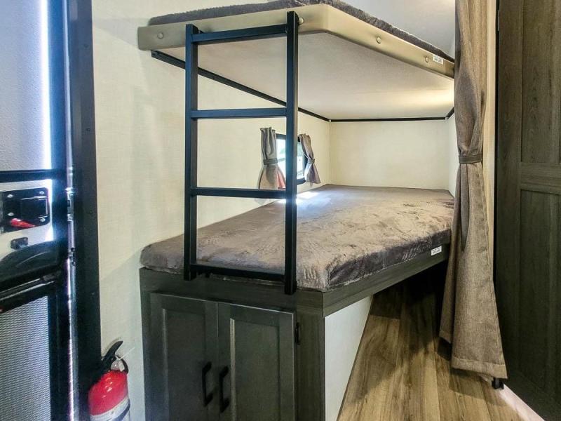 A front private bedroom with a Sleep Tight queen bed is sure to make you feel at home, while your guests take the double-size bunks in the back. There is a full bath right next to the bunks for easy nighttime use, and any other guests can sleep on the U-shaped dinette with flipside reversible cushions. There is plenty of storage space, including a walk-in pantry with coat hooks, dual bedside closets to keep clothes wrinkle-free, and an exterior pass-thru storage for camp gear! A full kitchen inside will let you cook in comfort when the weather isn't cooperating, and an exterior campfire cafe includes an outdoor refrigerator, sink, and griddle for a sunrise breakfast!