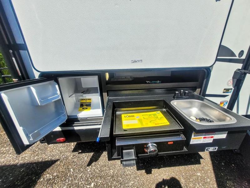 Cook inside or out with the Campfire Cafe featuring a griddle, sink, and outdoor fridge for easy mornings.