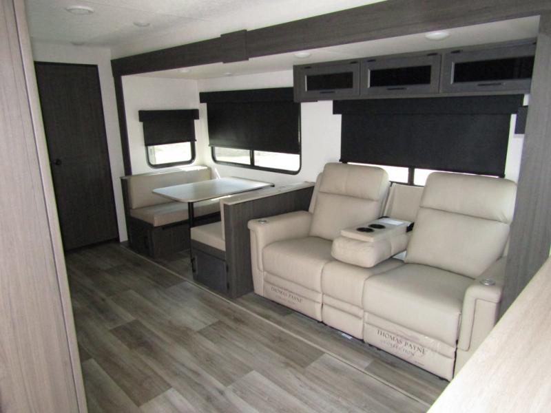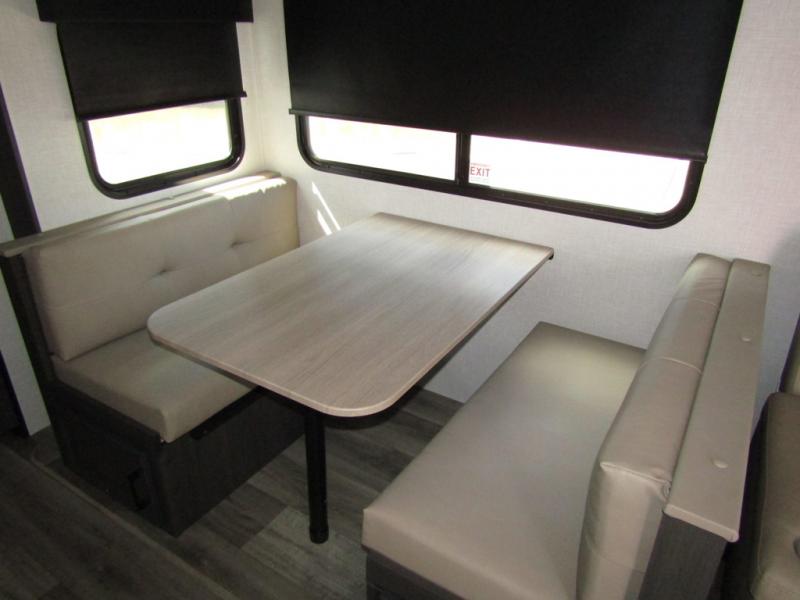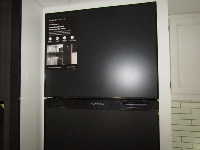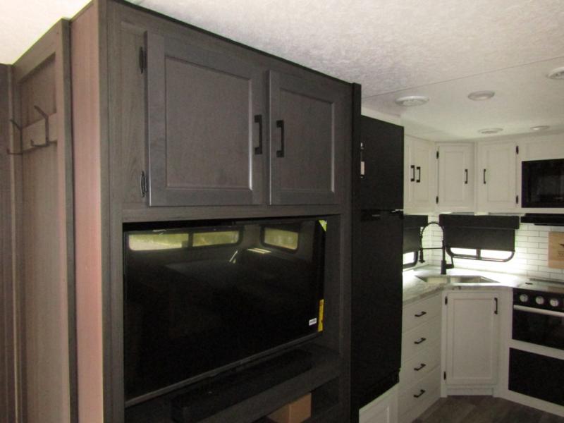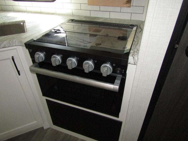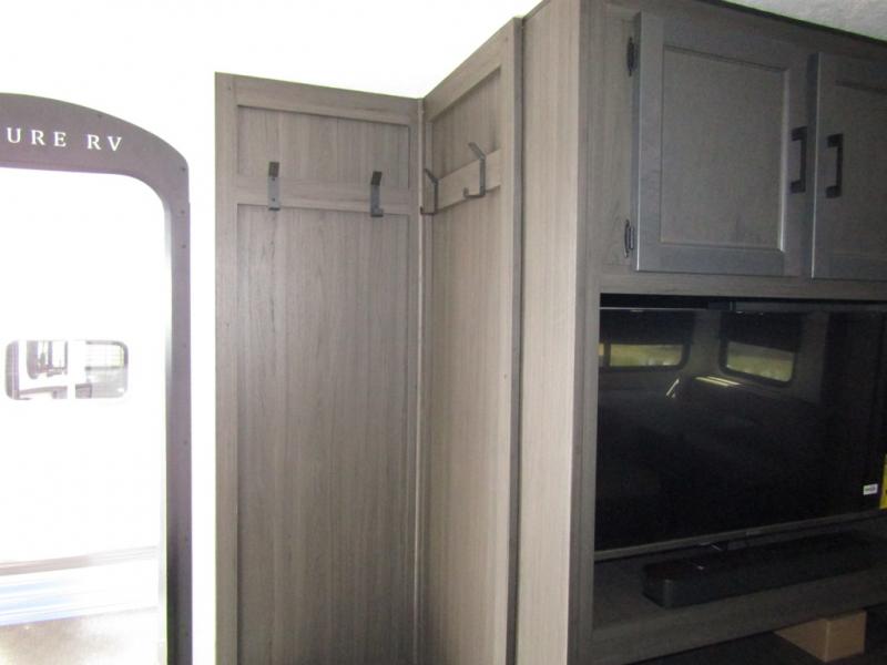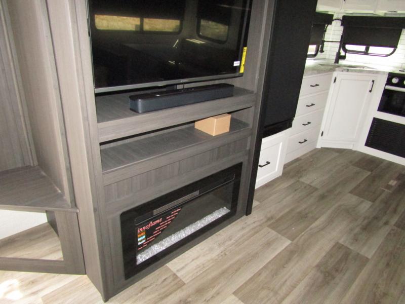 A rear kitchen makes it easy to prepare meals in this travel trailer! The kitchen has a three burner cooktop with a Furrion oven, a 10 cu. ft. 12V refrigerator to keep your perishables fresh, overhead cabinets keep cooking essentials nearby, and a walk-in pantry big enough for all of your snacks and canned goods, plus a hutch for your dishes. You could even prepare meals outside with the campfire café which has a sink, a refrigerator, and a griddle. The bench seat gives you a spot to sit while you put on your shoes and the coat hooks above makes it easy to grab and go. Enjoy your meals and card games at the 42" booth dinette and relax on the 70" sofa across from the entertainment center with a 40" TV on a swing arm and a frameless electric fireplace. The front private bedroom has a Sleep Tight queen bed to lay your head on at night and a closet with drawers to keep your clothes looking their best!