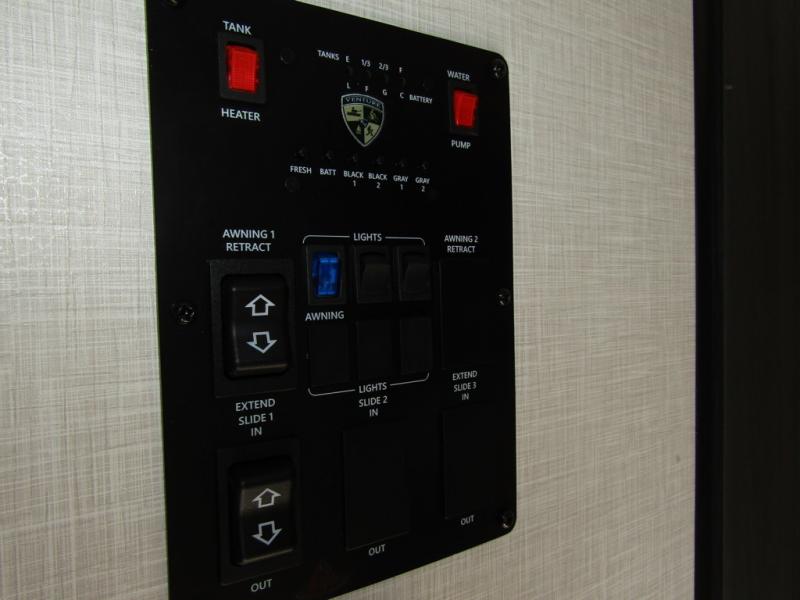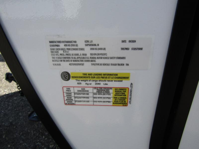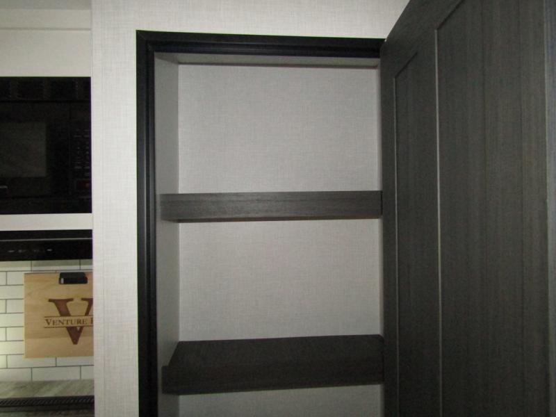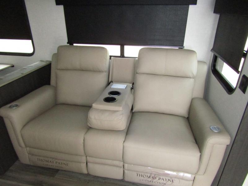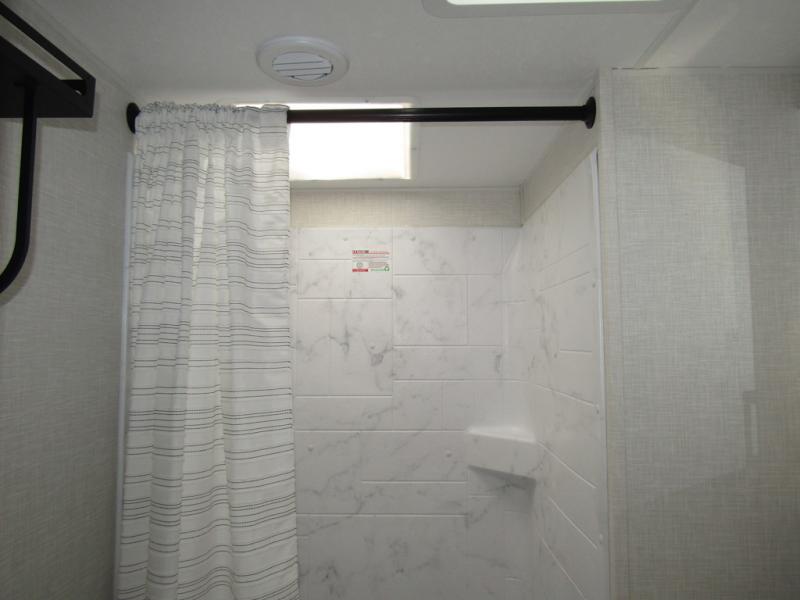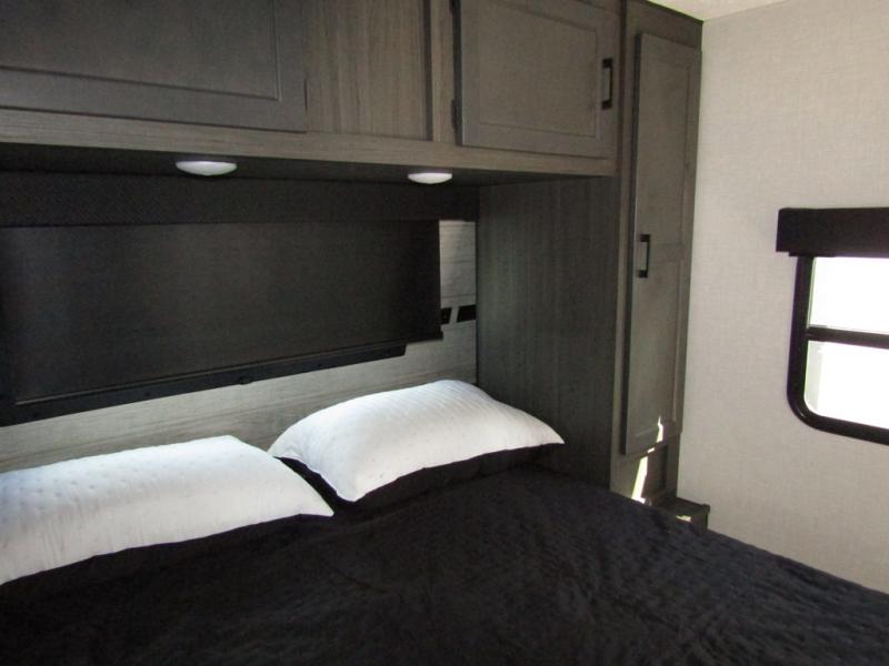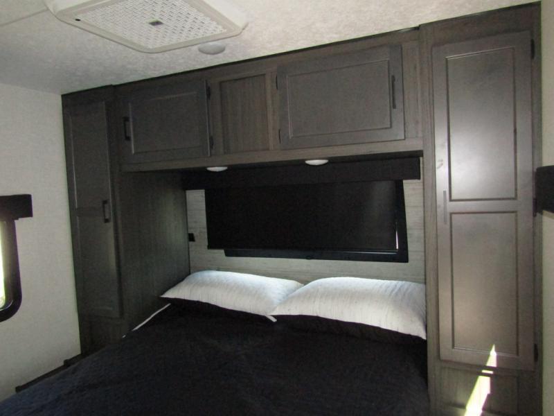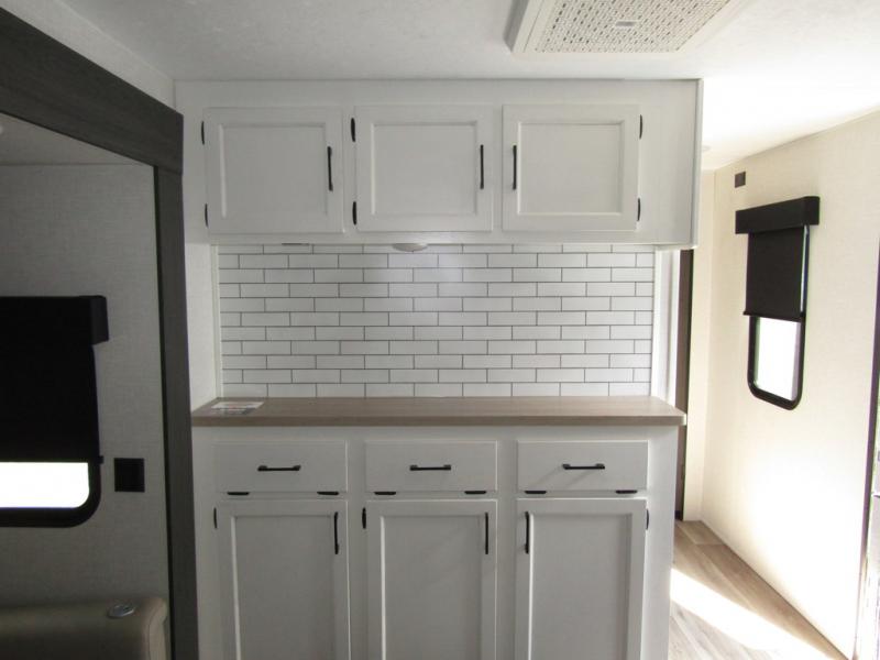 A rear kitchen makes it easy to prepare meals in this travel trailer! The kitchen has a three burner cooktop with a Furrion oven, a 10 cu. ft. 12V refrigerator to keep your perishables fresh, overhead cabinets keep cooking essentials nearby, and a walk-in pantry big enough for all of your snacks and canned goods, plus a hutch for your dishes. You could even prepare meals outside with the campfire café which has a sink, a refrigerator, and a griddle. The bench seat gives you a spot to sit while you put on your shoes and the coat hooks above makes it easy to grab and go. Enjoy your meals and card games at the 42" booth dinette and relax on the 70" sofa across from the entertainment center with a 40" TV on a swing arm and a frameless electric fireplace. The front private bedroom has a Sleep Tight queen bed to lay your head on at night and a closet with drawers to keep your clothes looking their best!